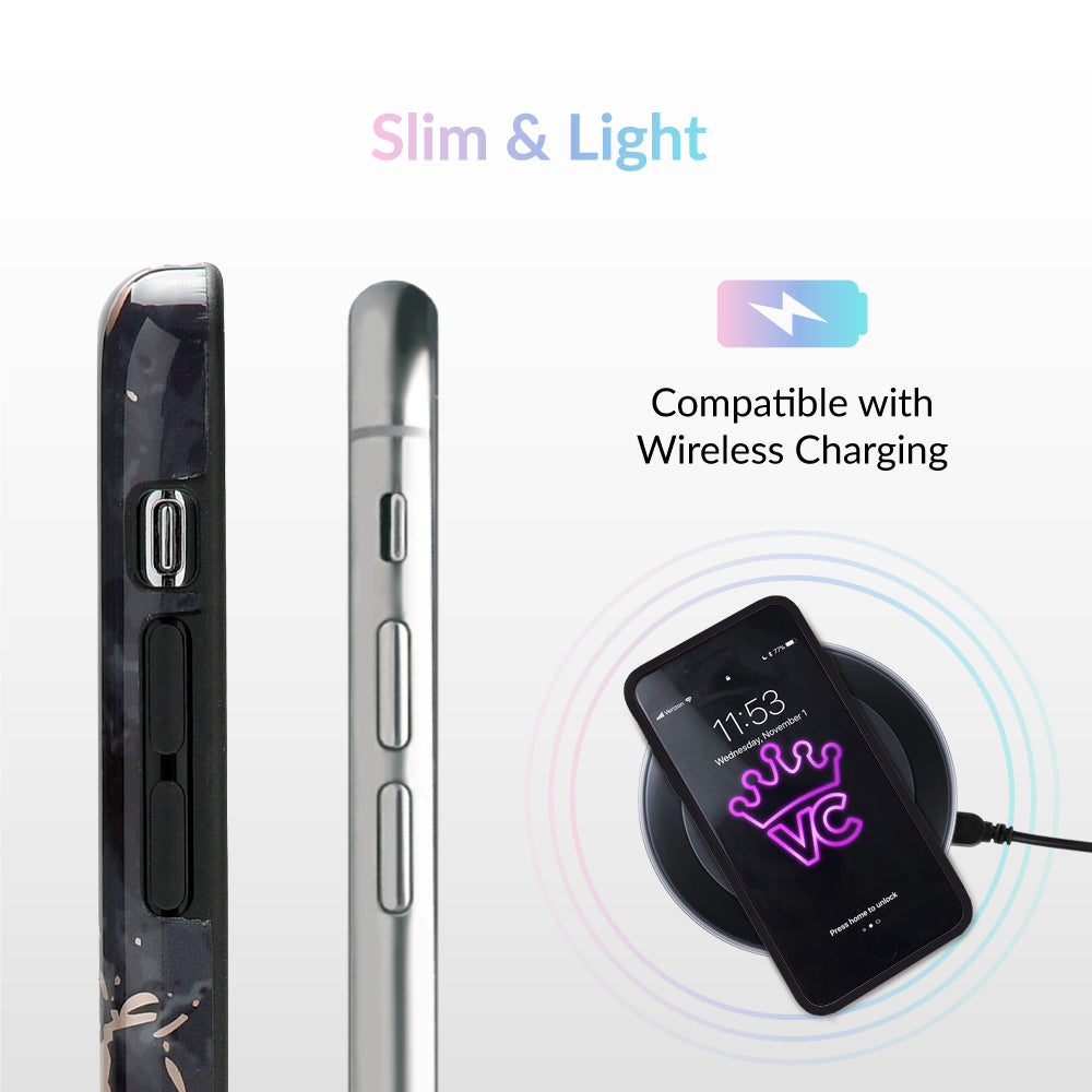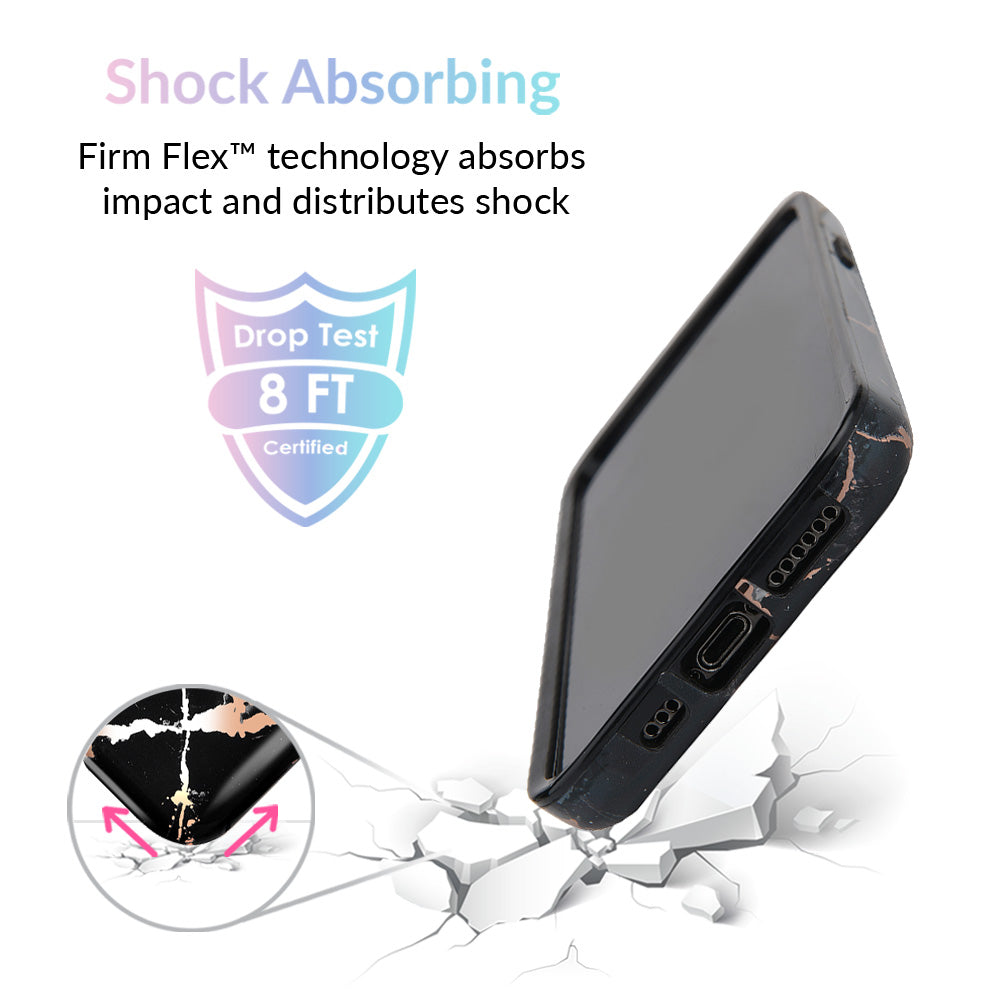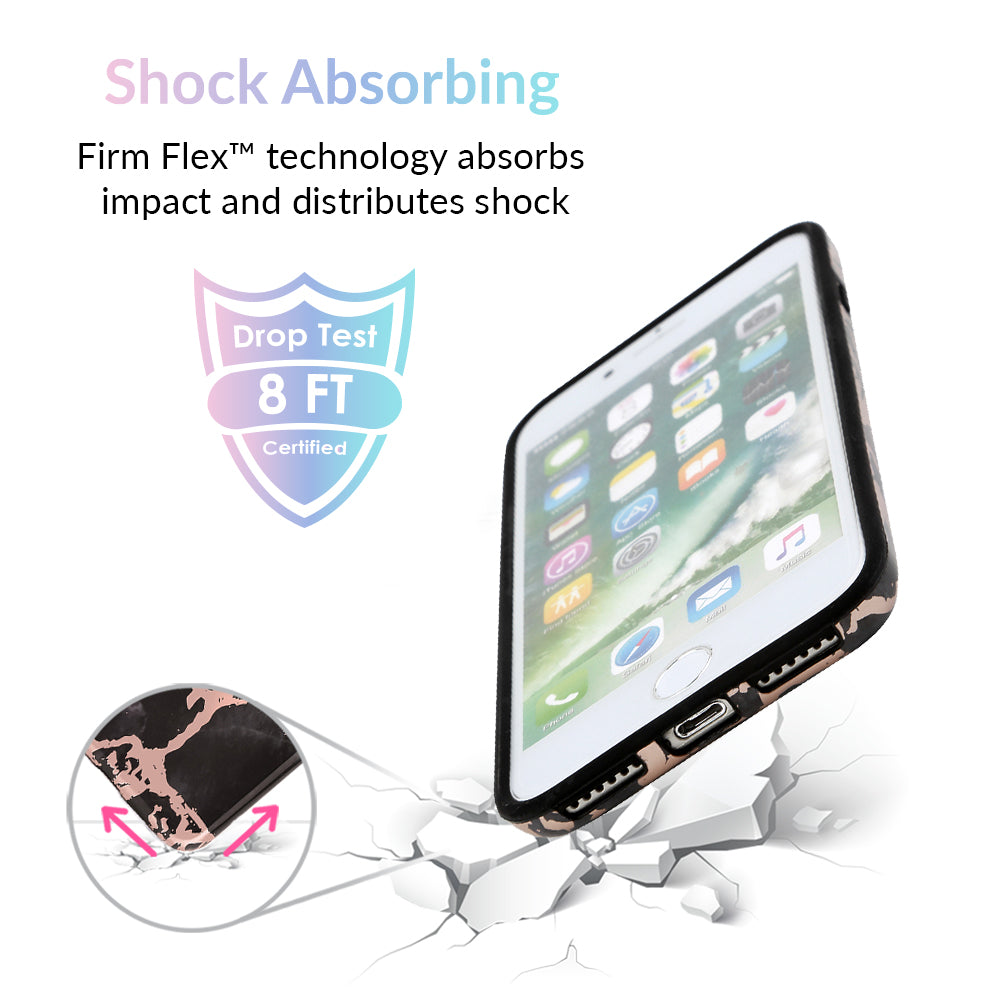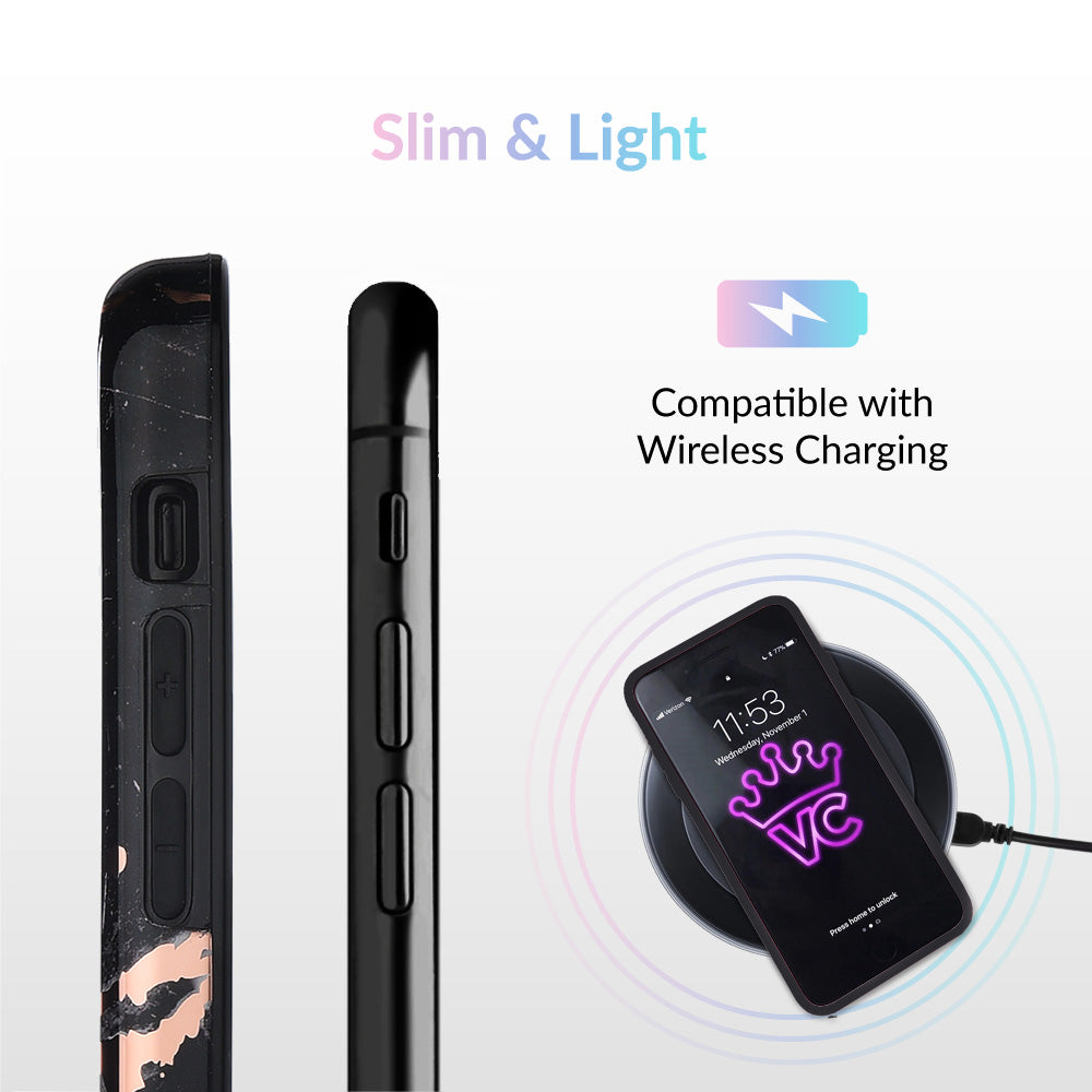 This protective case features a black marble pattern inlaid with shiny, metallic rose gold cracks. It comes in a glossy finish and has a matching black bumper for added protection against drops!