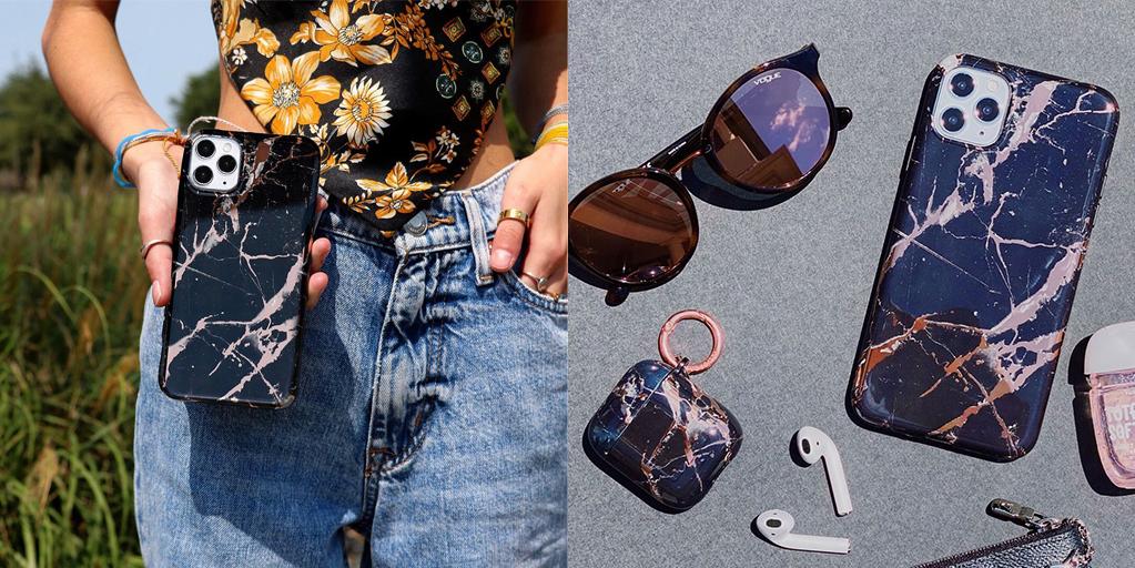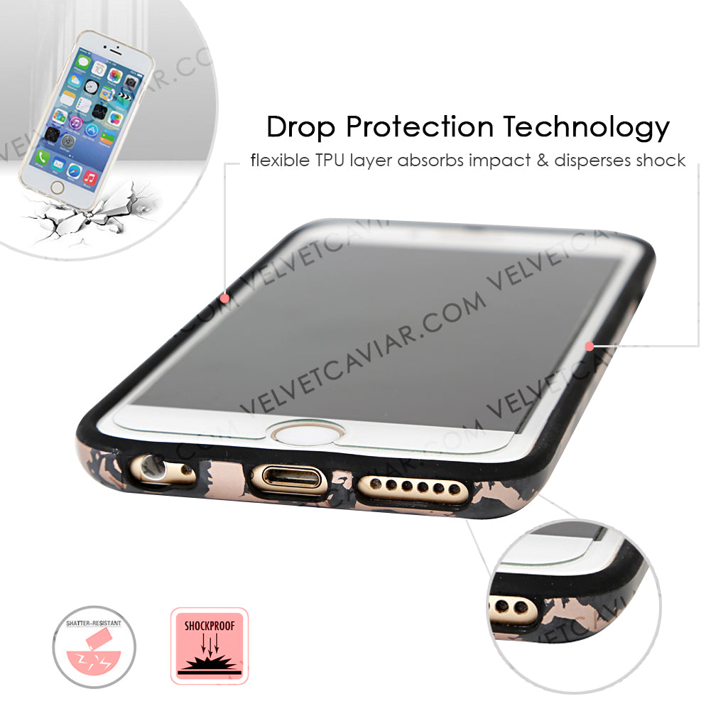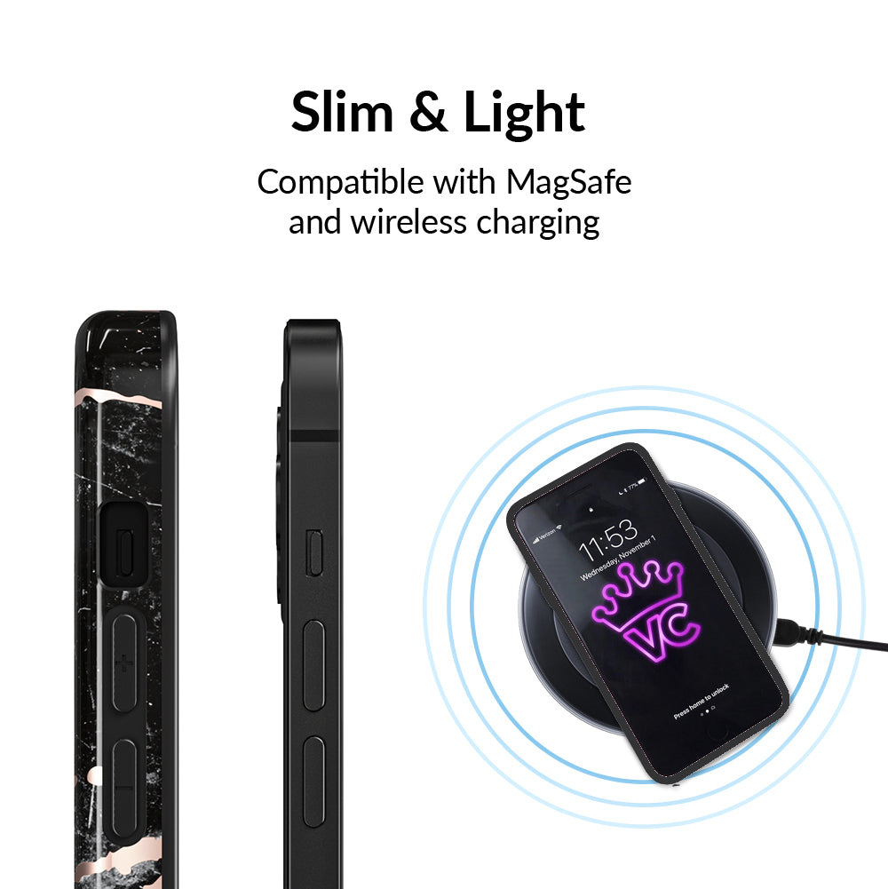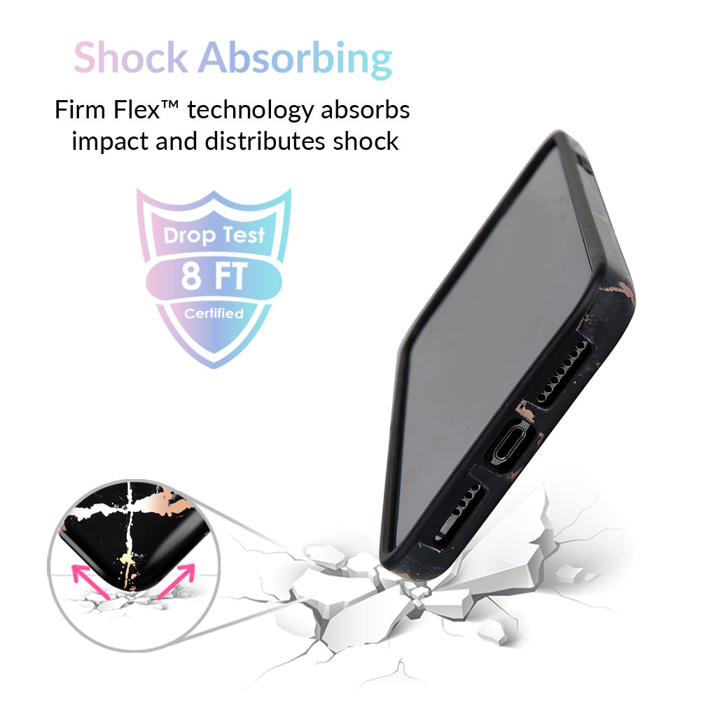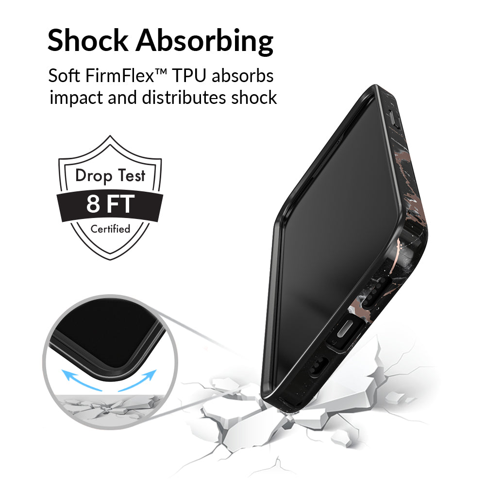 This protective case features a black marble pattern inlaid with shiny, metallic rose gold cracks. It comes in a glossy finish and has a matching black bumper for added protection against drops!