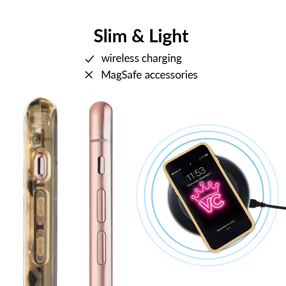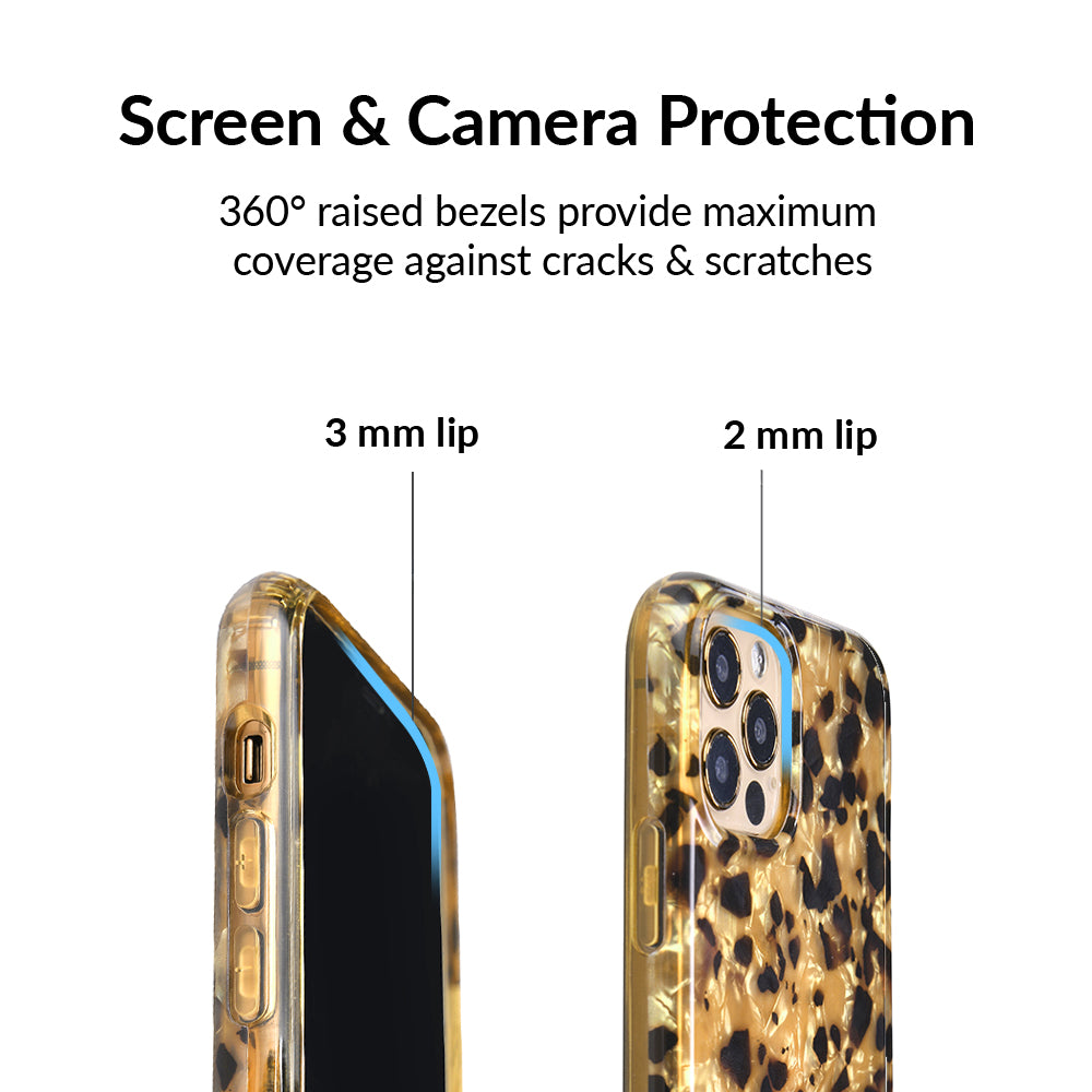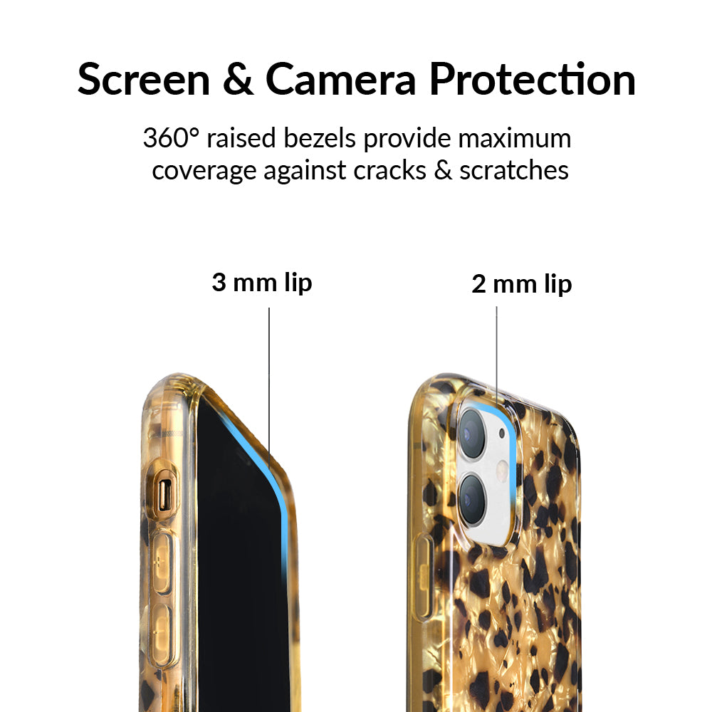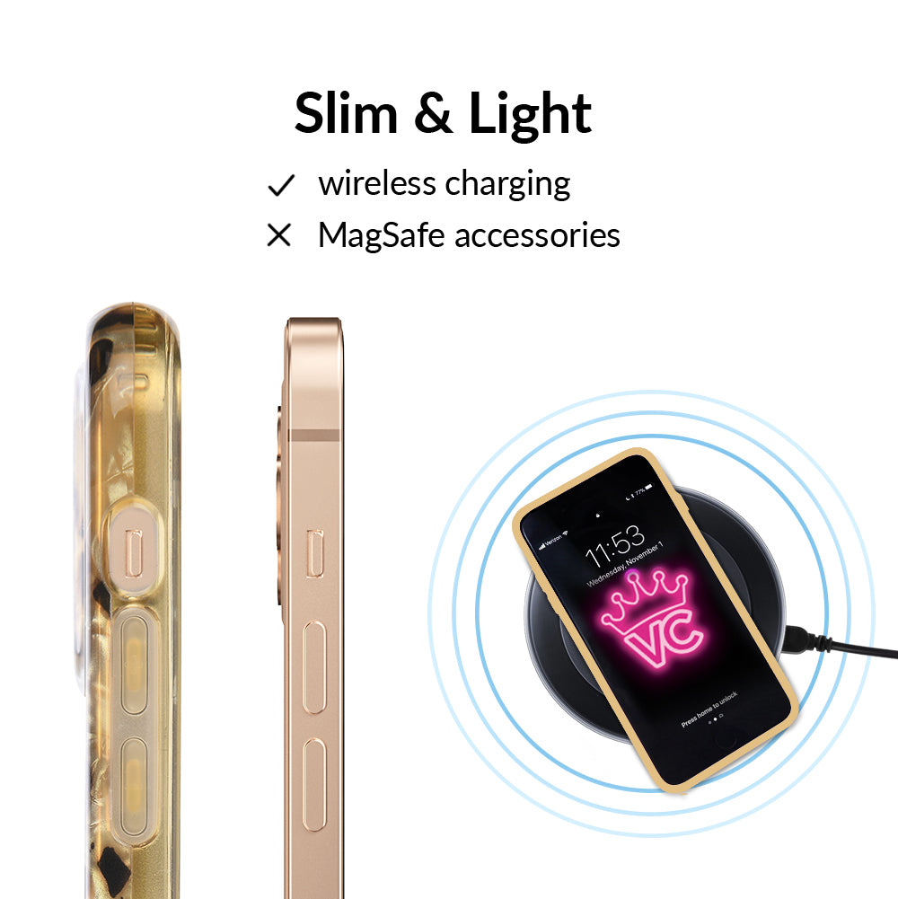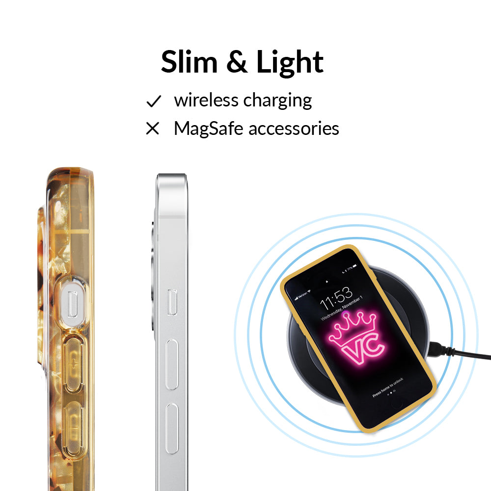 A fierce classic that will never go out of style! This protective clear case features a stunning multi-faceted blonde tort base with chocolate brown spots. This style does not feature an interior velvet lining or a built in MagSafe ring. Available with matching grip rings and AirPod cases!