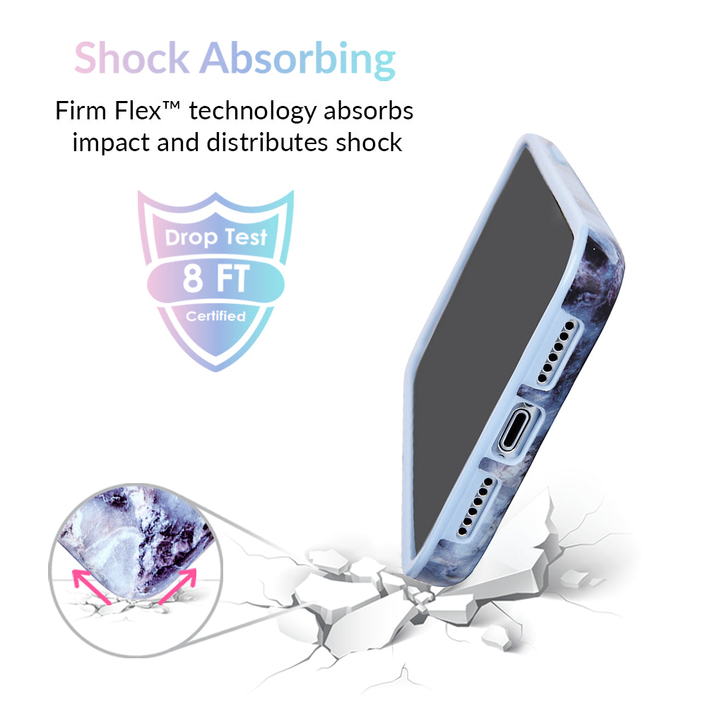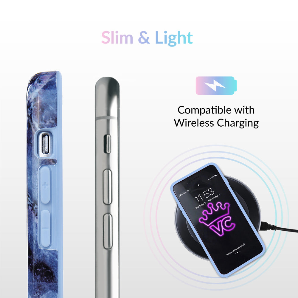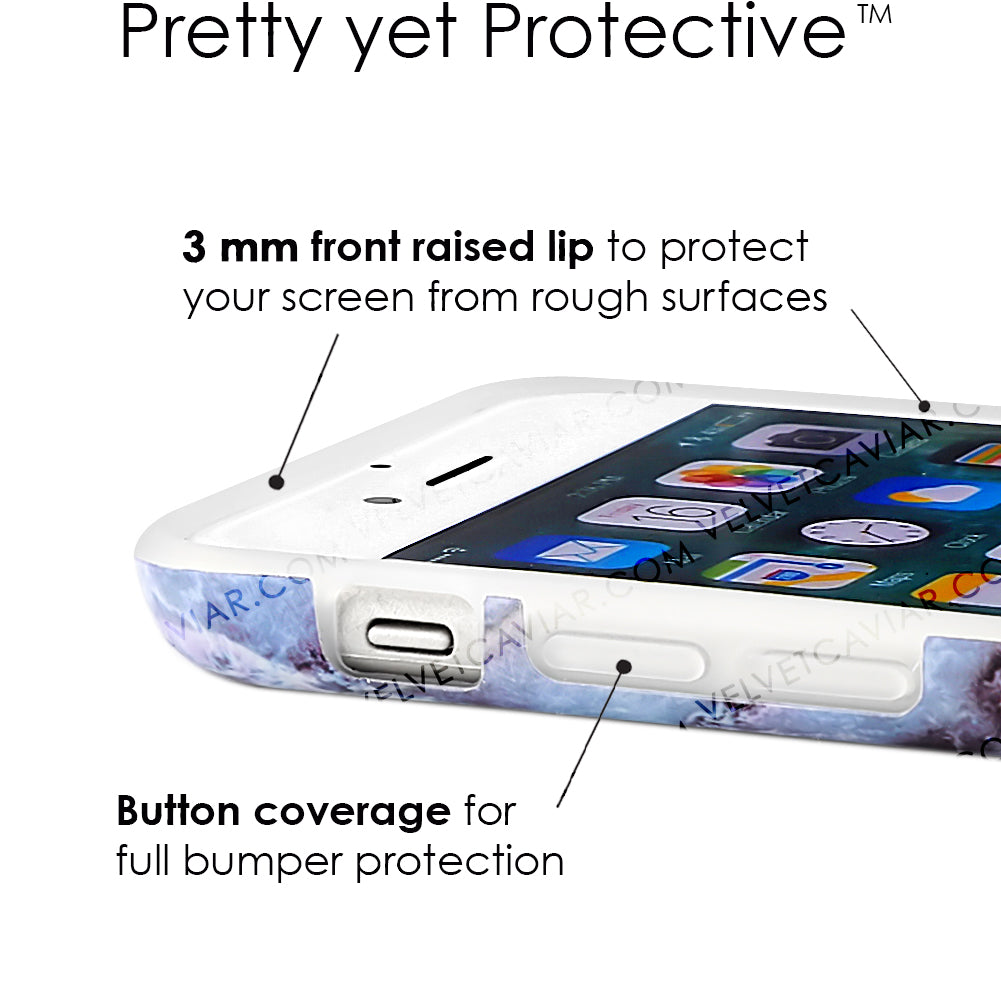 This stunning, protecive marble case features a blue base with varying white and black cracks in a gloss finish. It also has a matching blue bumper for added protection against drops!