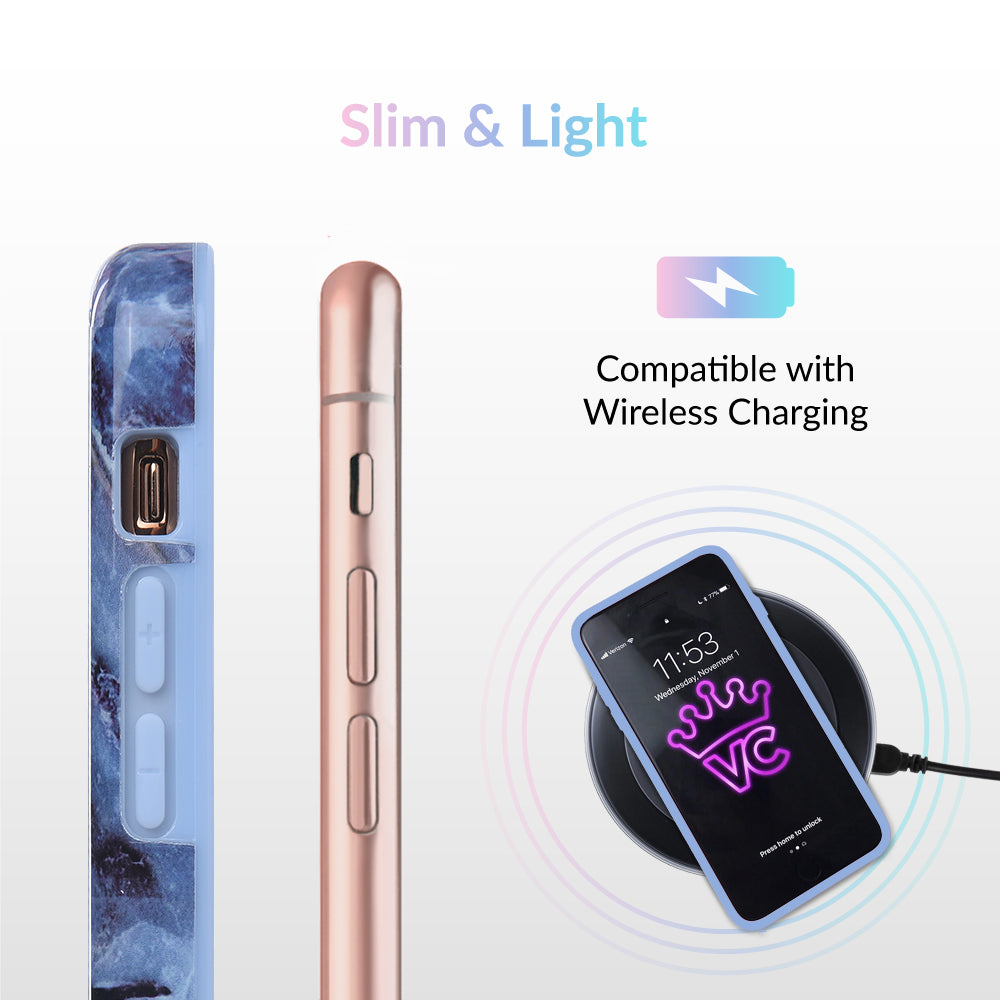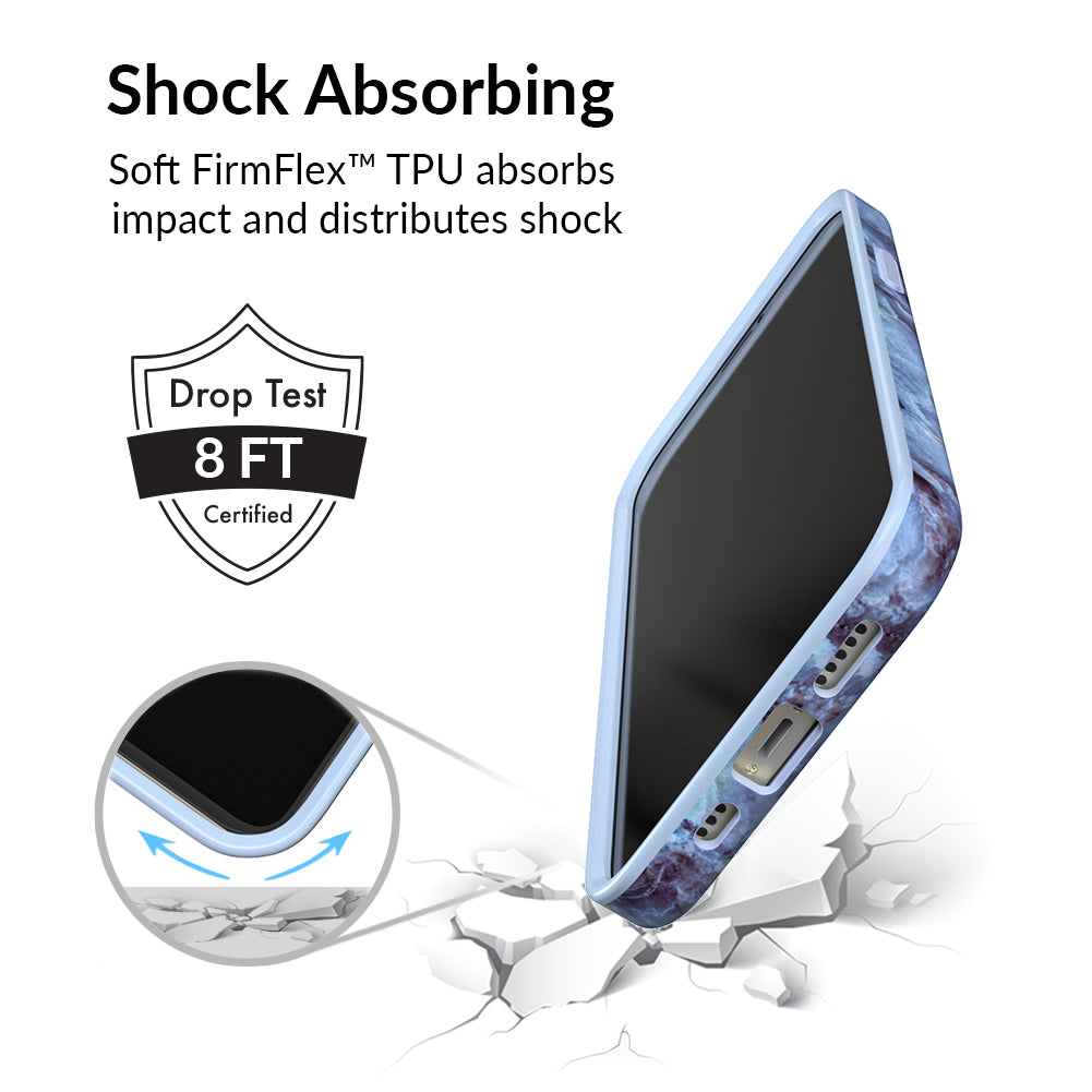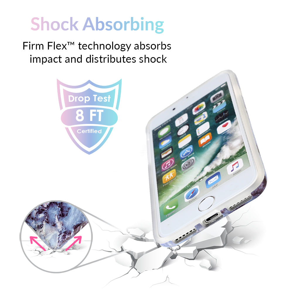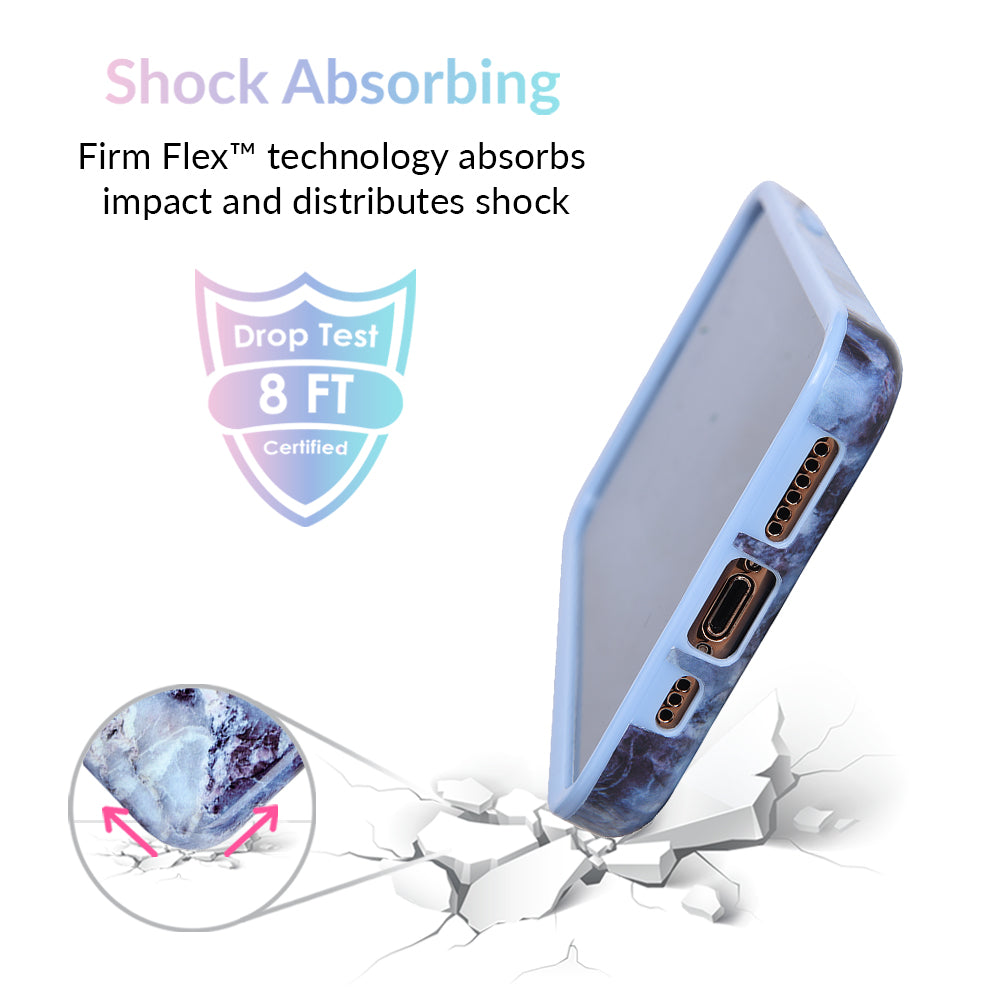 This stunning, protecive marble case features a blue base with varying white and black cracks in a gloss finish. It also has a matching blue bumper for added protection against drops!