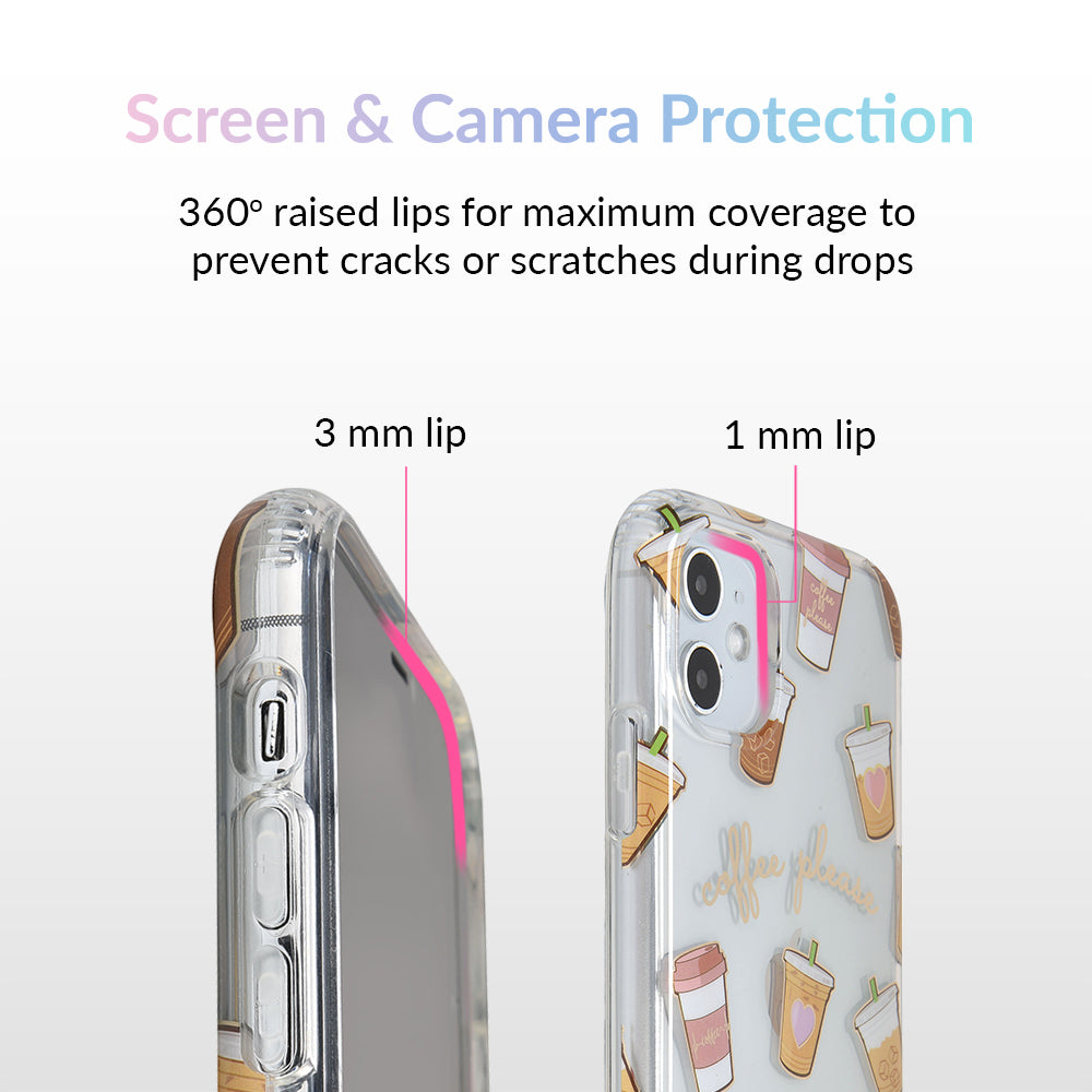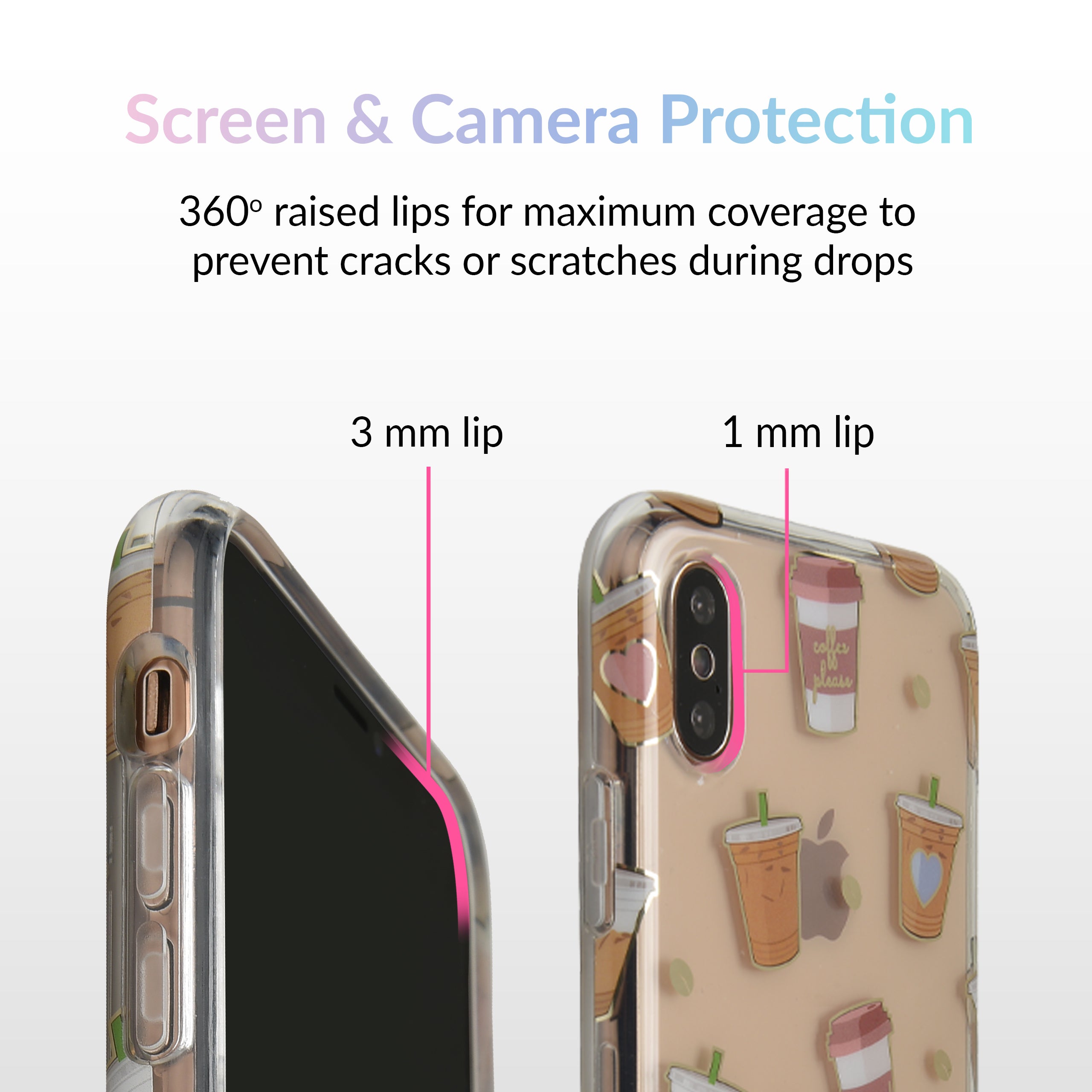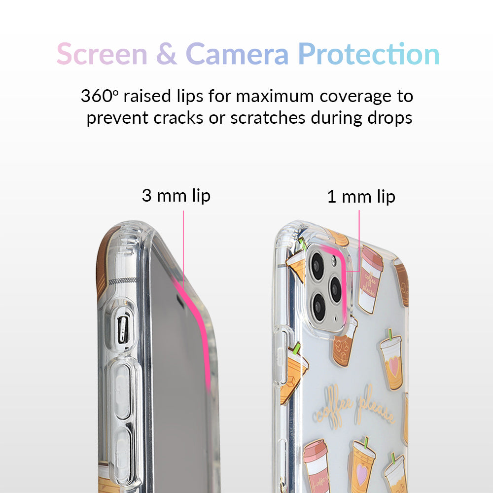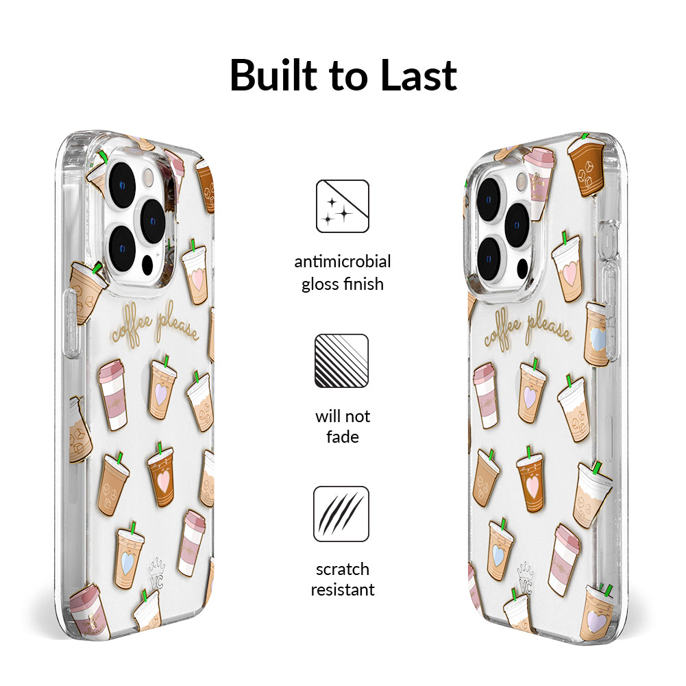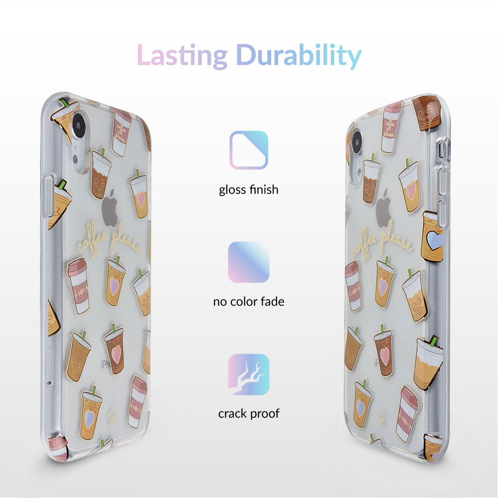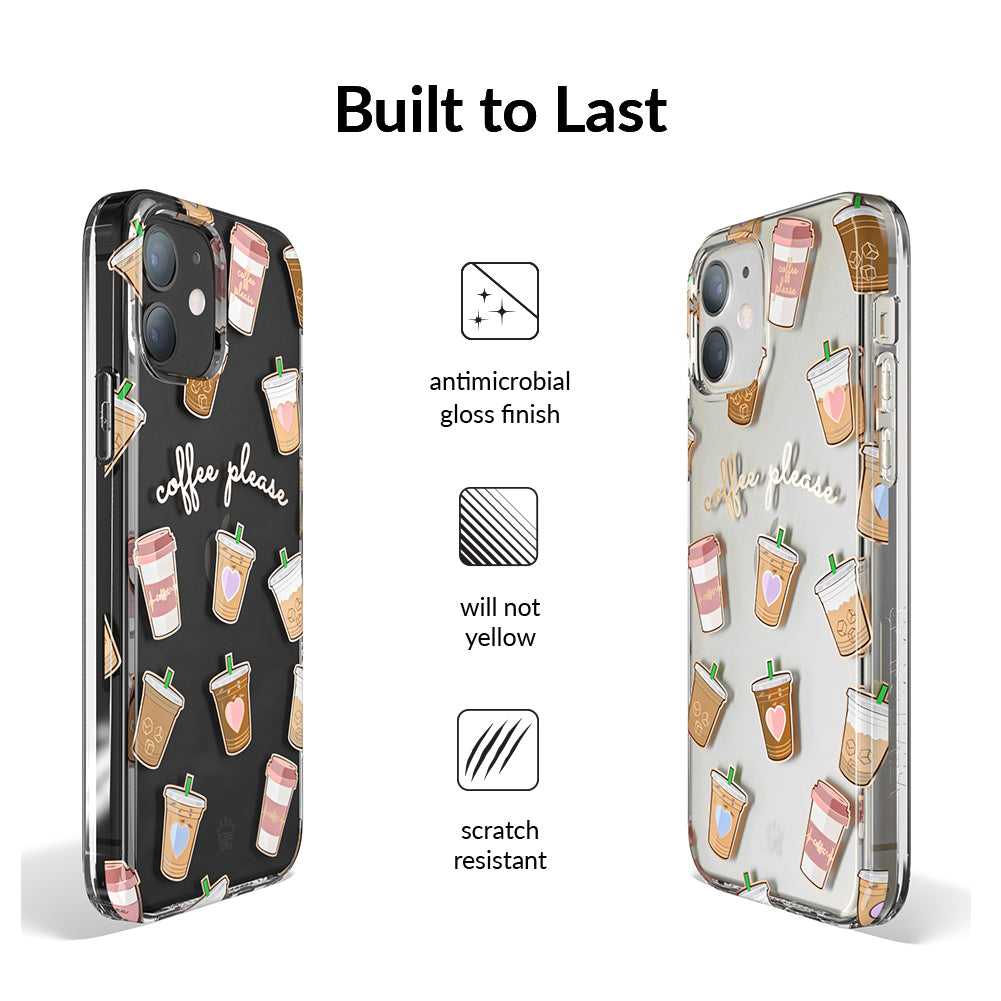 Mondays can’t bring you down when you’ve got cups of coffee! This protective, clear case has a super cute coffee pattern featuring iced coffee, to-go cups, and coffee beans! It comes in a gloss finish, gold chrome outlines, and a matching clear bumper for added protection against drops.
