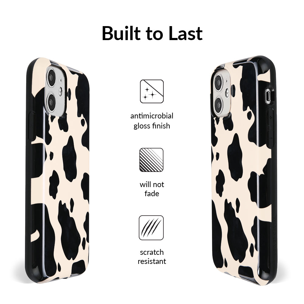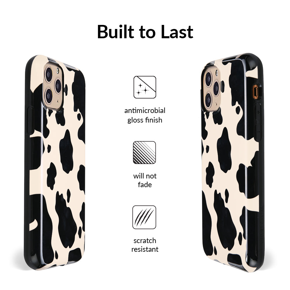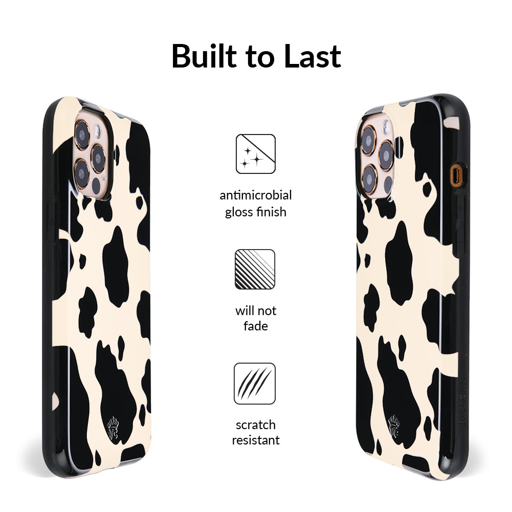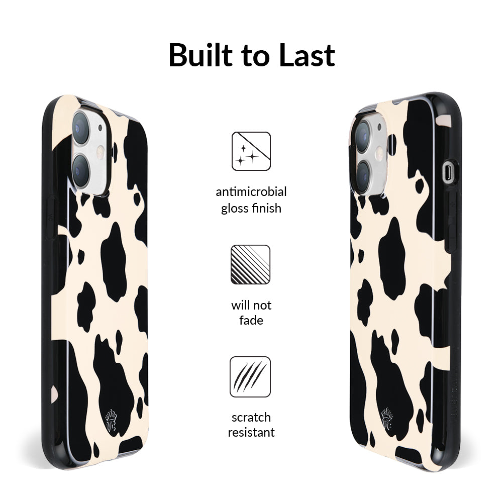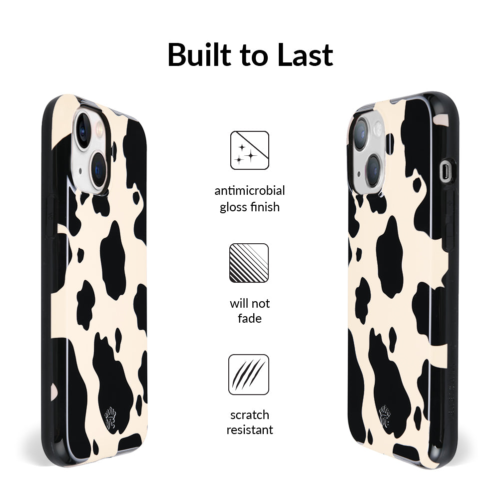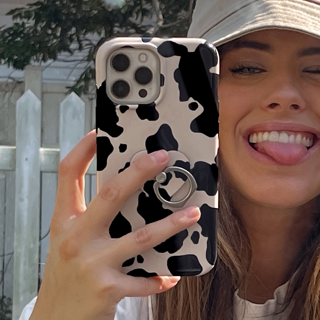 Inspired by our love for animal prints, this protective case features a matte beige base with gloss cow print spots. This style does not feature an interior velvet lining. Built in MagSafe ring is only available for select models. Available with matching grip rings and AirPod cases!