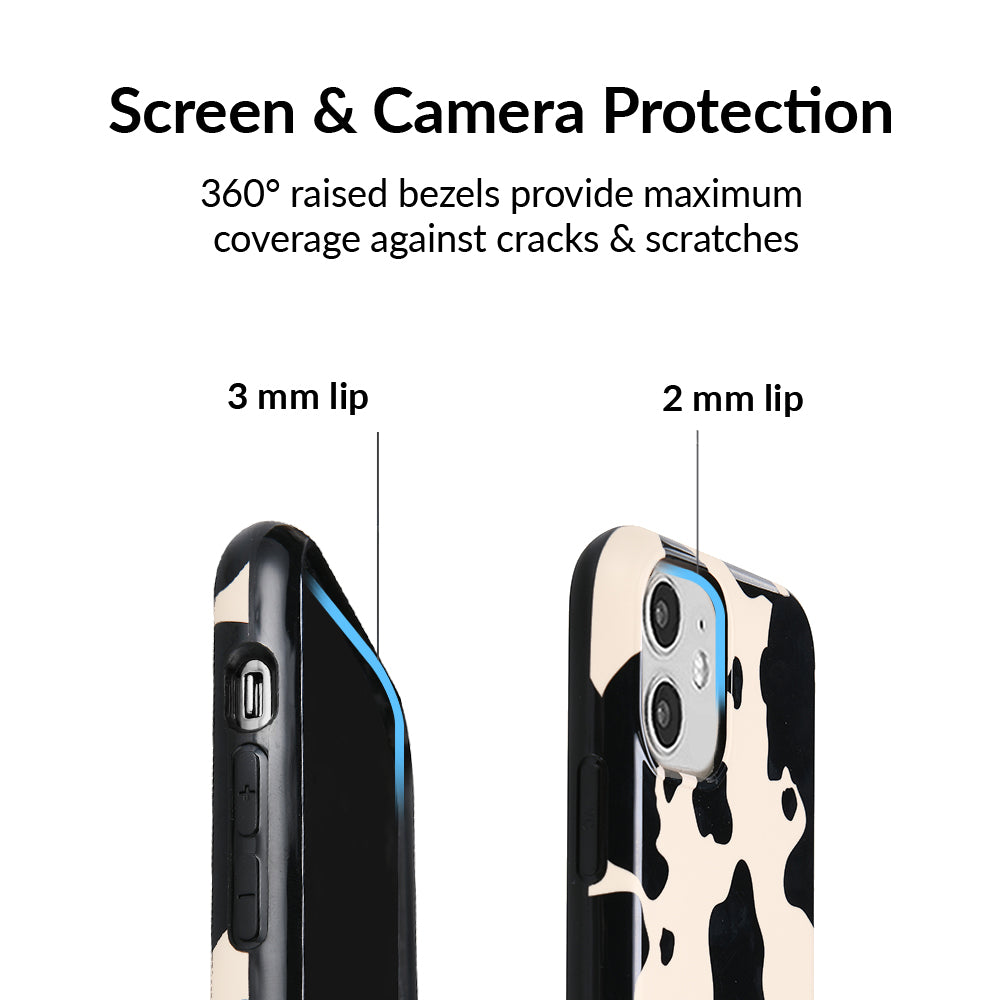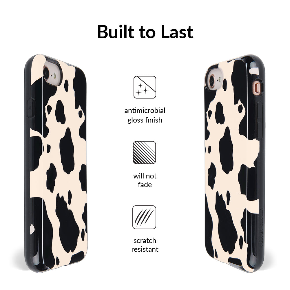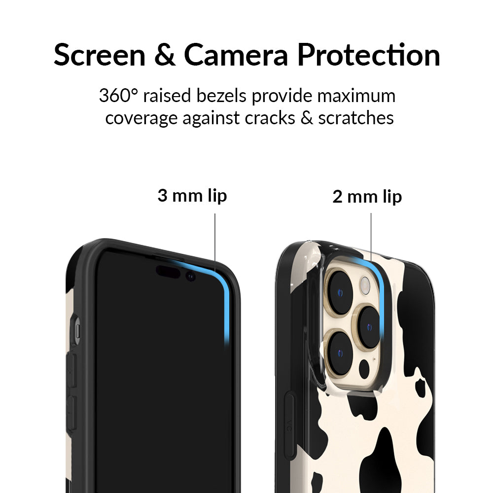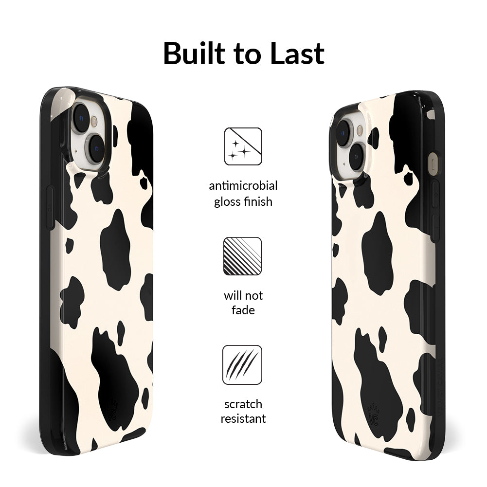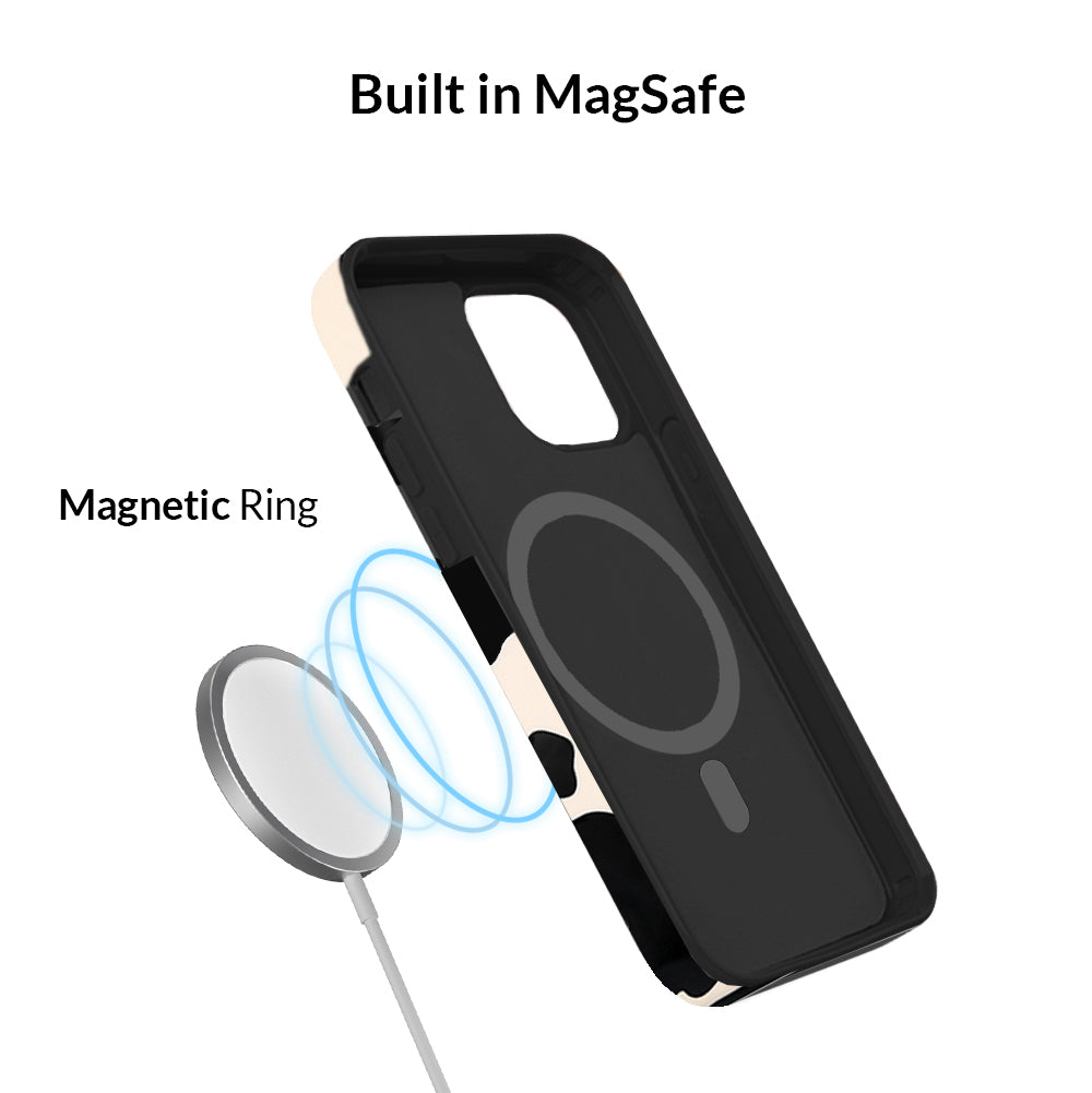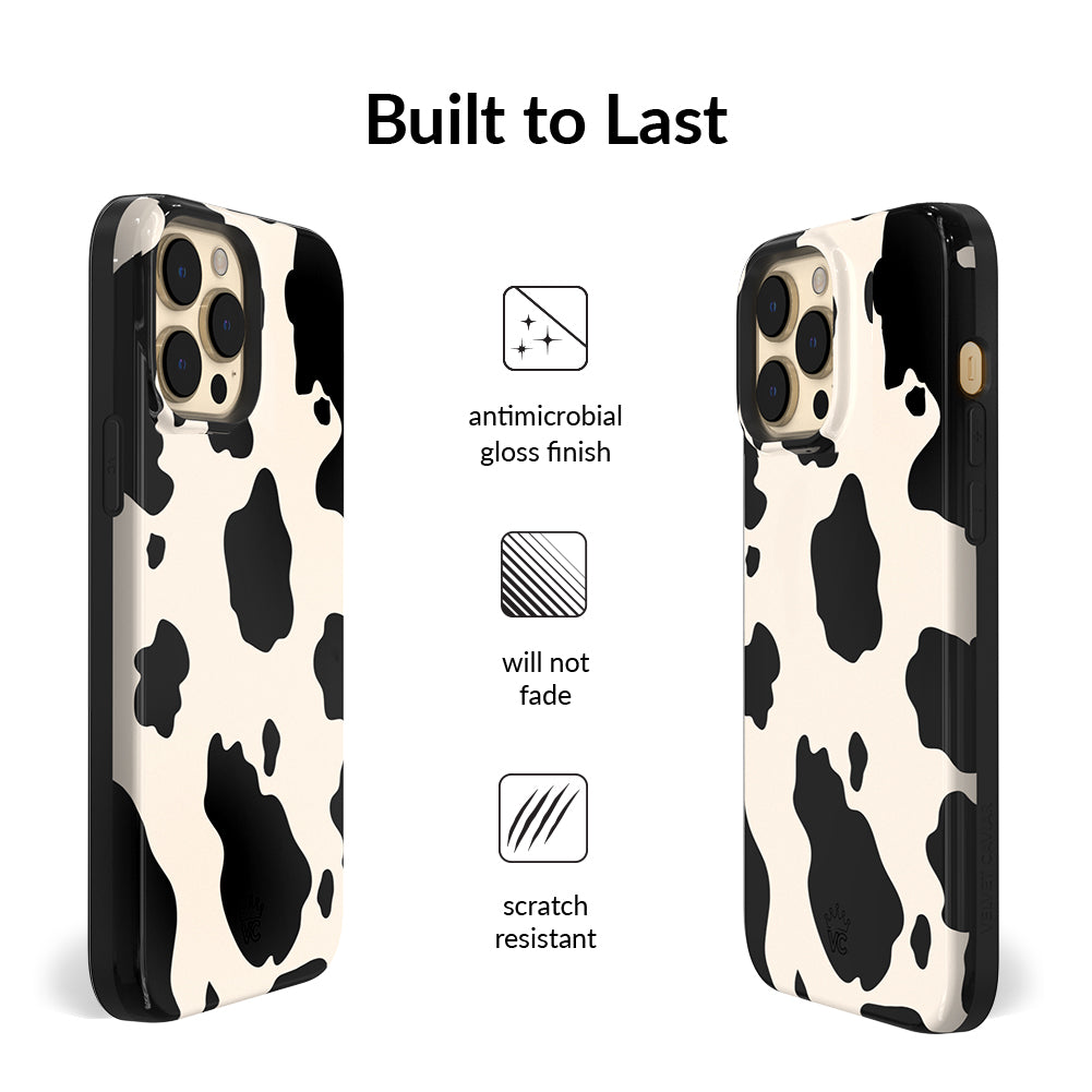 Inspired by our love for animal prints, this protective case features a matte beige base with gloss cow print spots. This style does not feature an interior velvet lining. Built in MagSafe ring is only available for select models. Available with matching grip rings and AirPod cases!