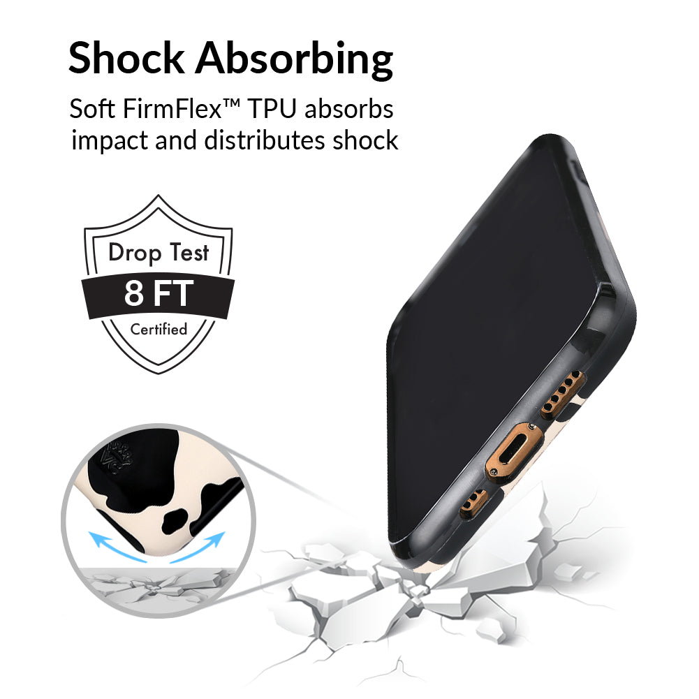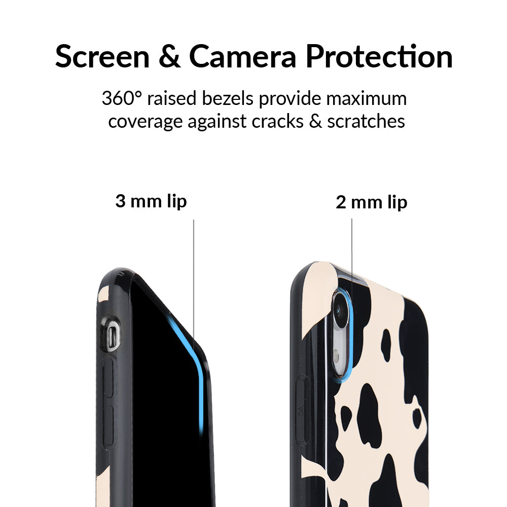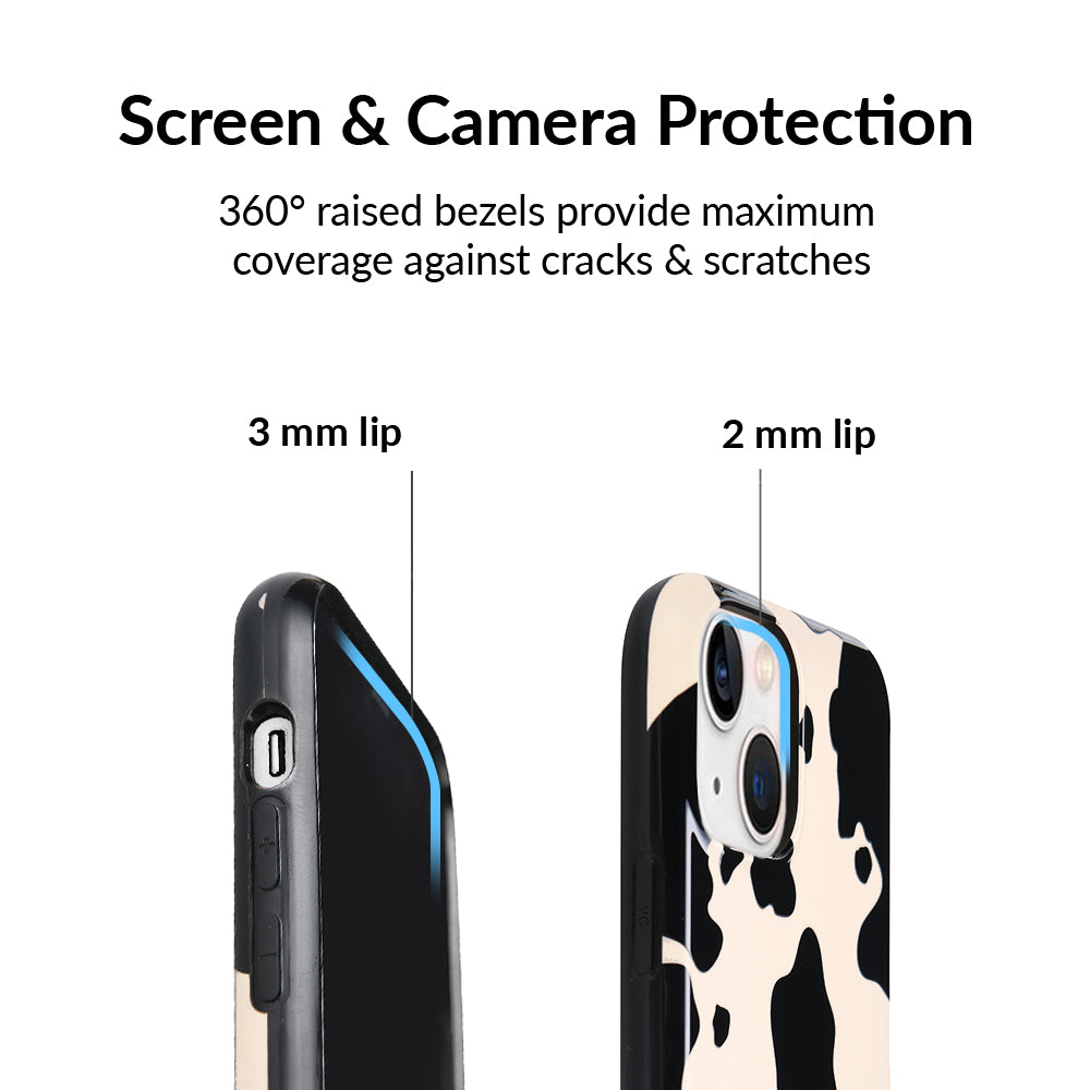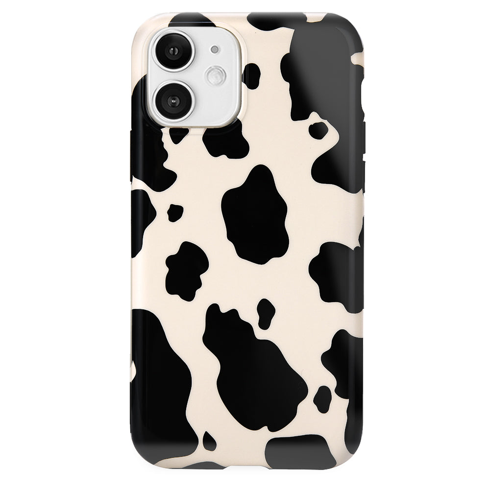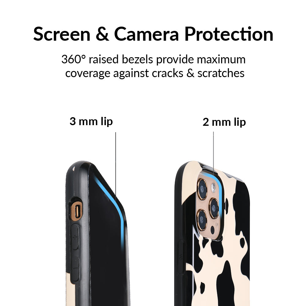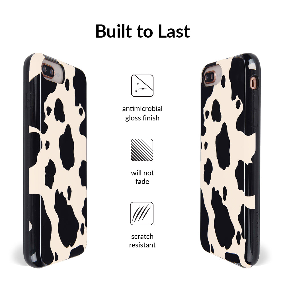 Inspired by our love for animal prints, this protective case features a matte beige base with gloss cow print spots. This style does not feature an interior velvet lining. Built in MagSafe ring is only available for select models. Available with matching grip rings and AirPod cases!