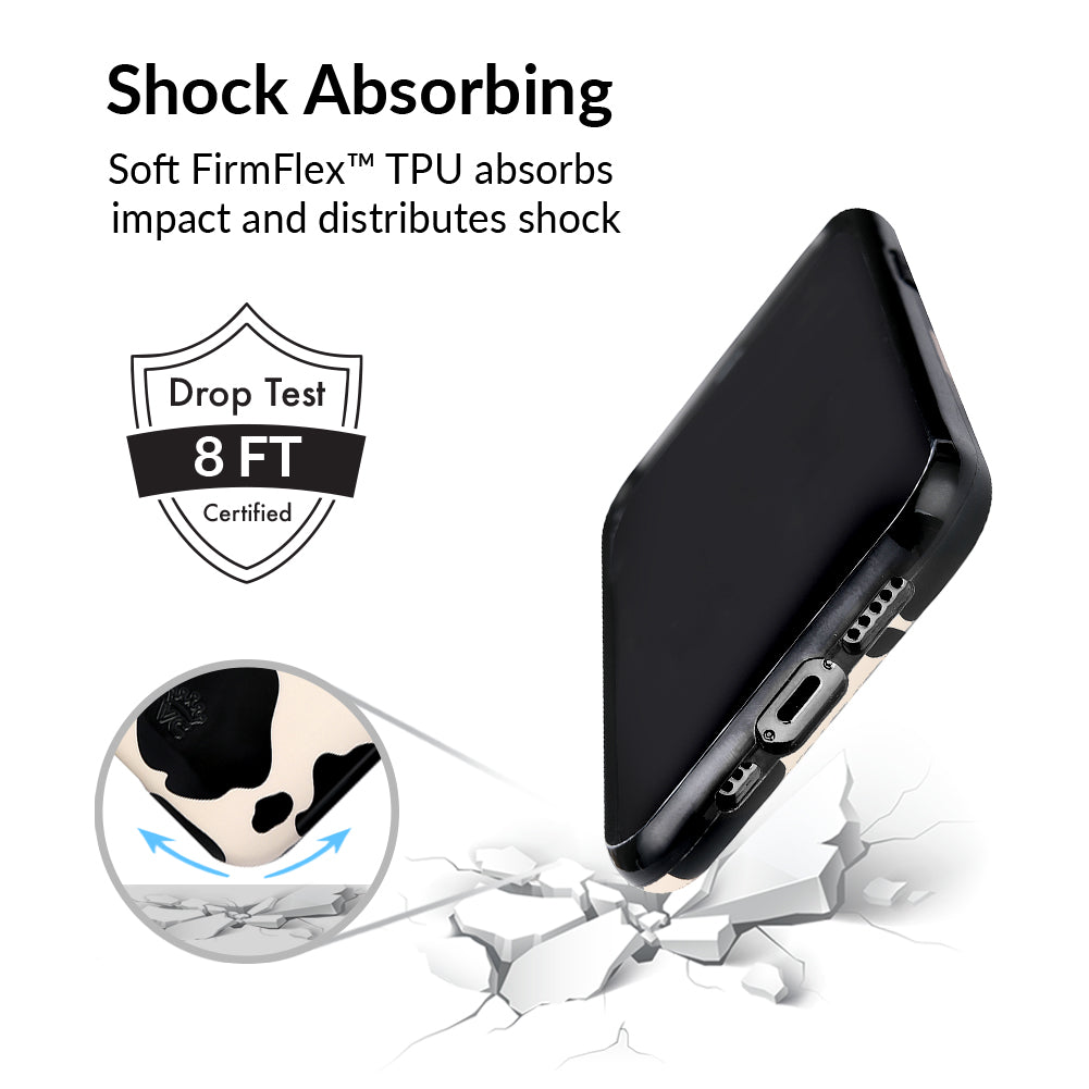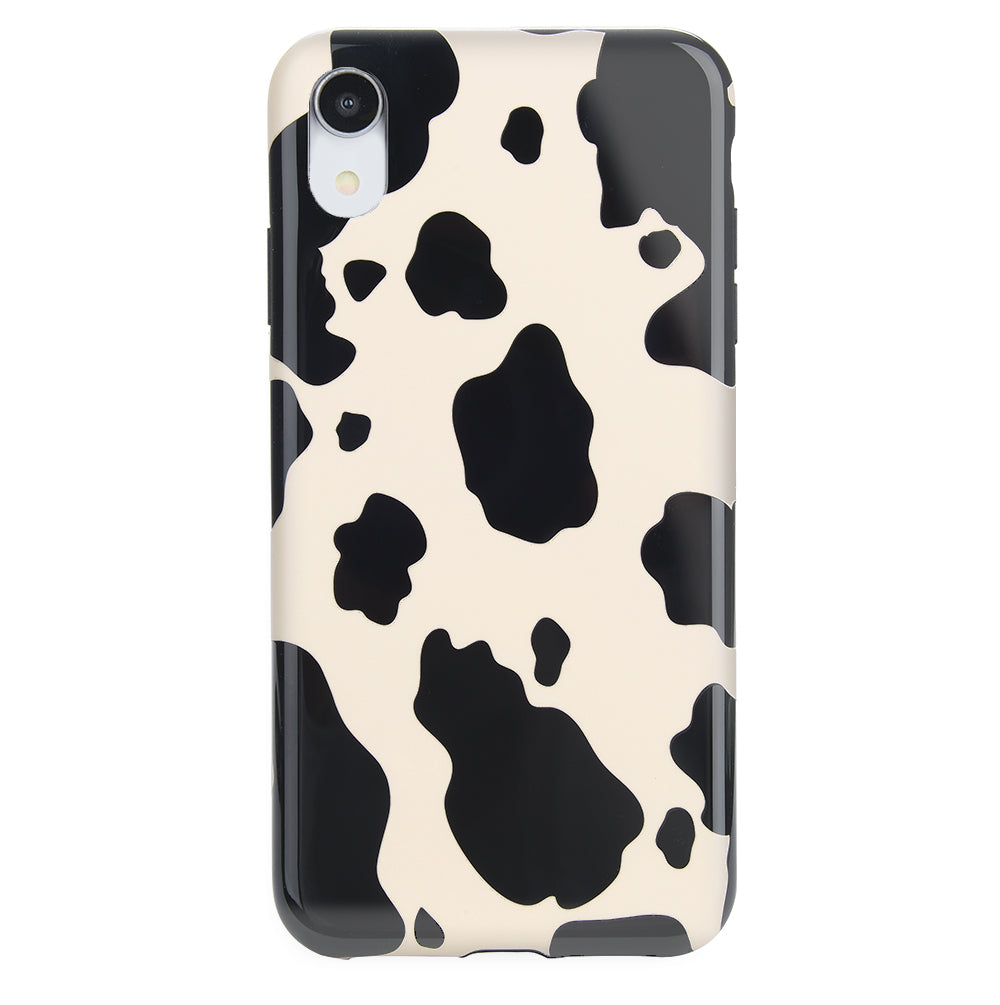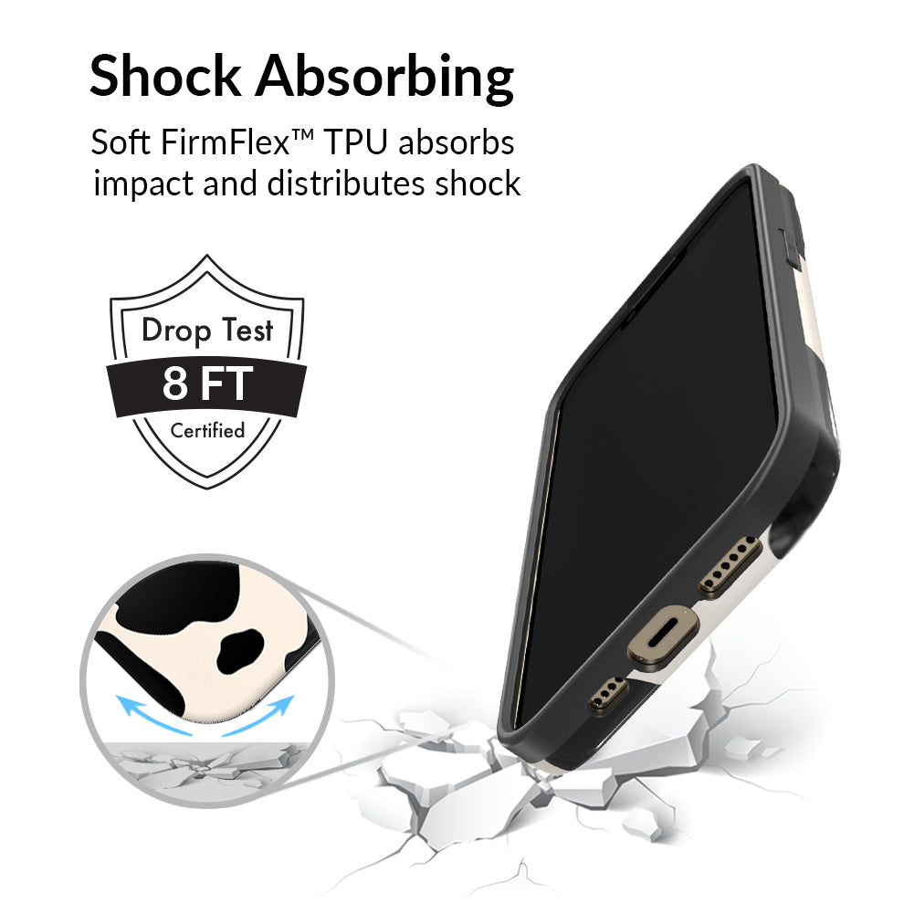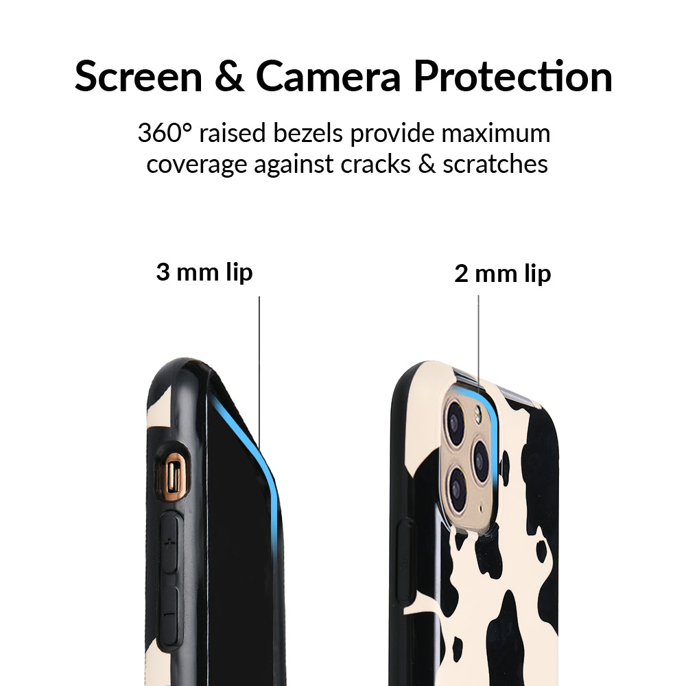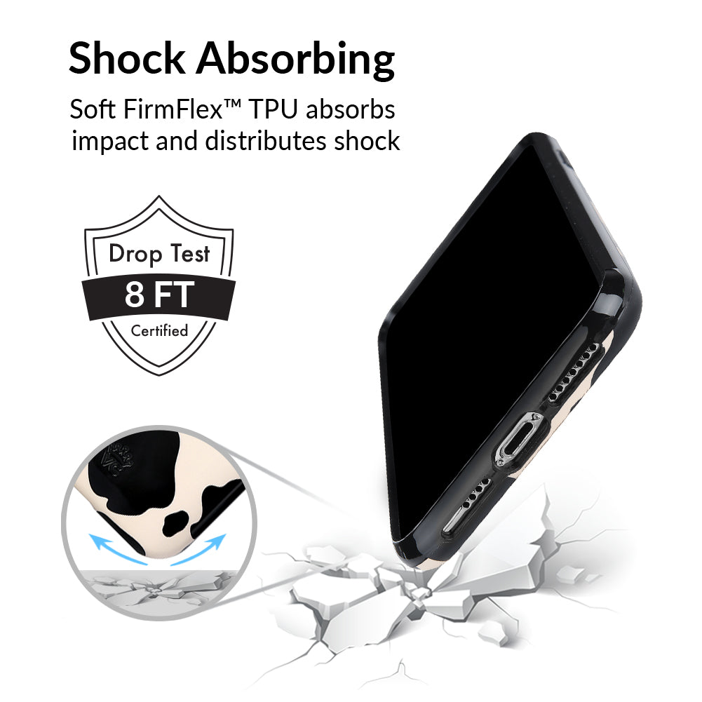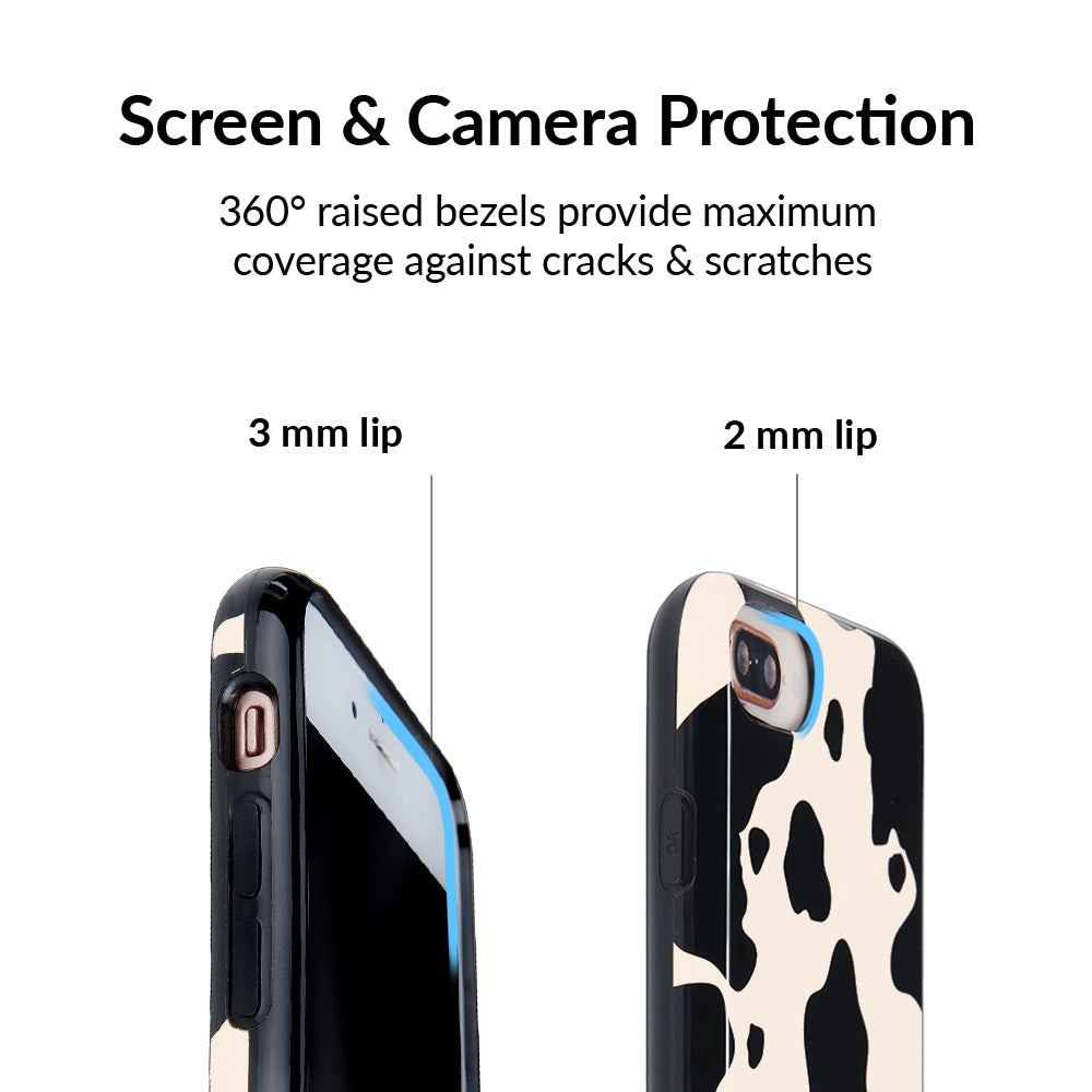 Inspired by our love for animal prints, this protective case features a matte beige base with gloss cow print spots. This style does not feature an interior velvet lining. Built in MagSafe ring is only available for select models. Available with matching grip rings and AirPod cases!