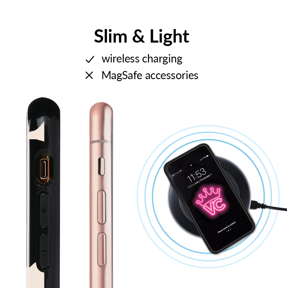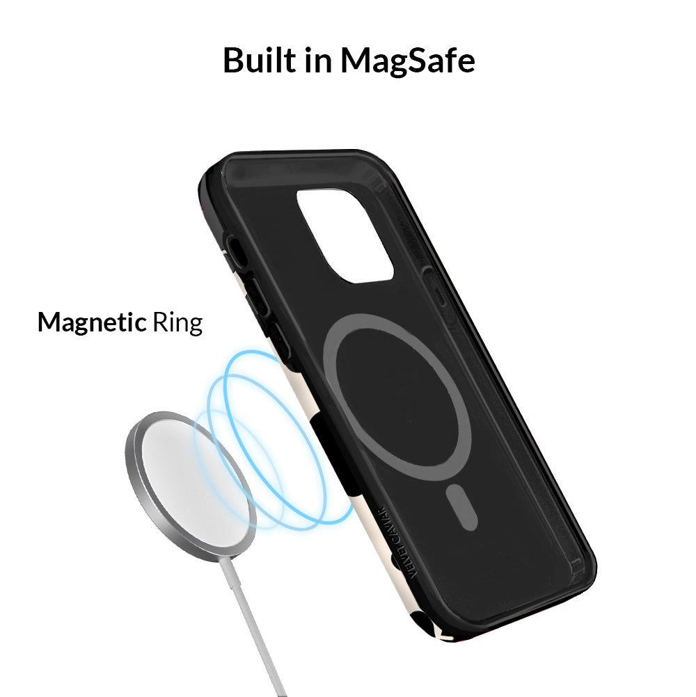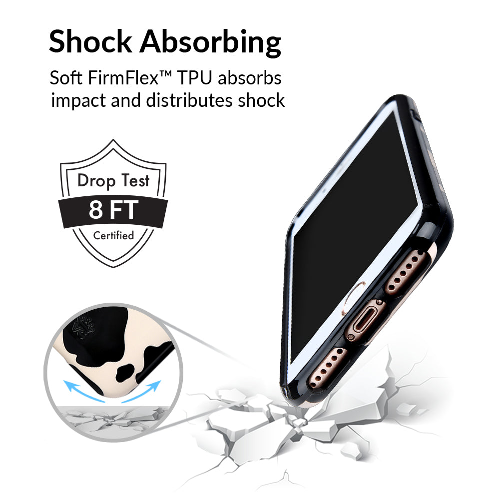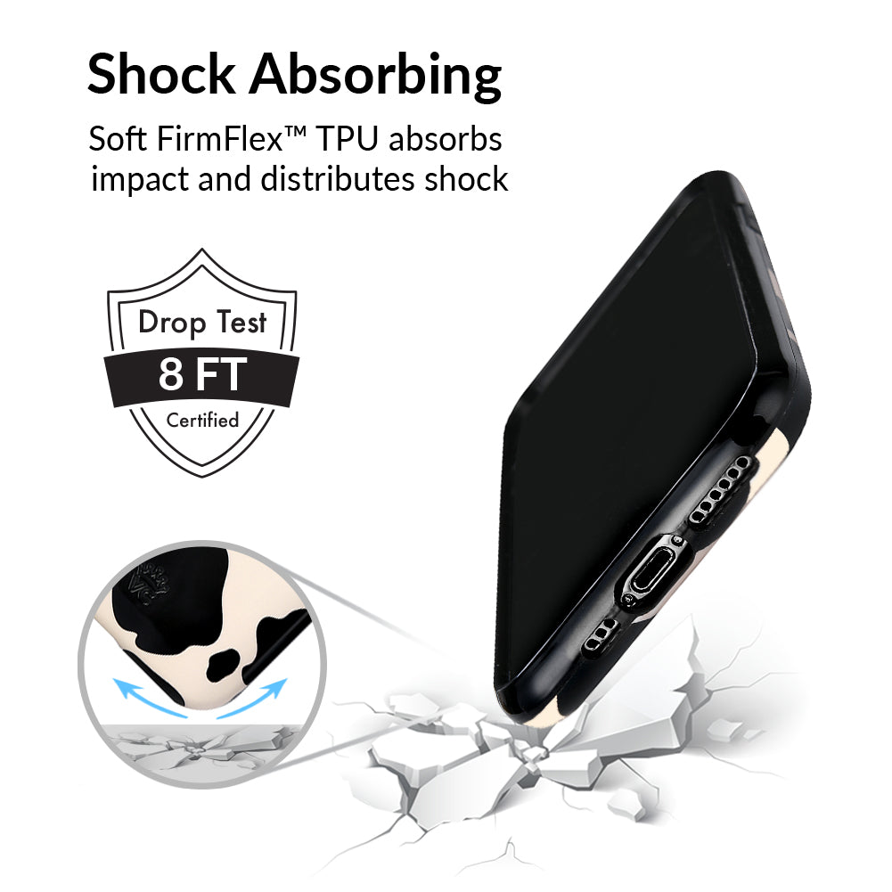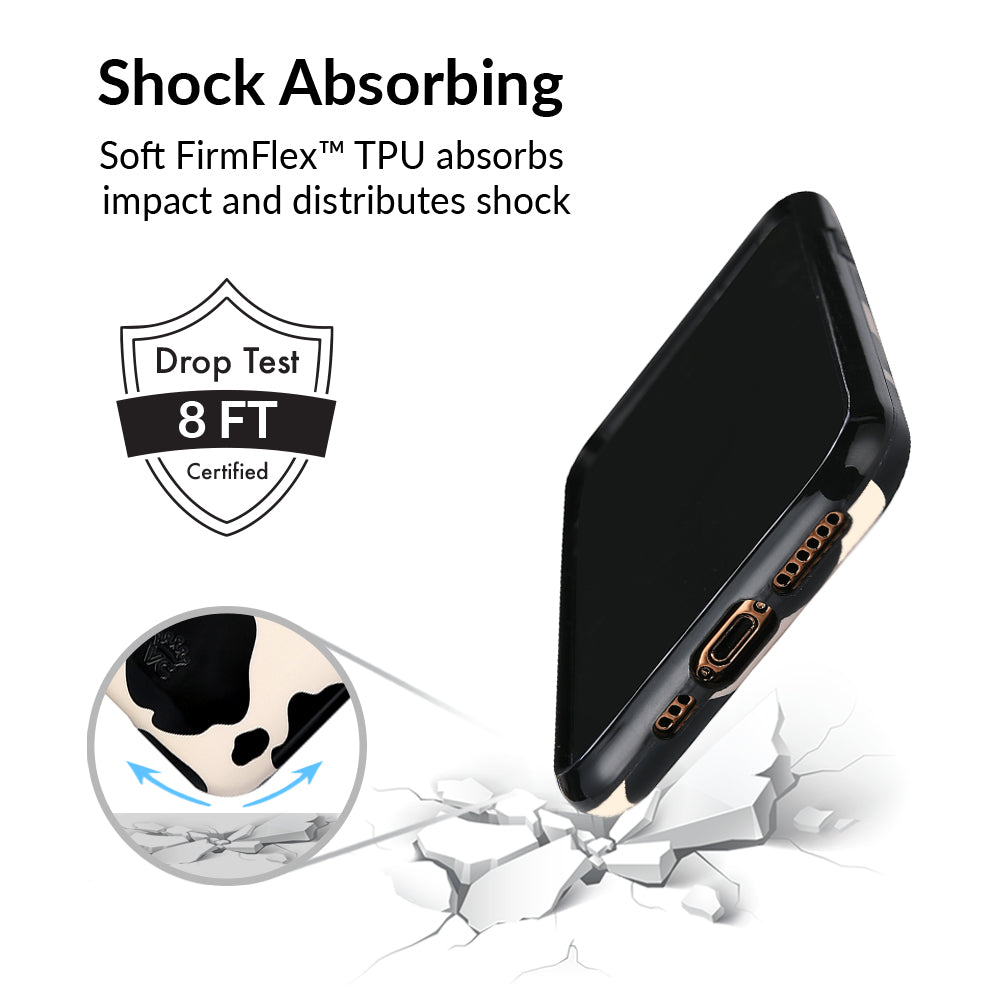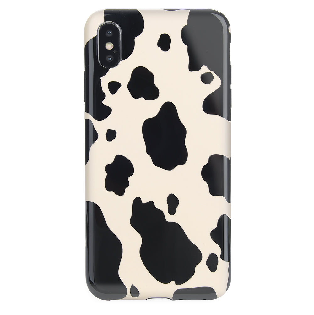 Inspired by our love for animal prints, this protective case features a matte beige base with gloss cow print spots. This style does not feature an interior velvet lining. Built in MagSafe ring is only available for select models. Available with matching grip rings and AirPod cases!