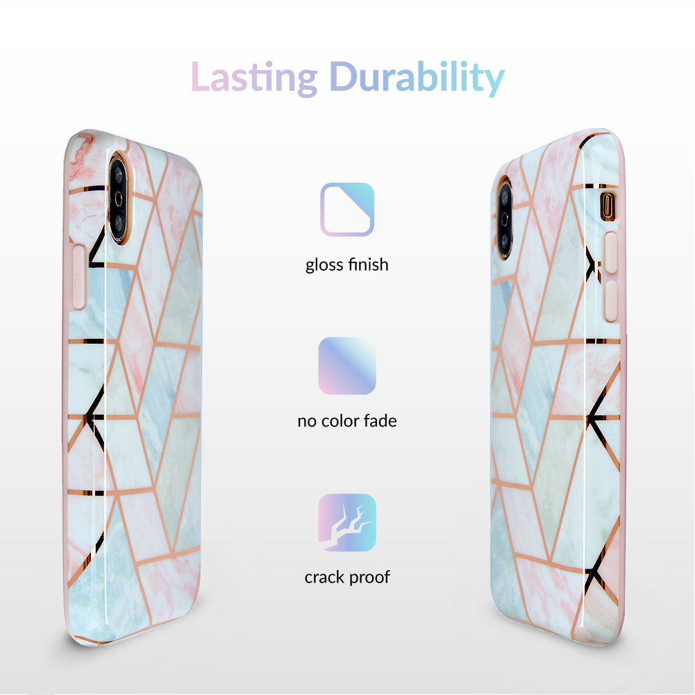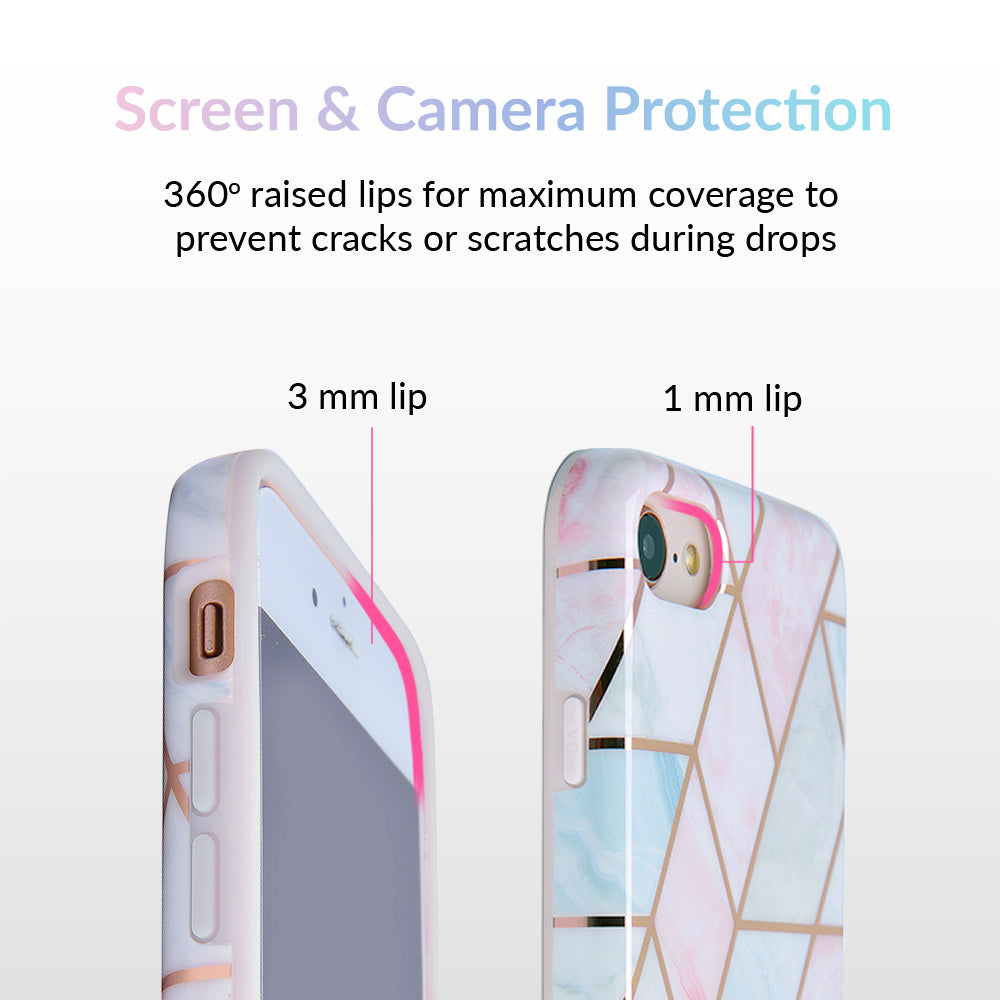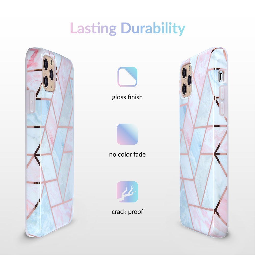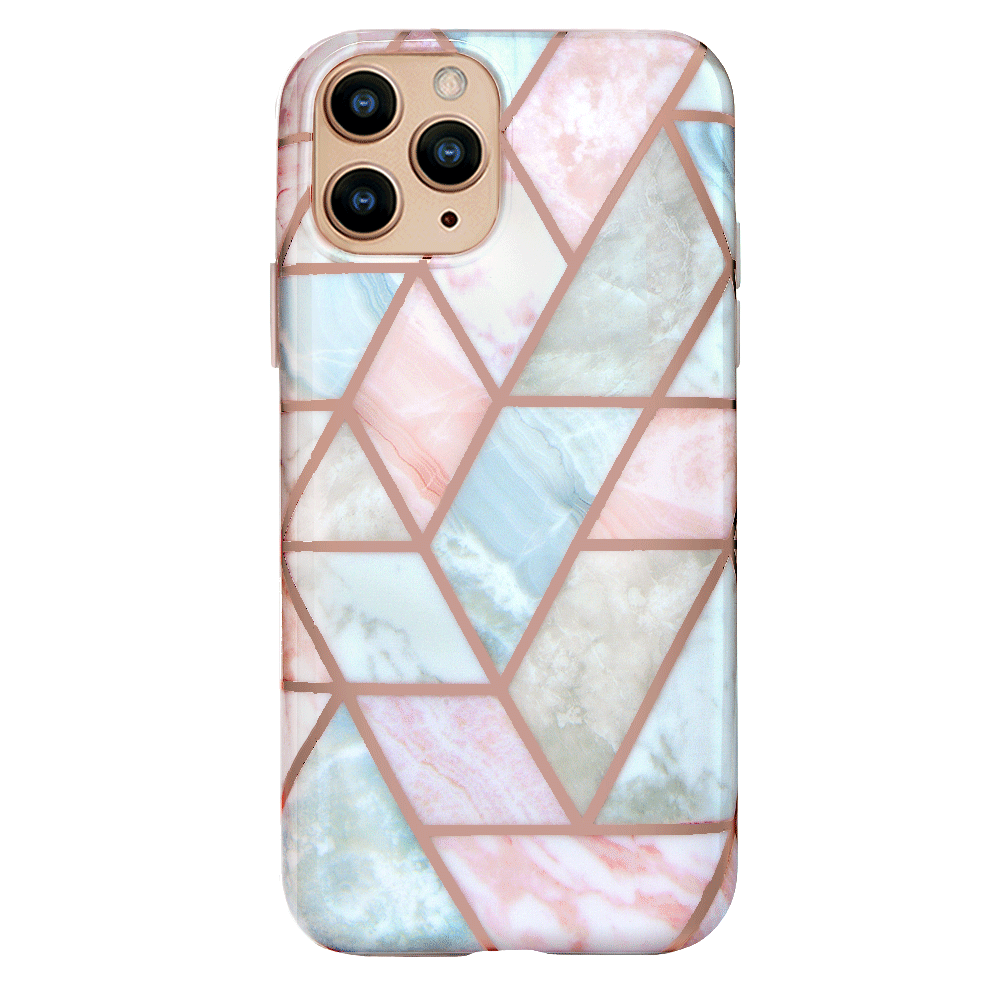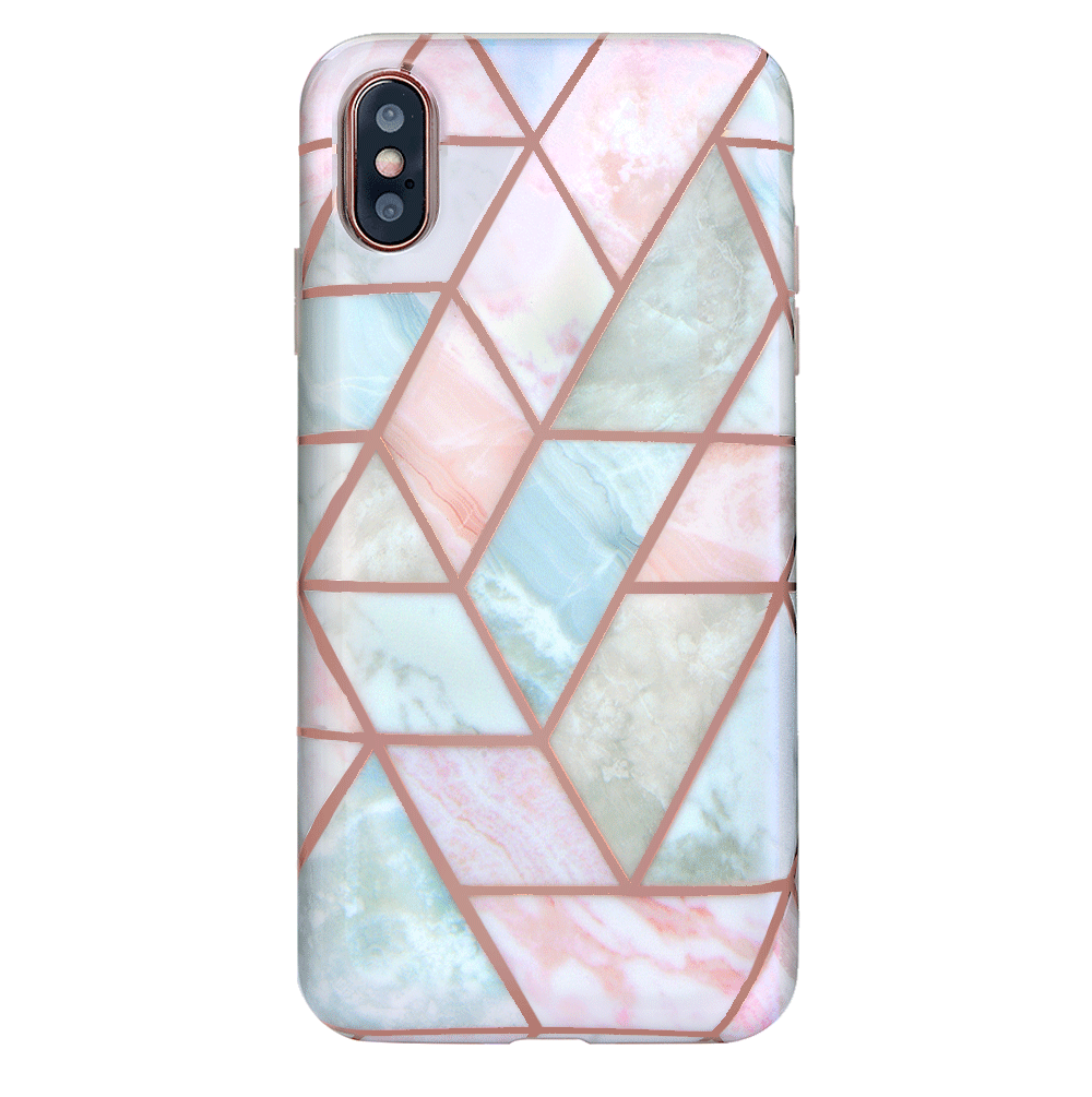 Featuring a geometric pastel marble pattern, outlined in rose gold chrome along with a matching blush pink bumper for added screen protection.