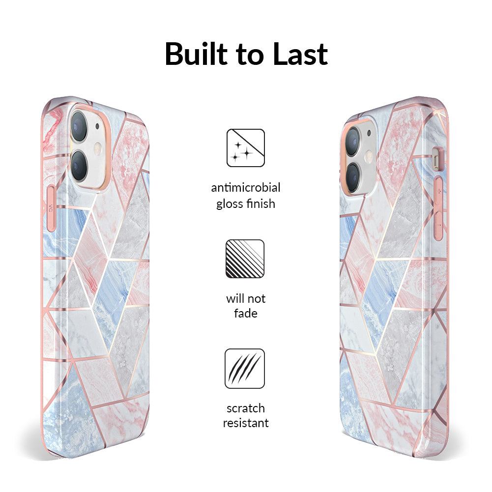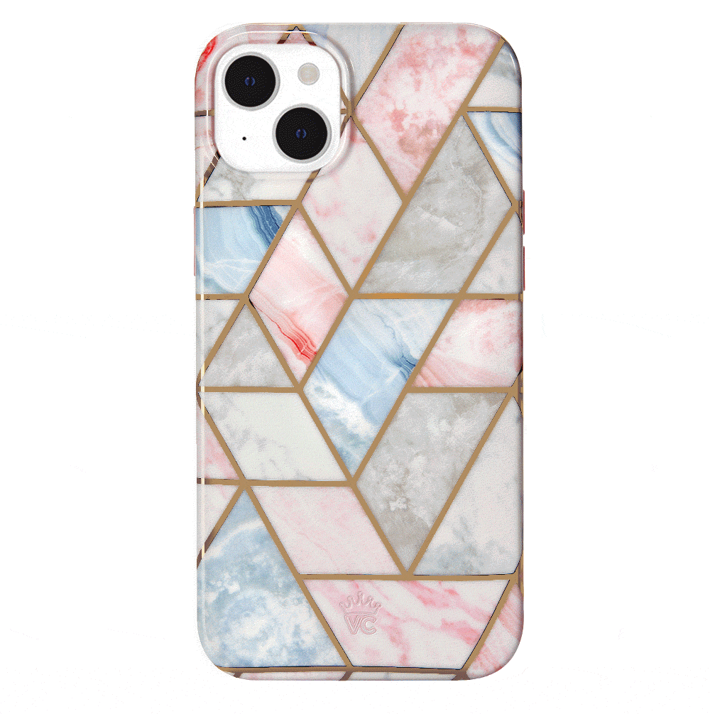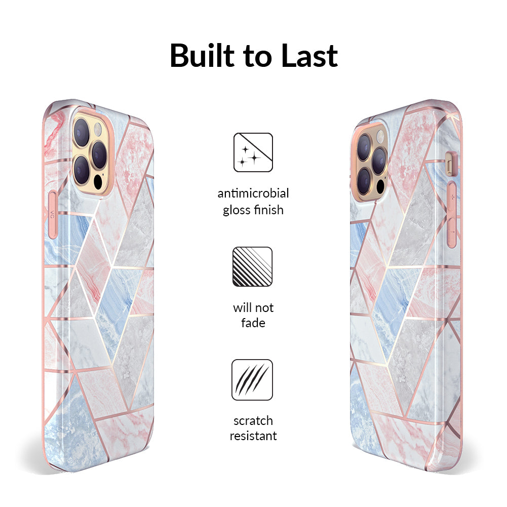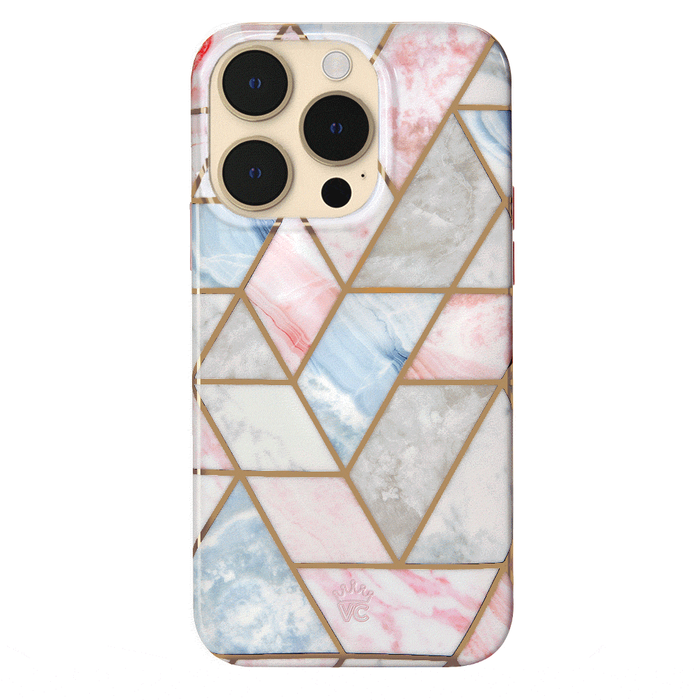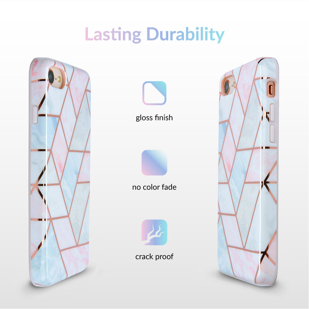 Featuring a geometric pastel marble pattern, outlined in rose gold chrome along with a matching blush pink bumper for added screen protection.