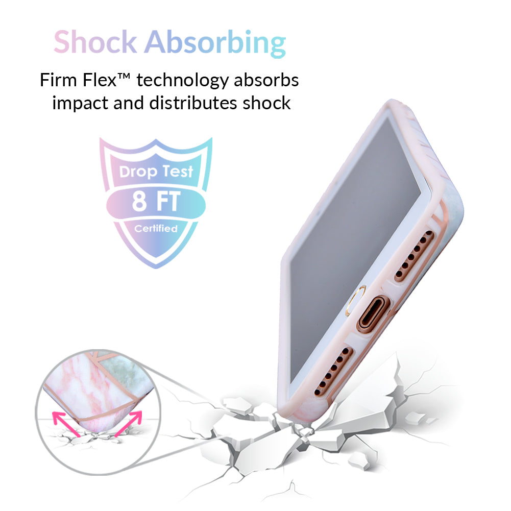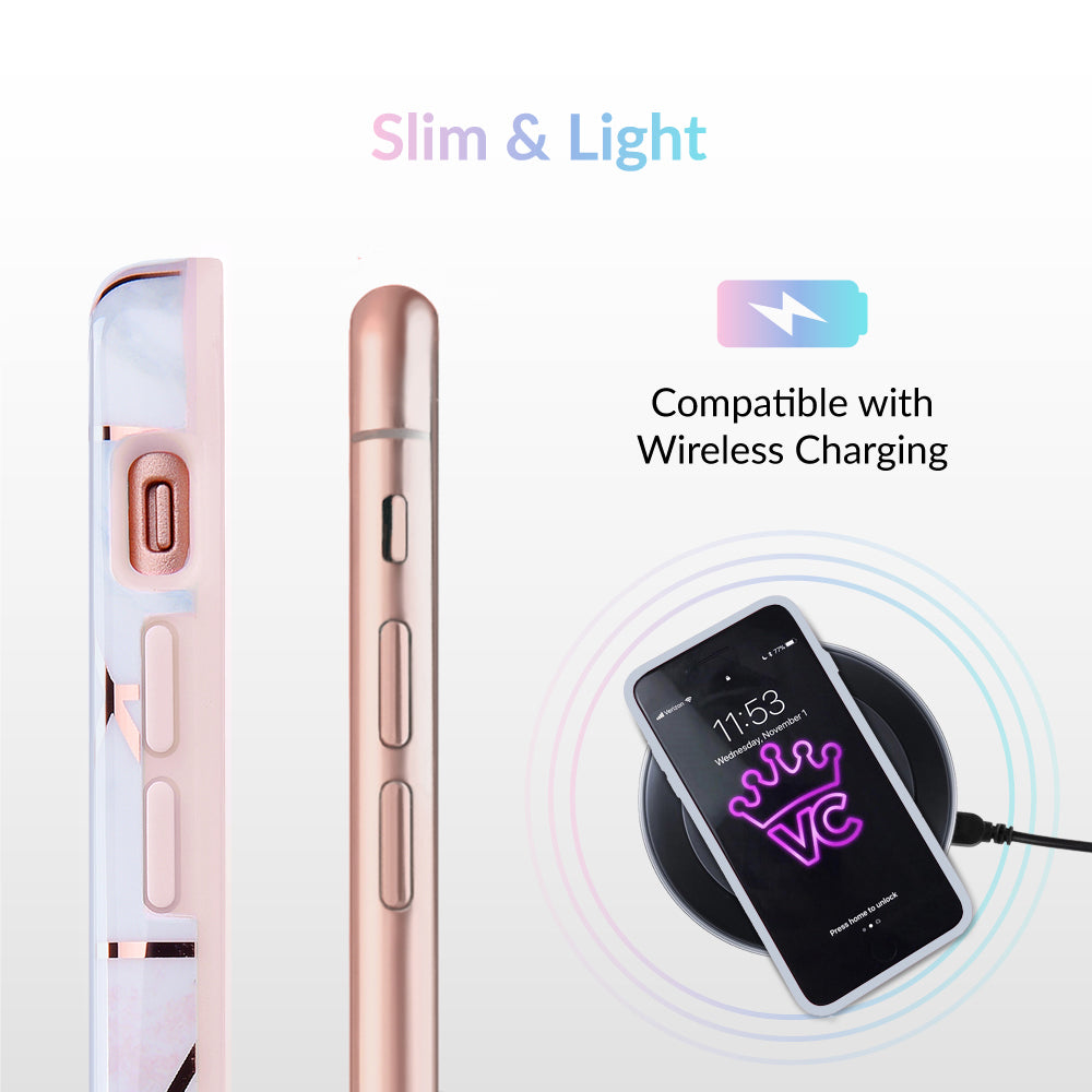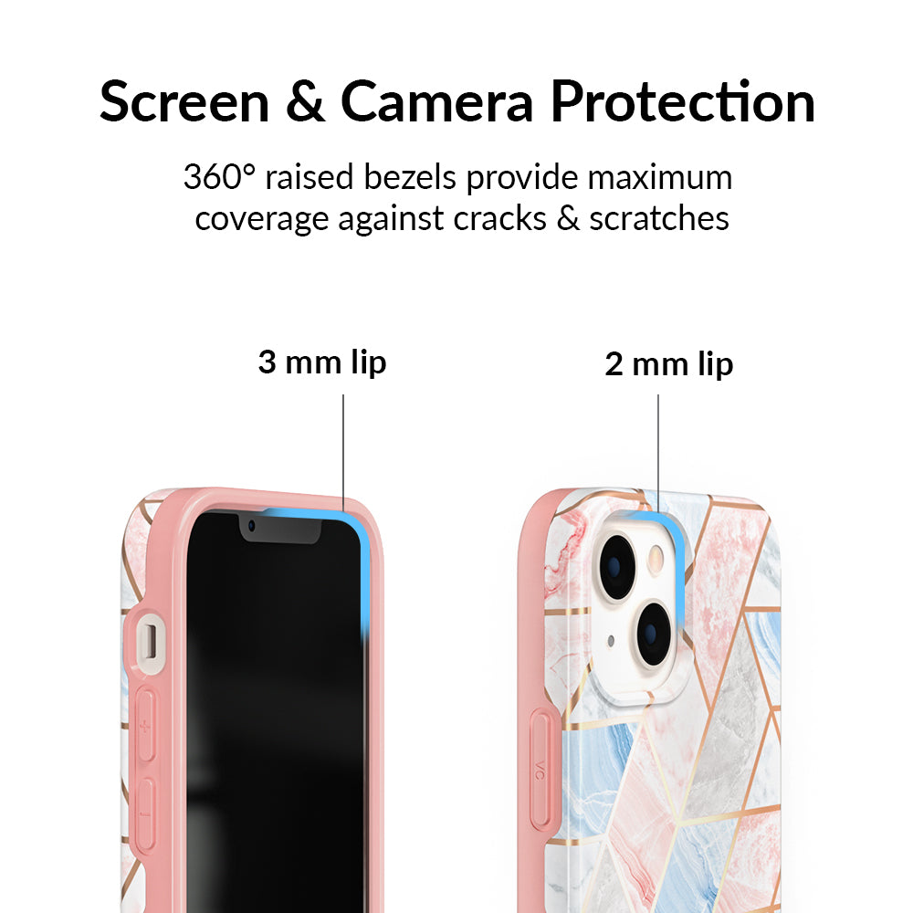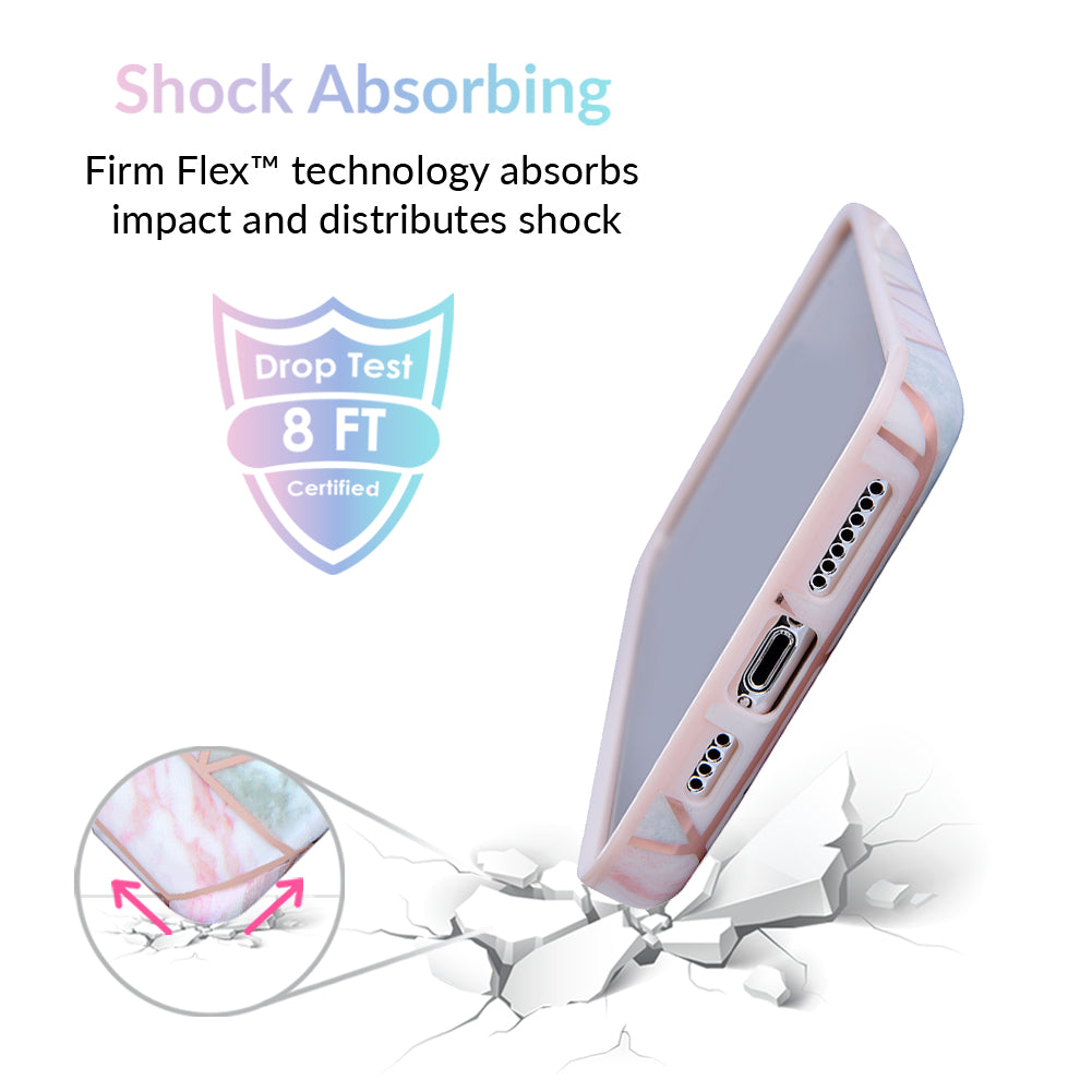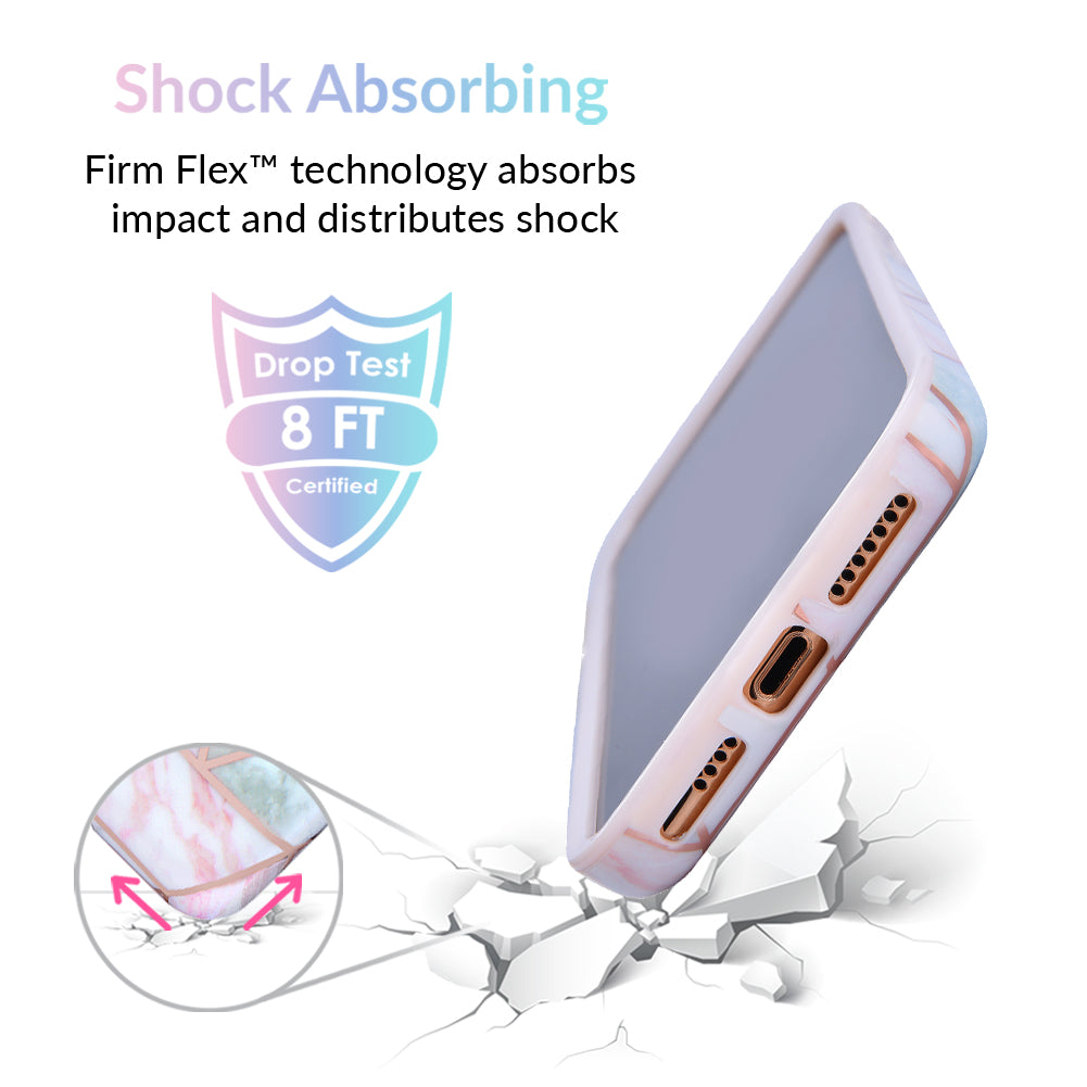 Featuring a geometric pastel marble pattern, outlined in rose gold chrome along with a matching blush pink bumper for added screen protection.