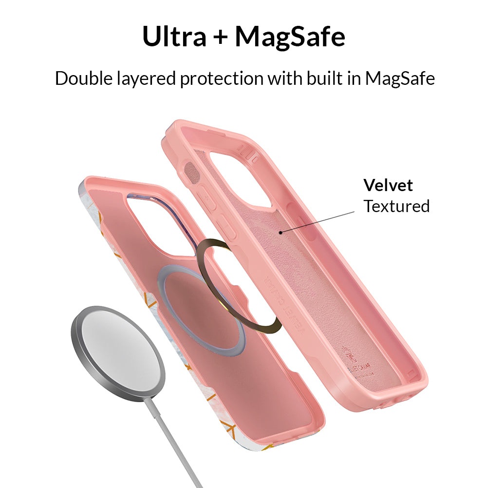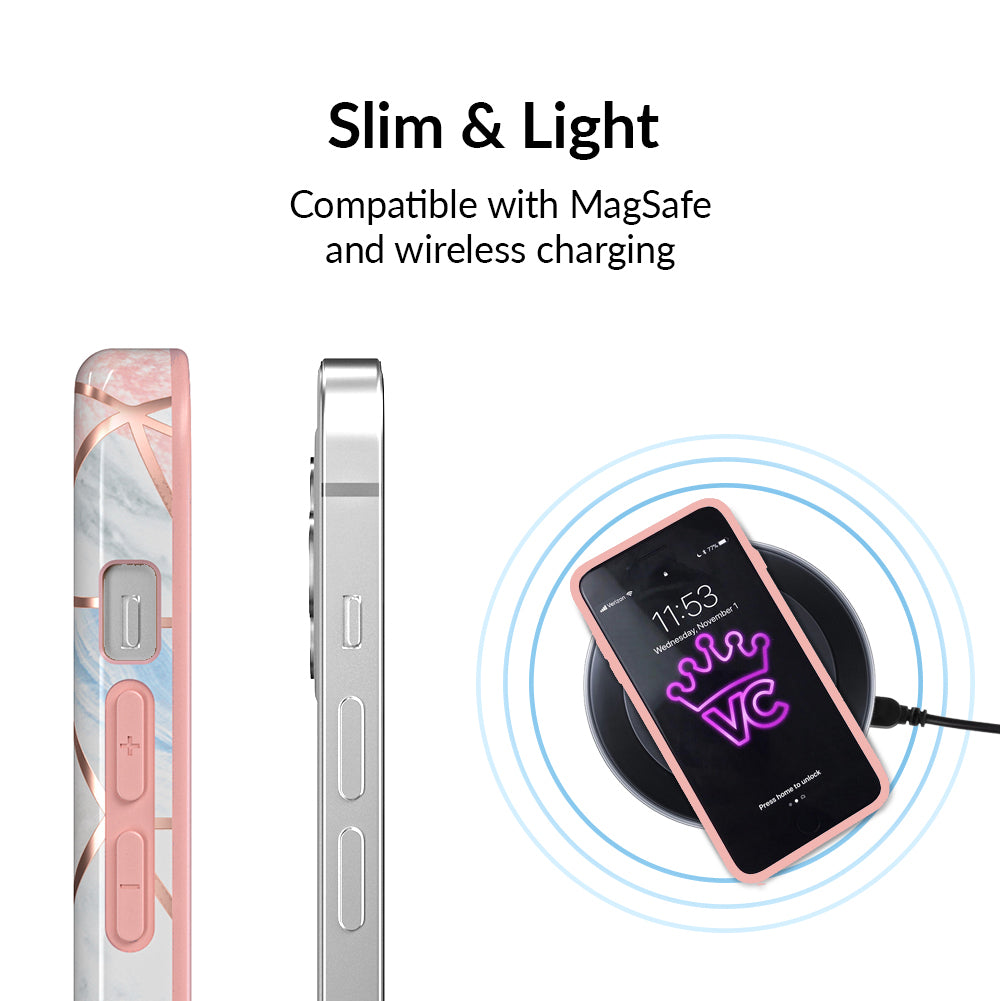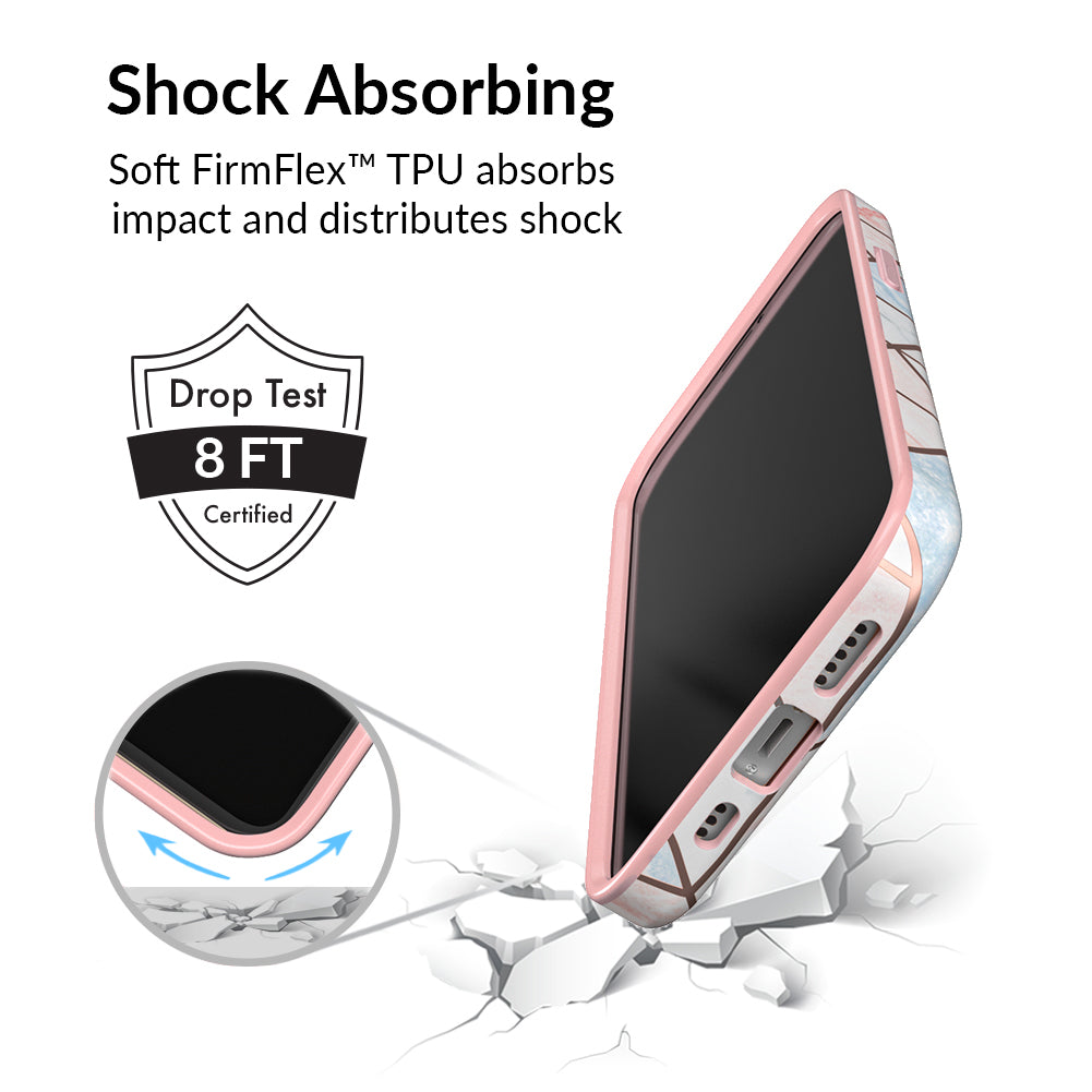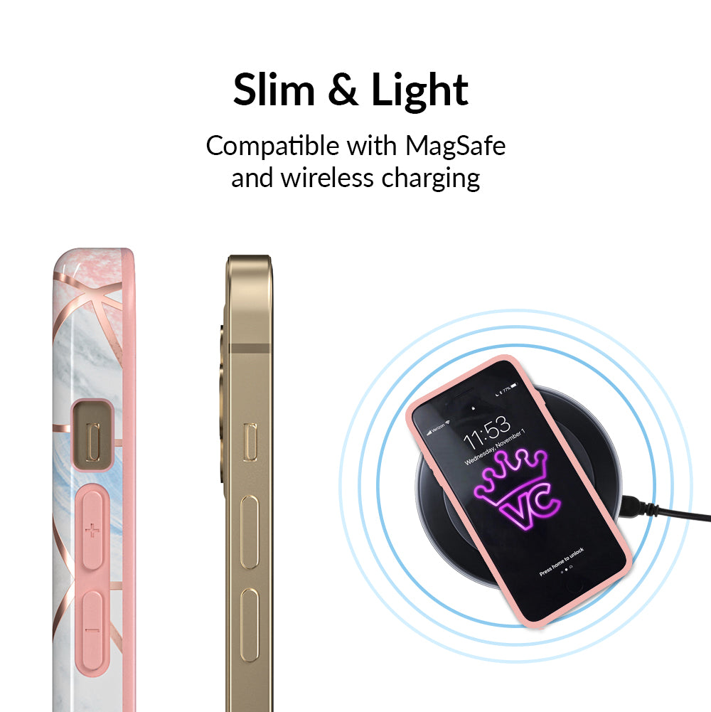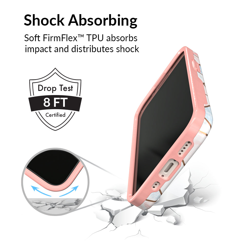 Featuring a geometric pastel marble pattern, outlined in rose gold chrome along with a matching blush pink bumper for added screen protection.