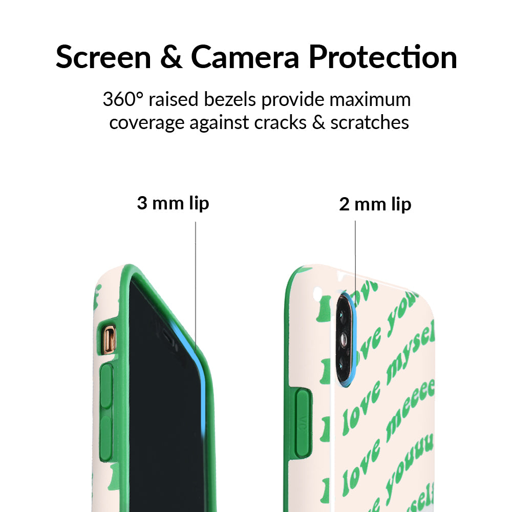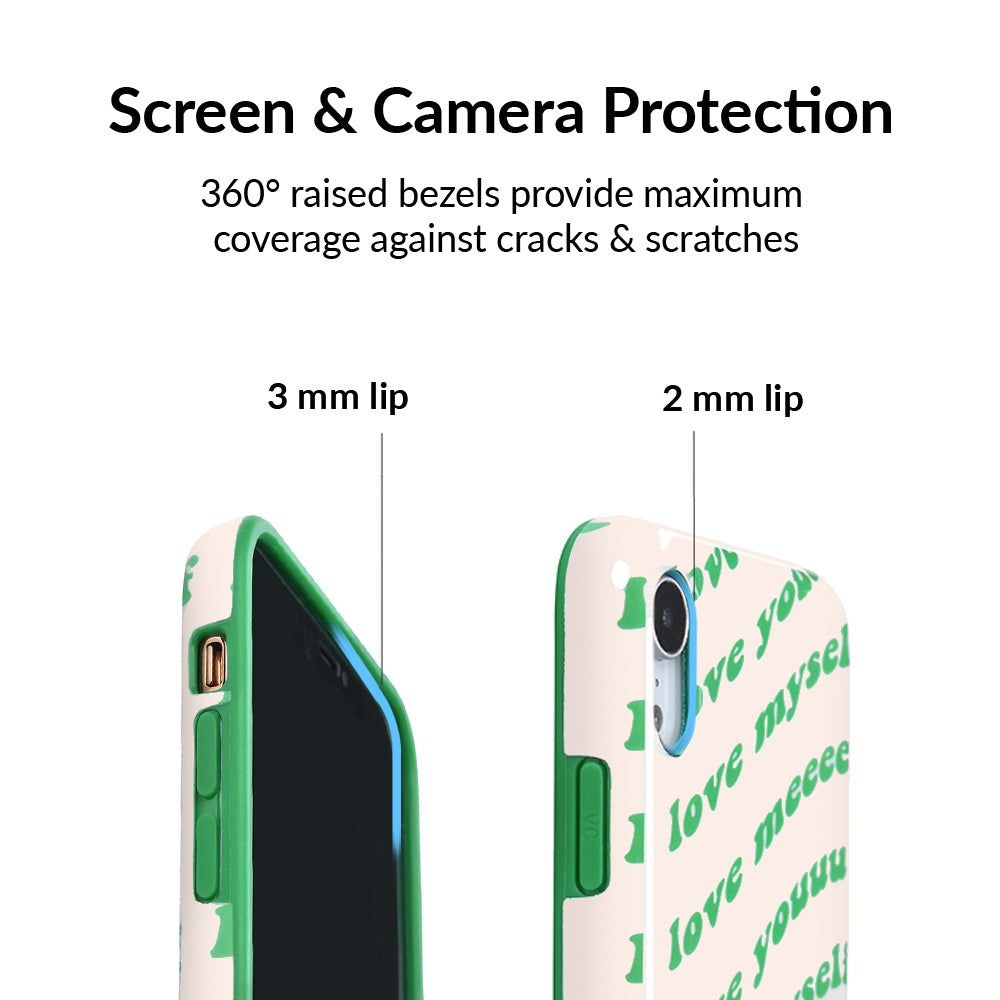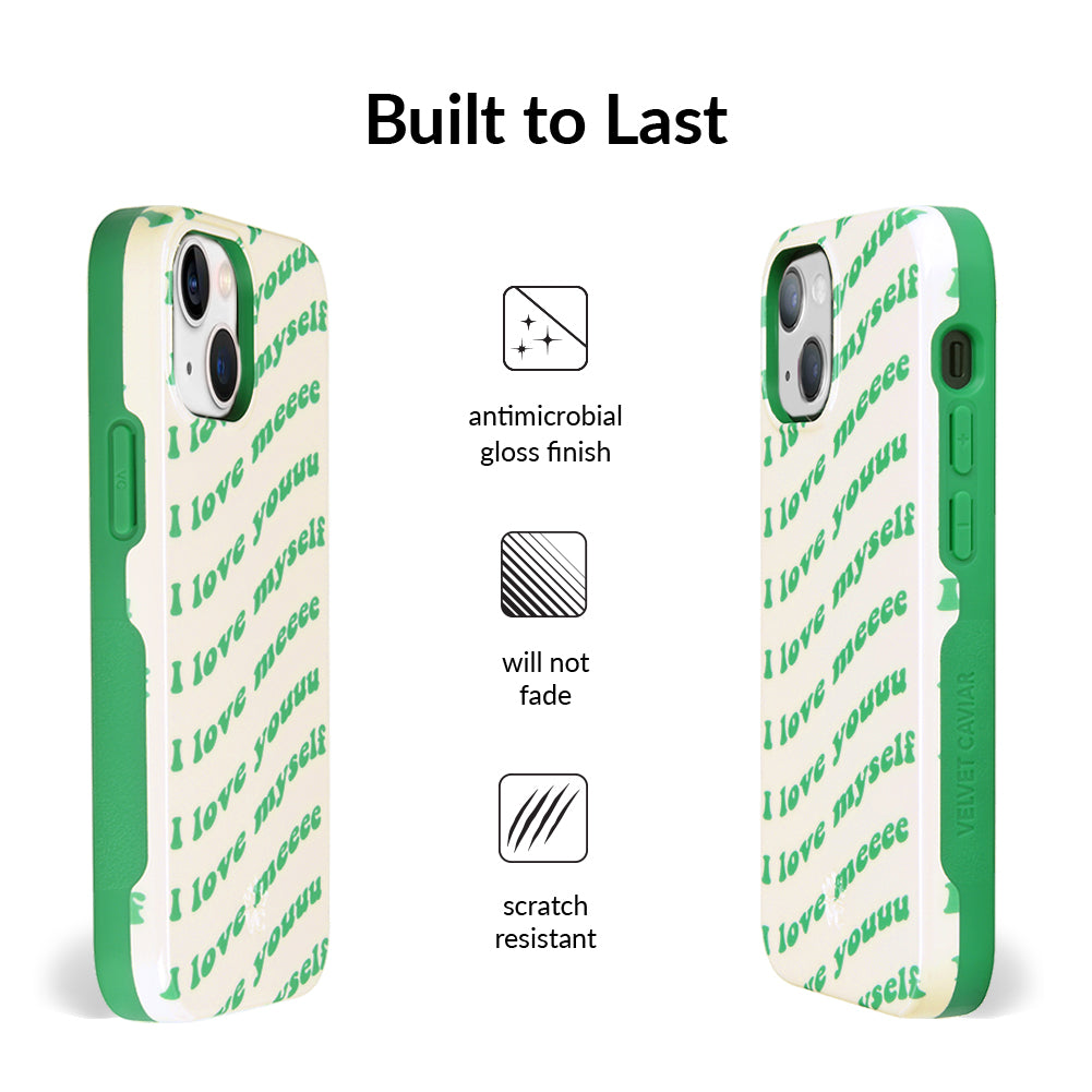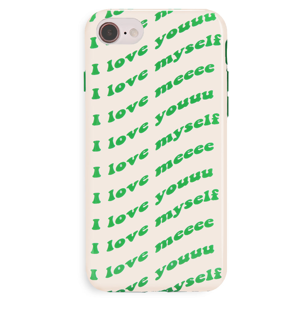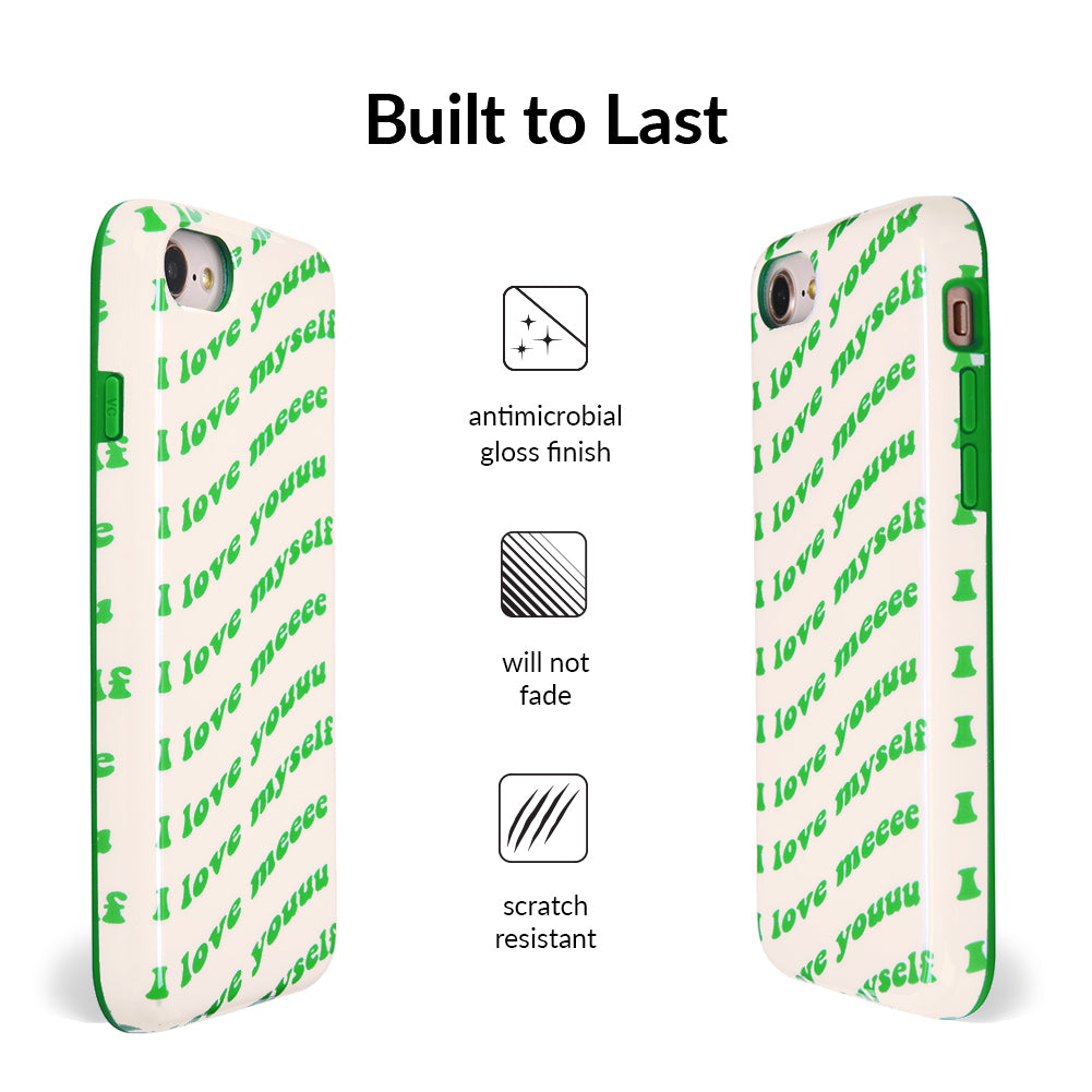 Self love is the best love! Radiate positive vibes & good energy. This protective opaque case features a glossy cream base with kelly green words of empowerment. Finished with a matching green bumper this case is a beautiful reminder to love yourself always.
