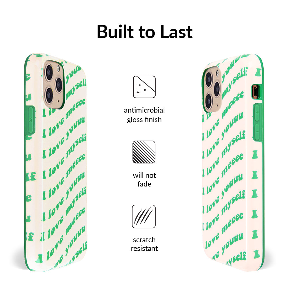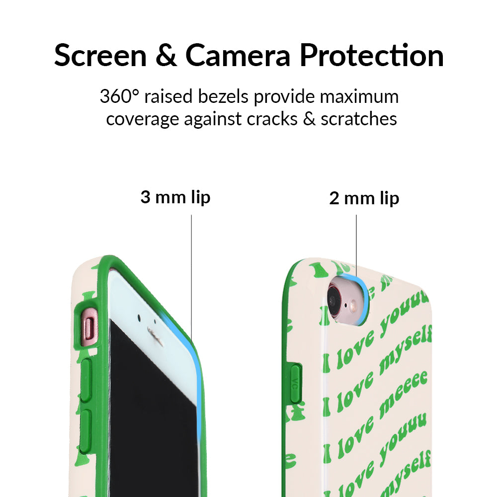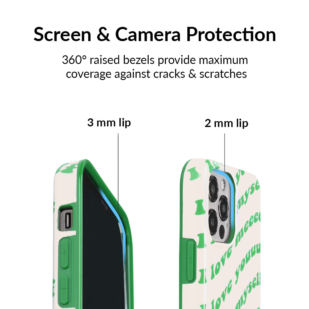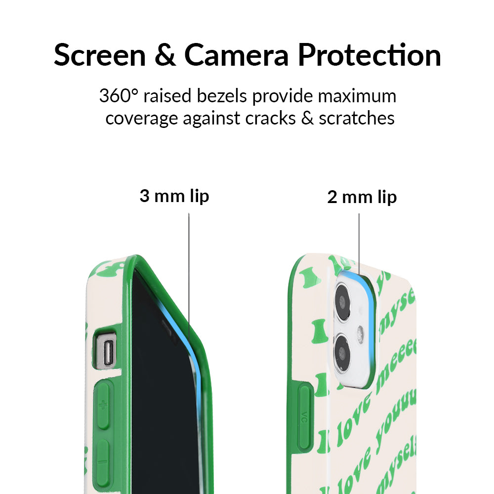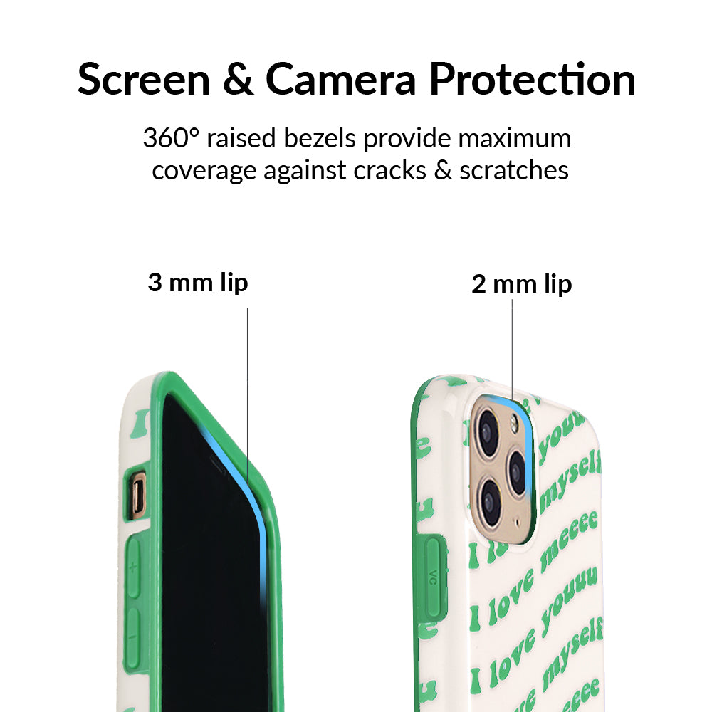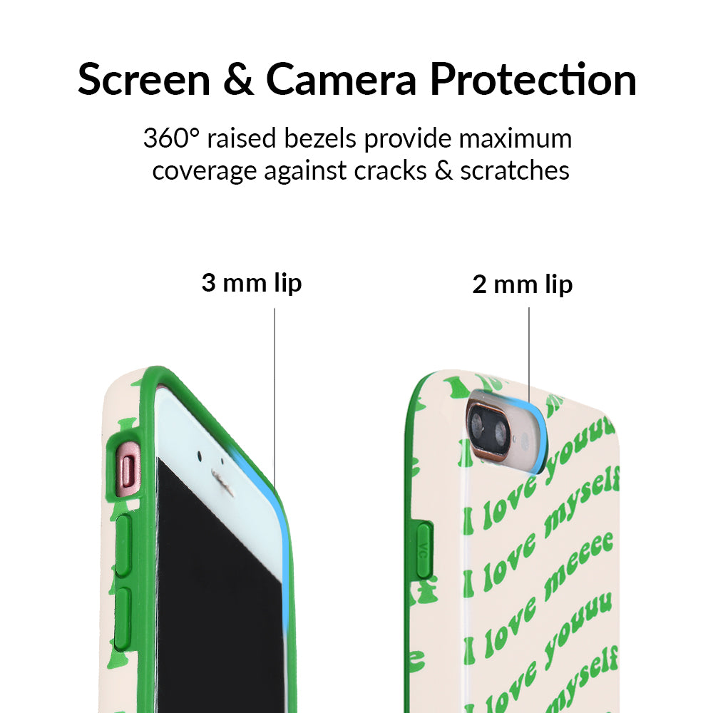 Self love is the best love! Radiate positive vibes & good energy. This protective opaque case features a glossy cream base with kelly green words of empowerment. Finished with a matching green bumper this case is a beautiful reminder to love yourself always.