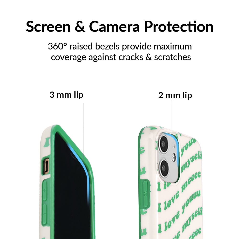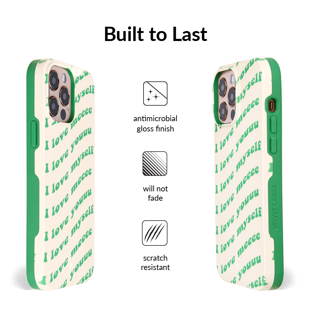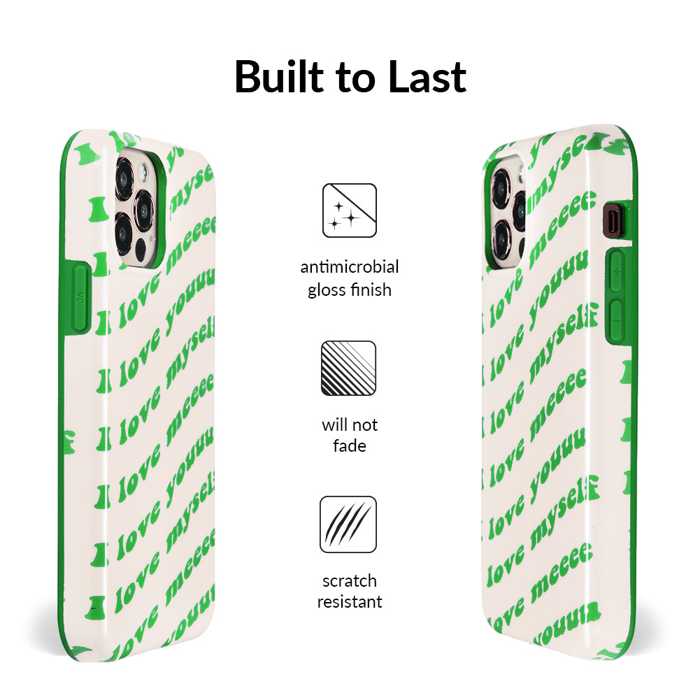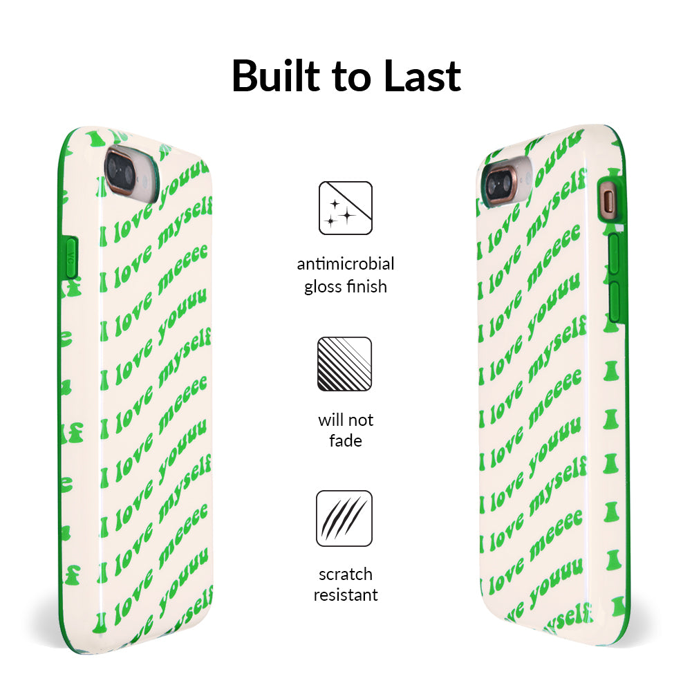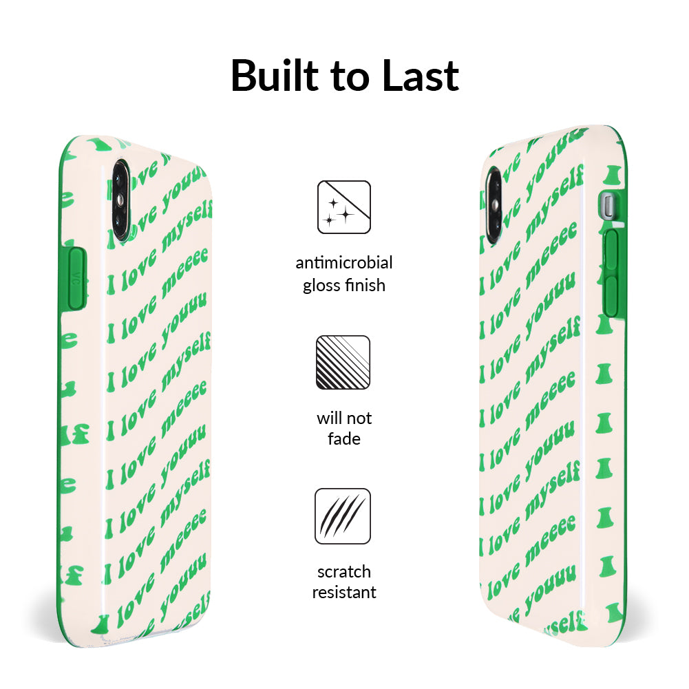 Self love is the best love! Radiate positive vibes & good energy. This protective opaque case features a glossy cream base with kelly green words of empowerment. Finished with a matching green bumper this case is a beautiful reminder to love yourself always.