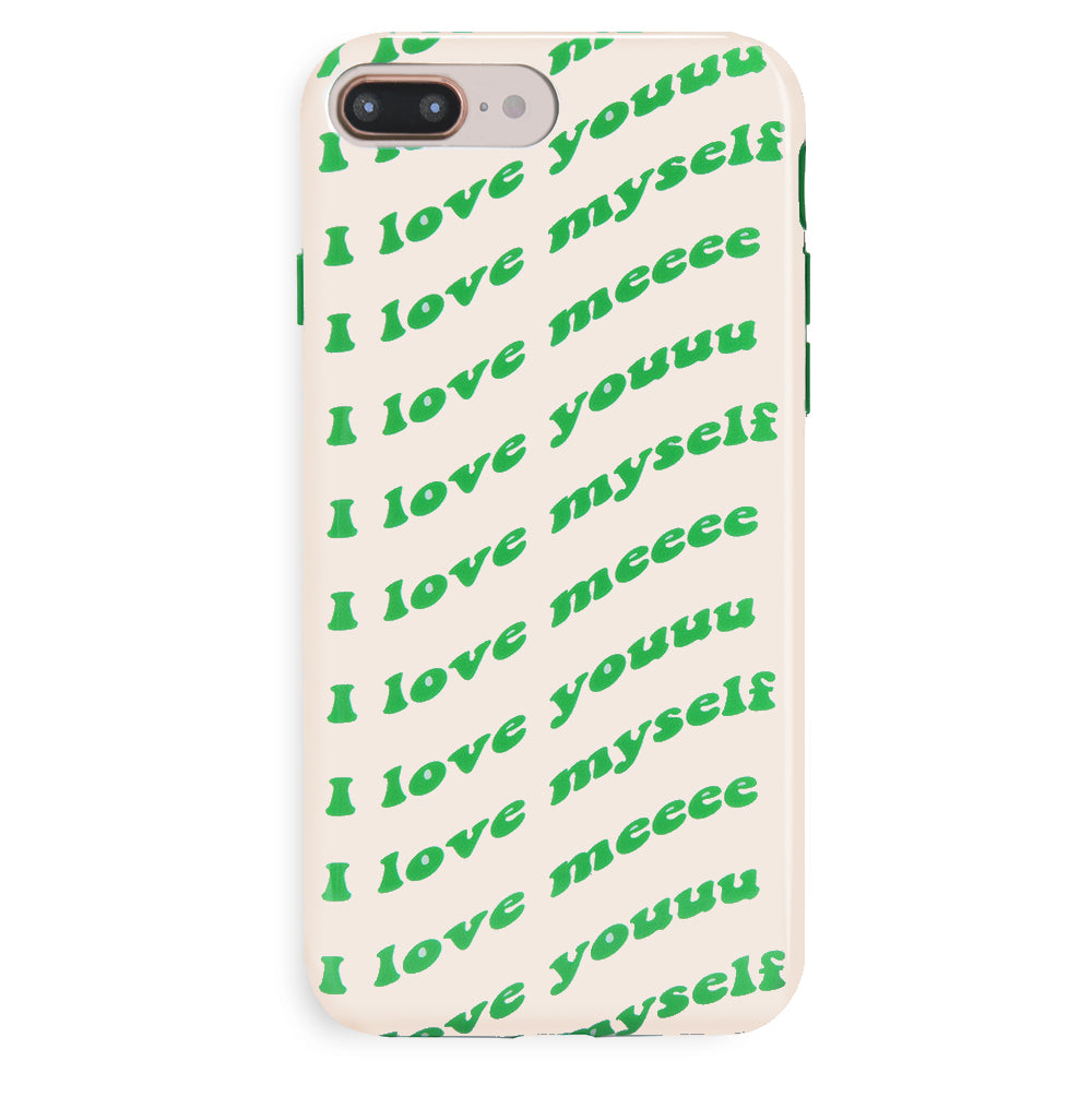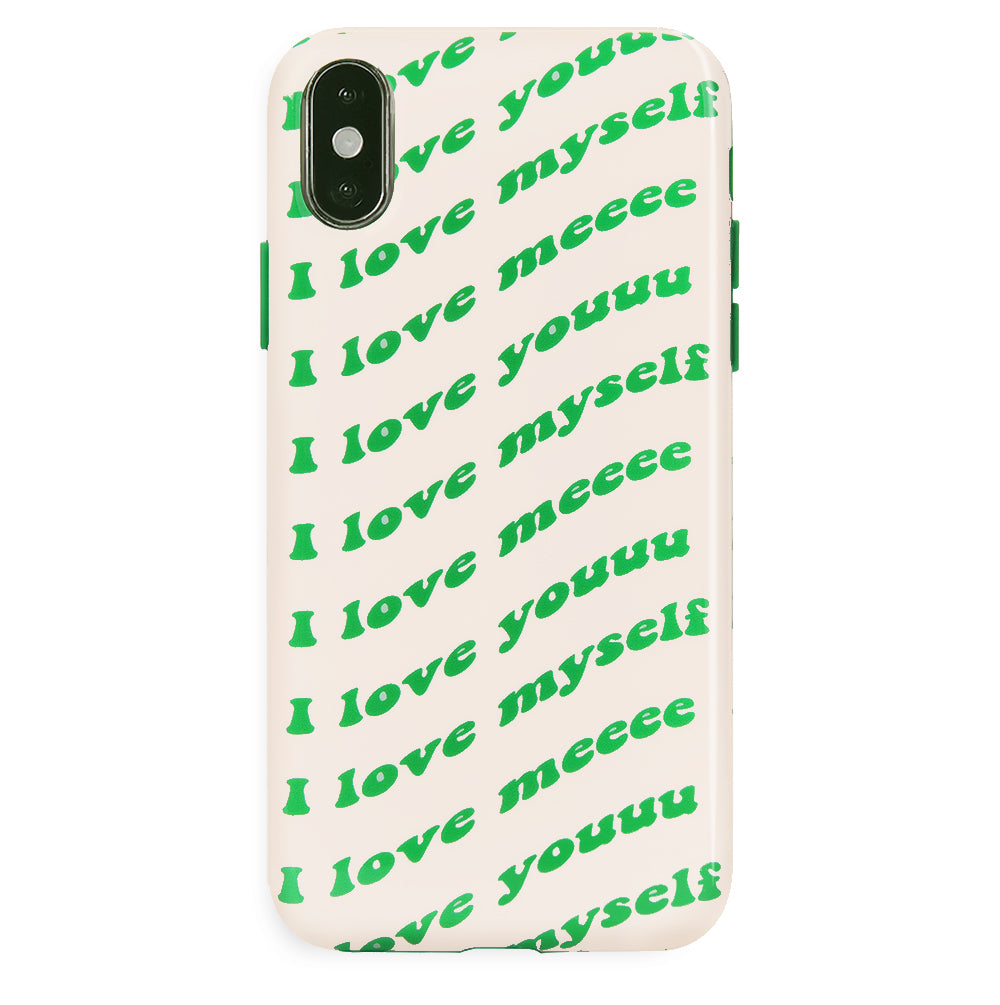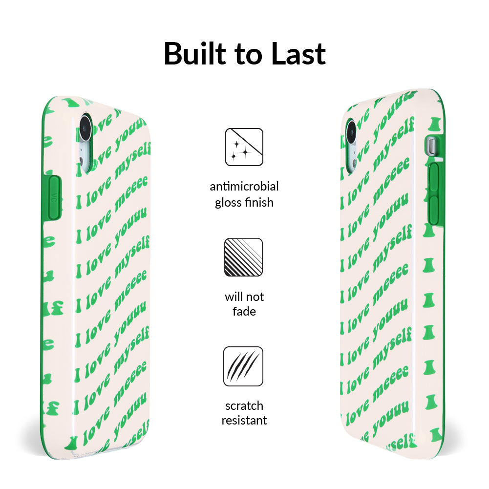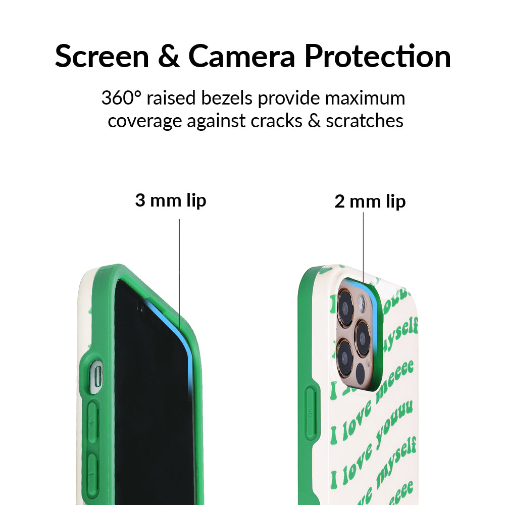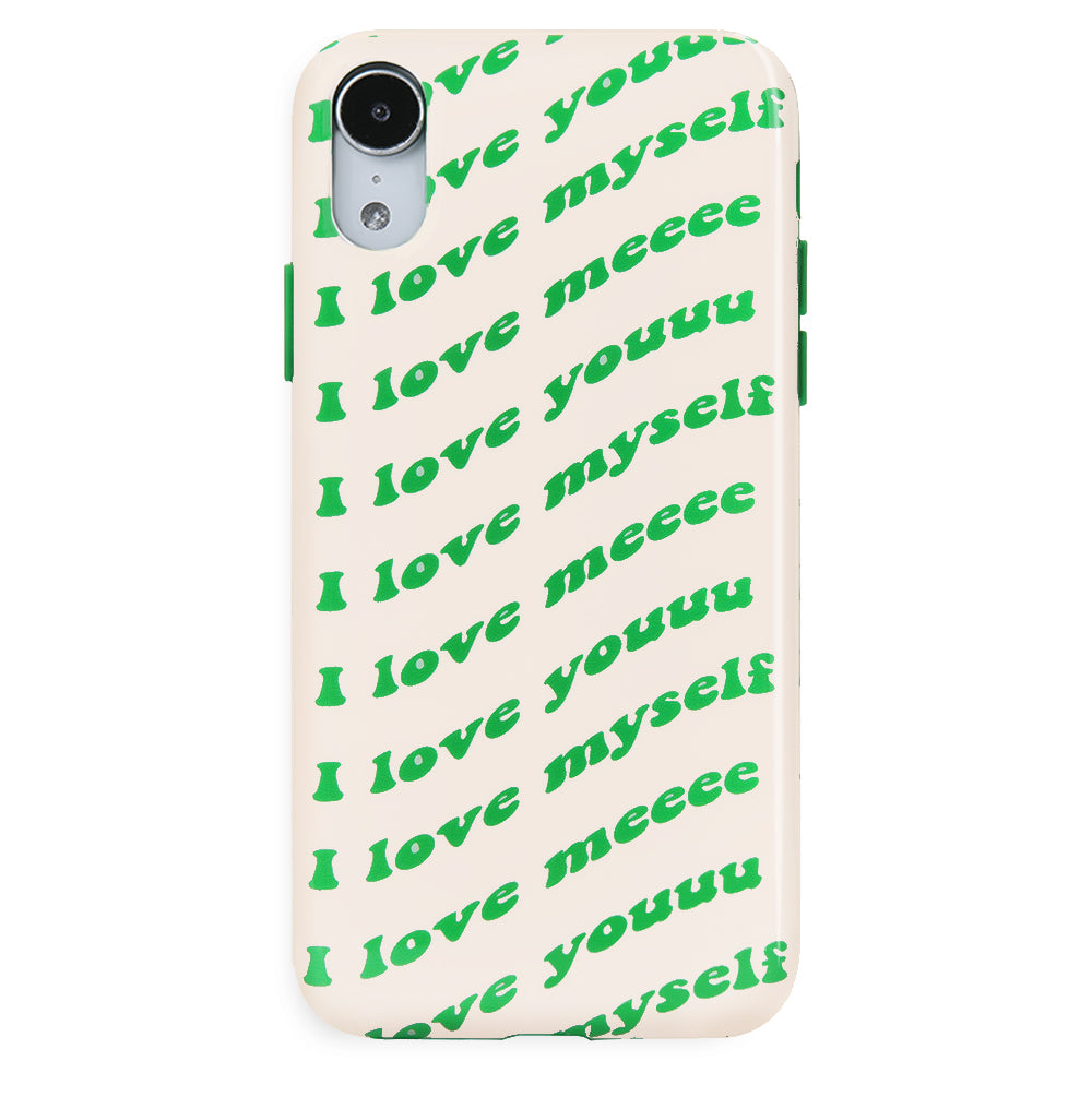 Self love is the best love! Radiate positive vibes & good energy. This protective opaque case features a glossy cream base with kelly green words of empowerment. Finished with a matching green bumper this case is a beautiful reminder to love yourself always.