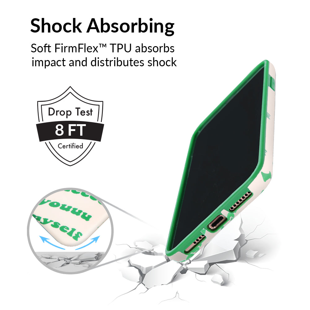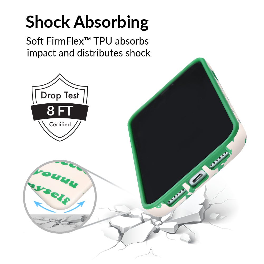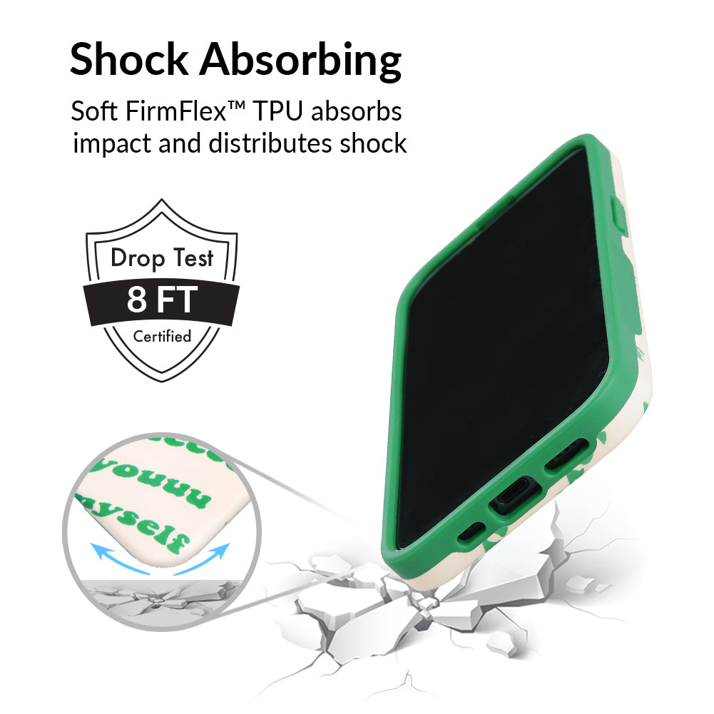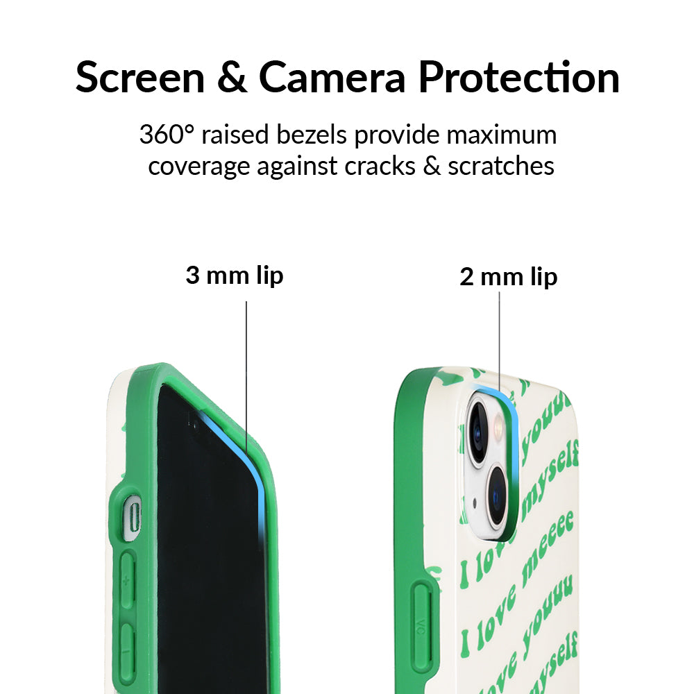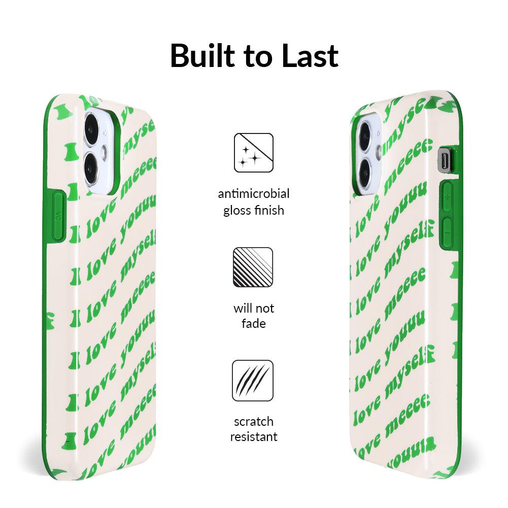 Self love is the best love! Radiate positive vibes & good energy. This protective opaque case features a glossy cream base with kelly green words of empowerment. Finished with a matching green bumper this case is a beautiful reminder to love yourself always.