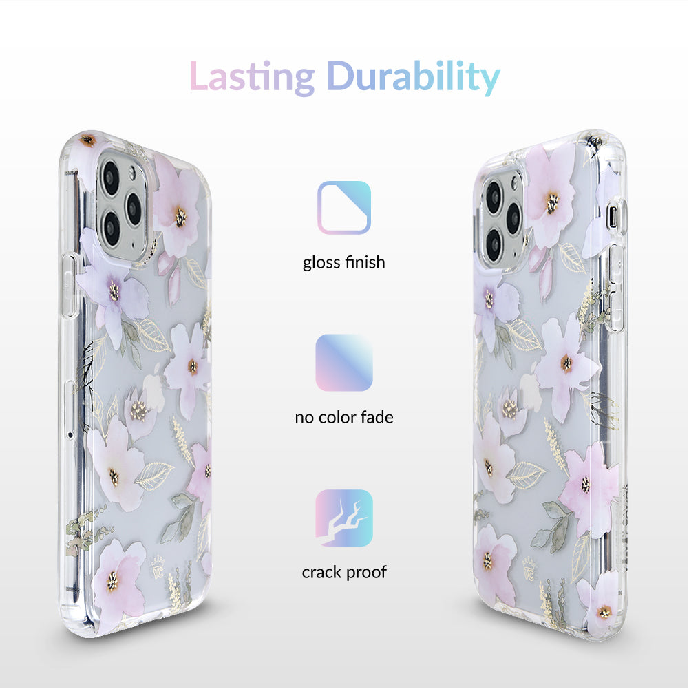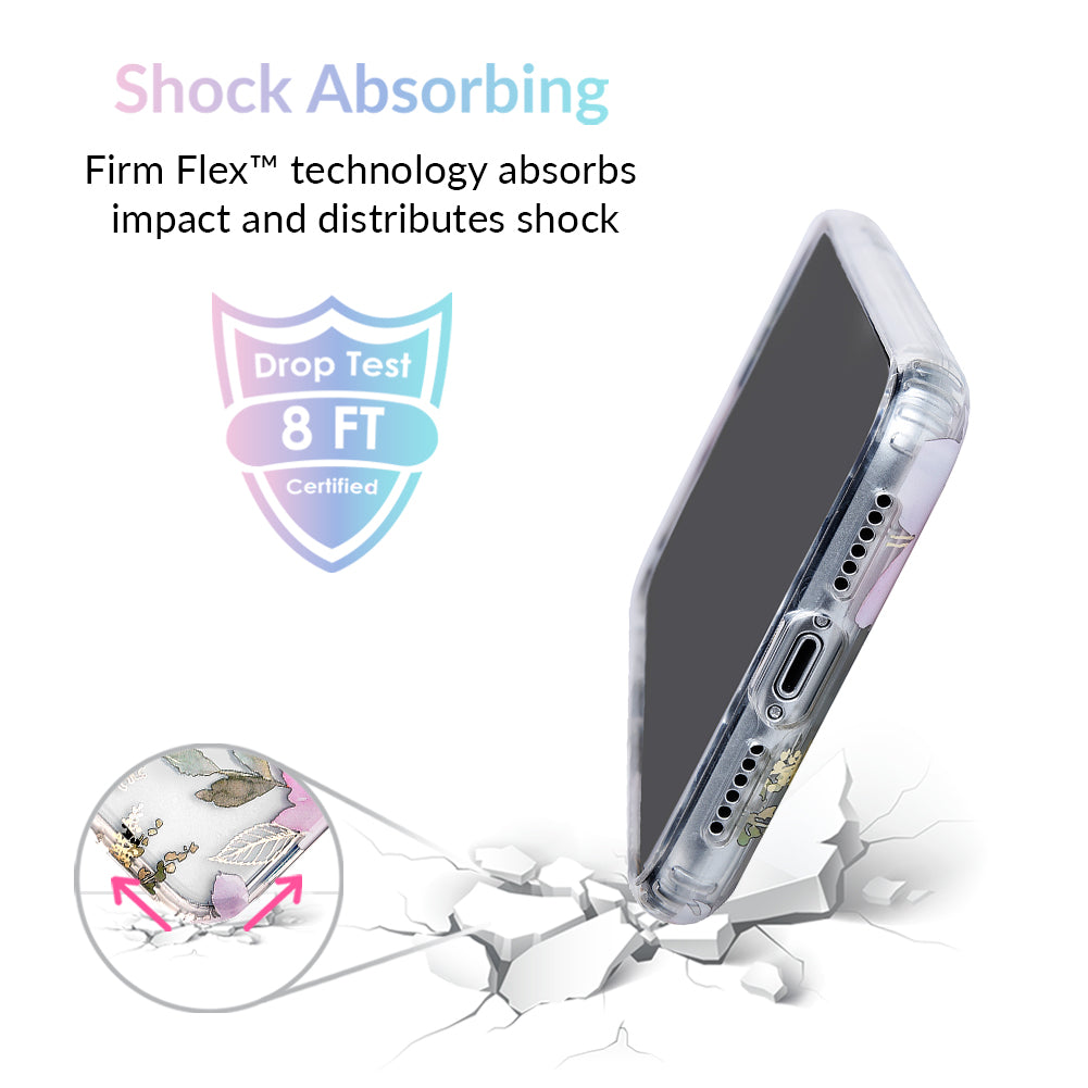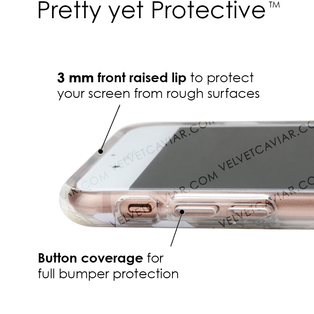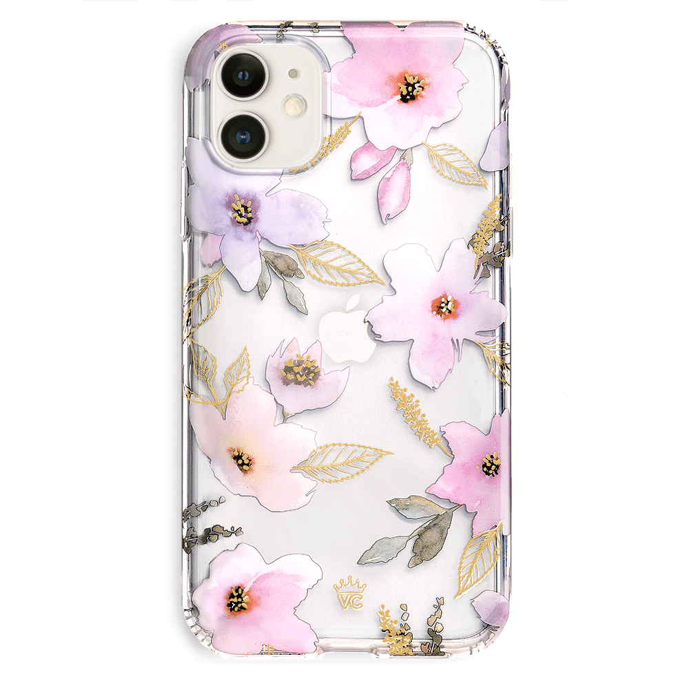 Inspired by the Magnolia flower's essence of Beauty, Endurance, and Health. This protective clear case is covered in beautiful, hand drawn magnolia flowers with delicate, metallic gold detailing.