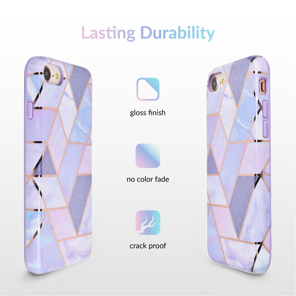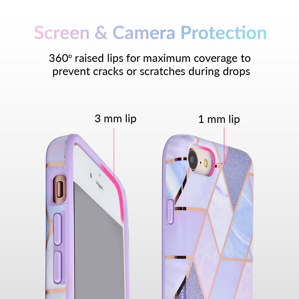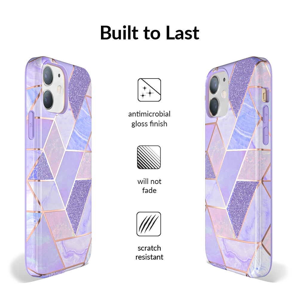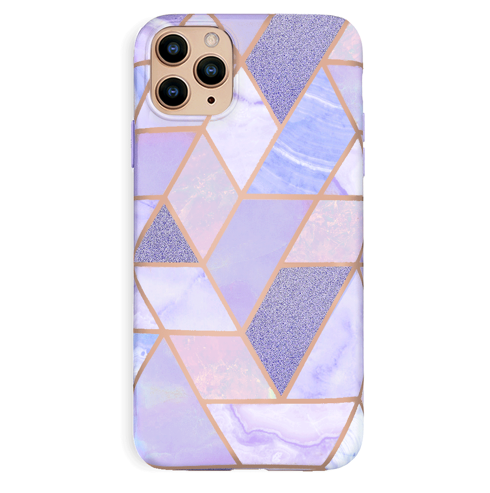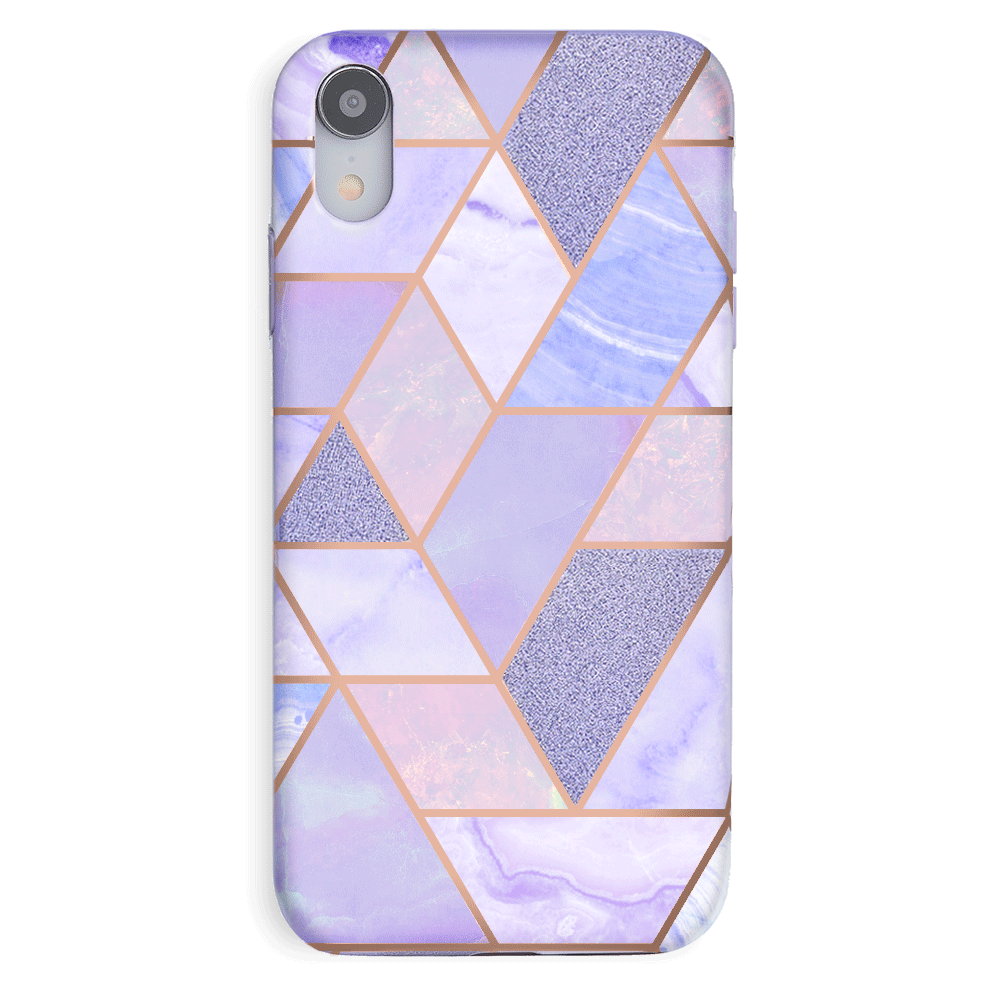 A purple beauty! Featuring a geometric pastel purple marble pattern, outlined in rose gold chrome. As always, paired with a matching blush purple bumper for added screen protection against drops.