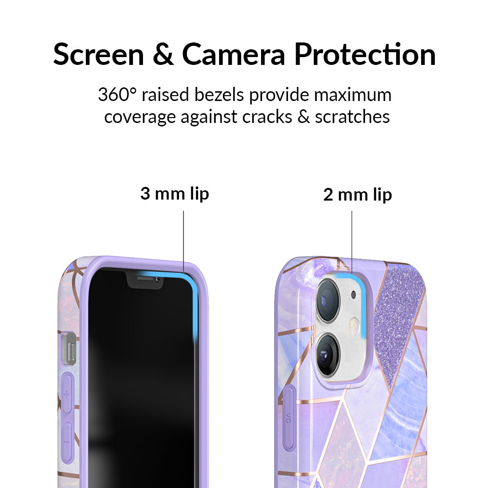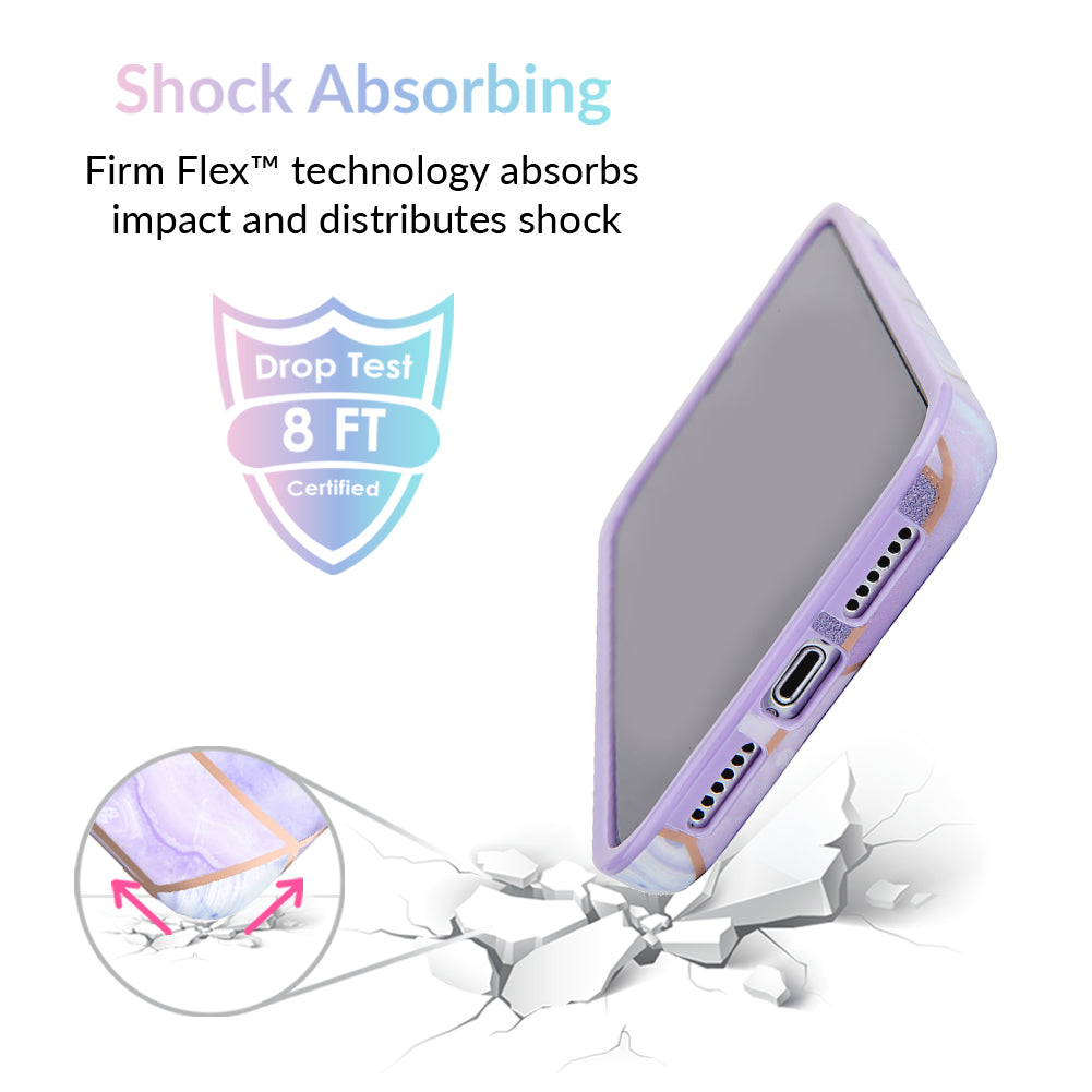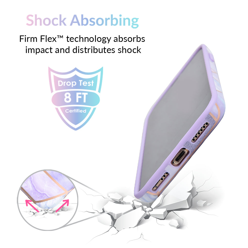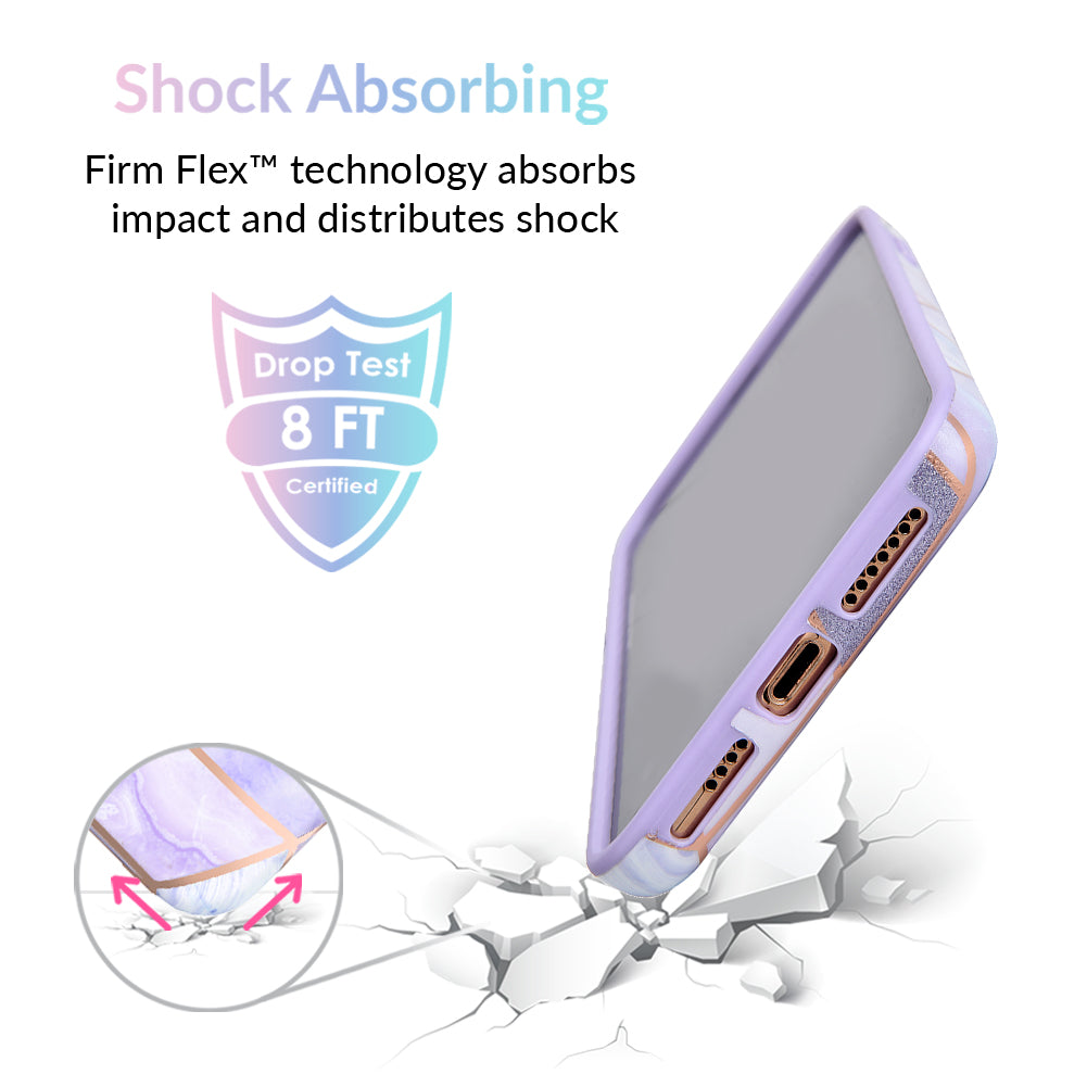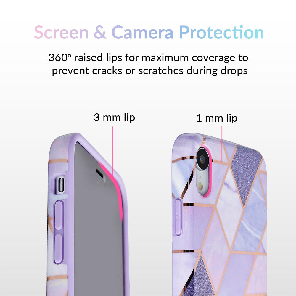 A purple beauty! Featuring a geometric pastel purple marble pattern, outlined in rose gold chrome. As always, paired with a matching blush purple bumper for added screen protection against drops.