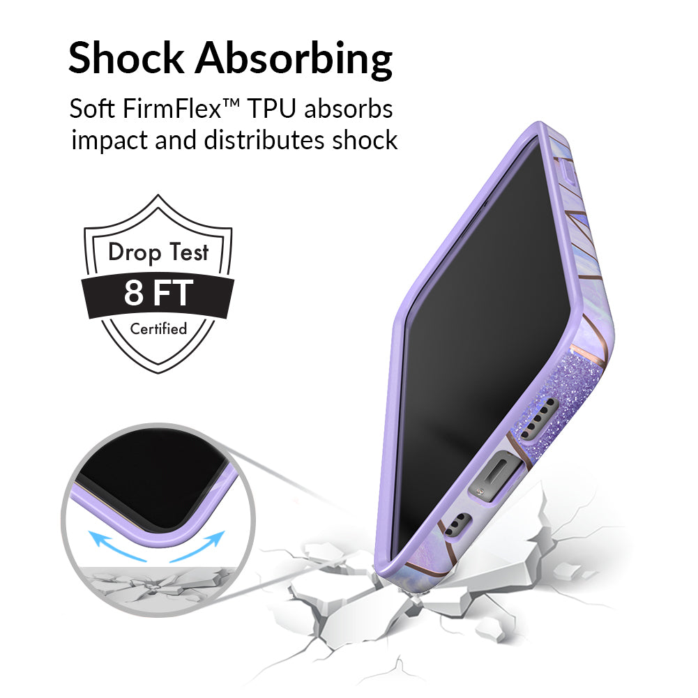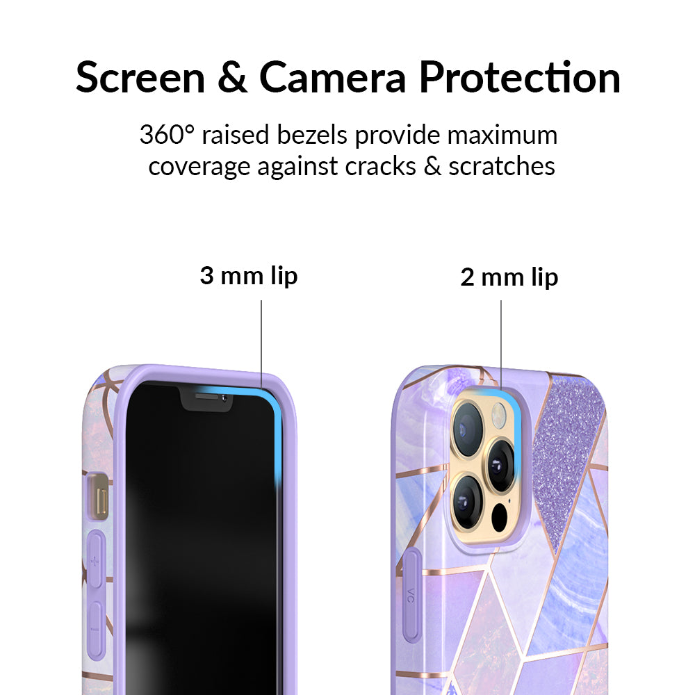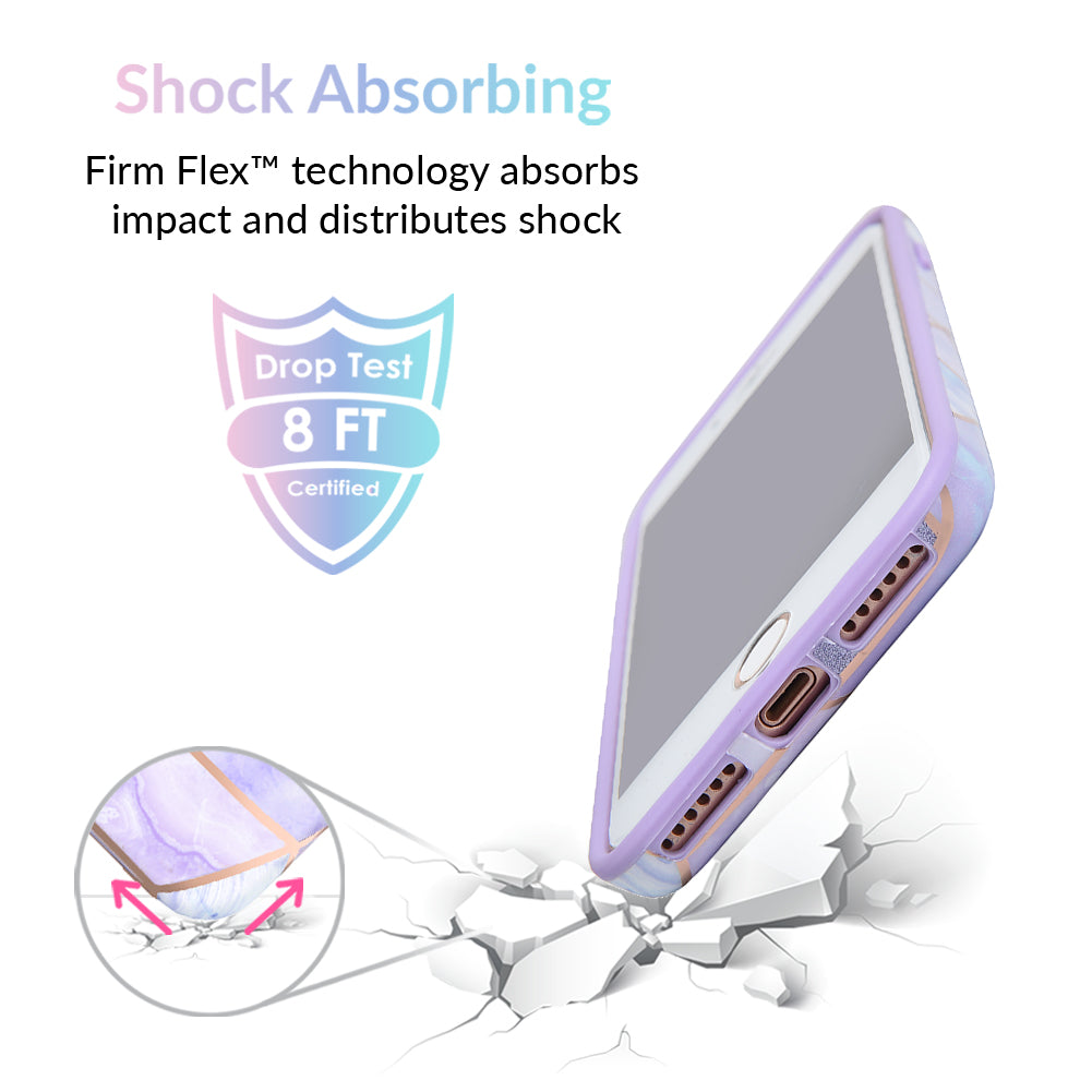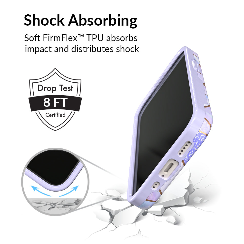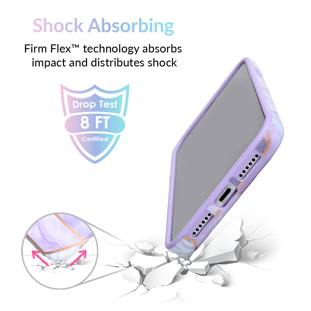A purple beauty! Featuring a geometric pastel purple marble pattern, outlined in rose gold chrome. As always, paired with a matching blush purple bumper for added screen protection against drops.