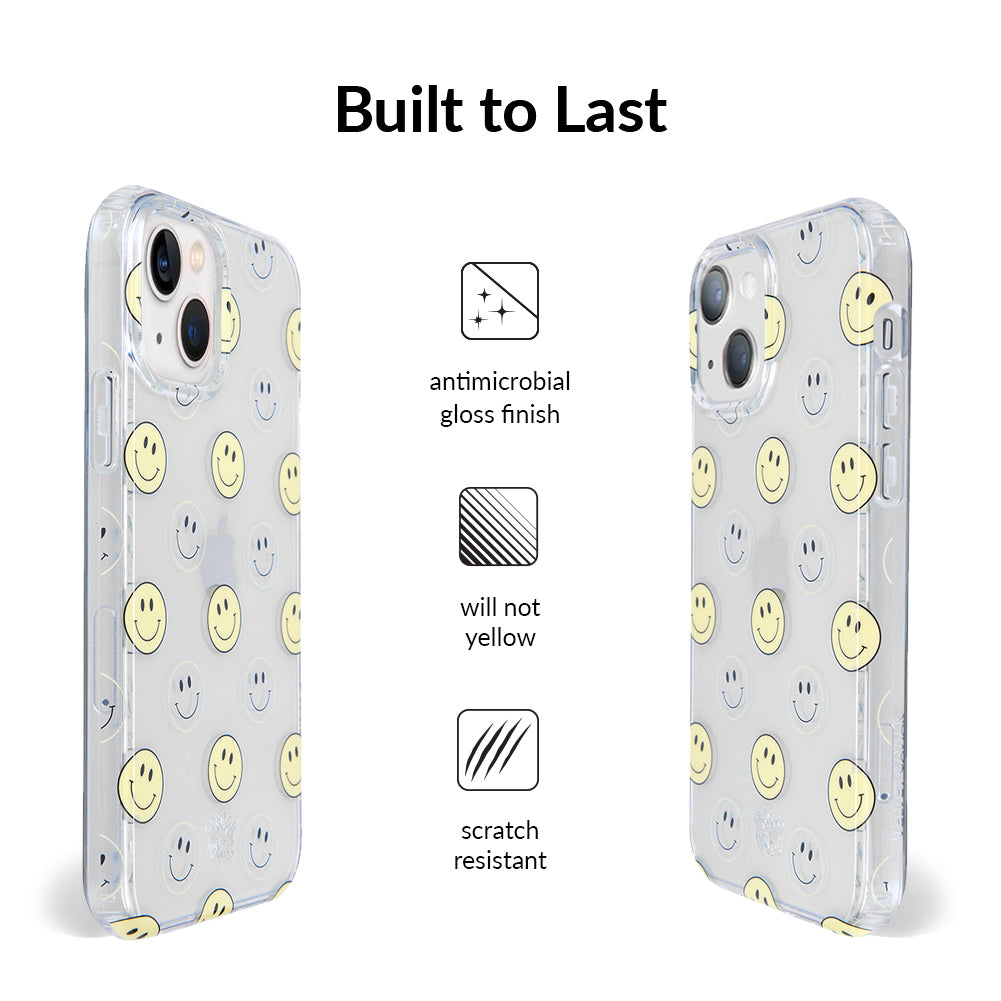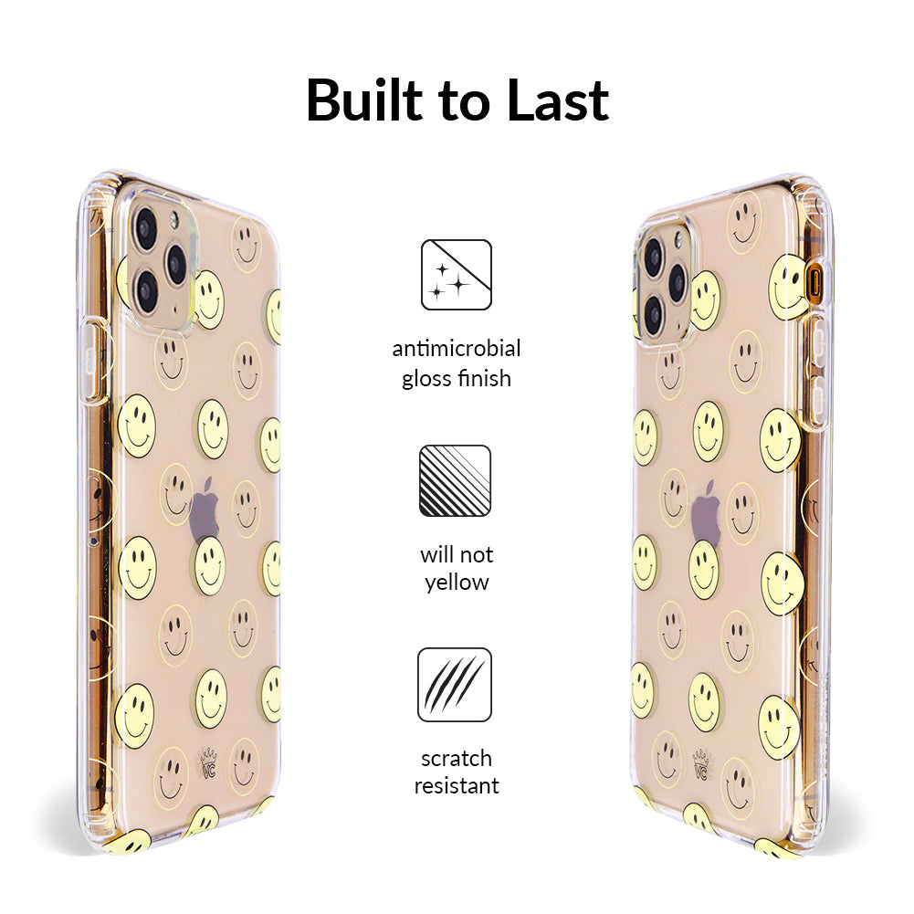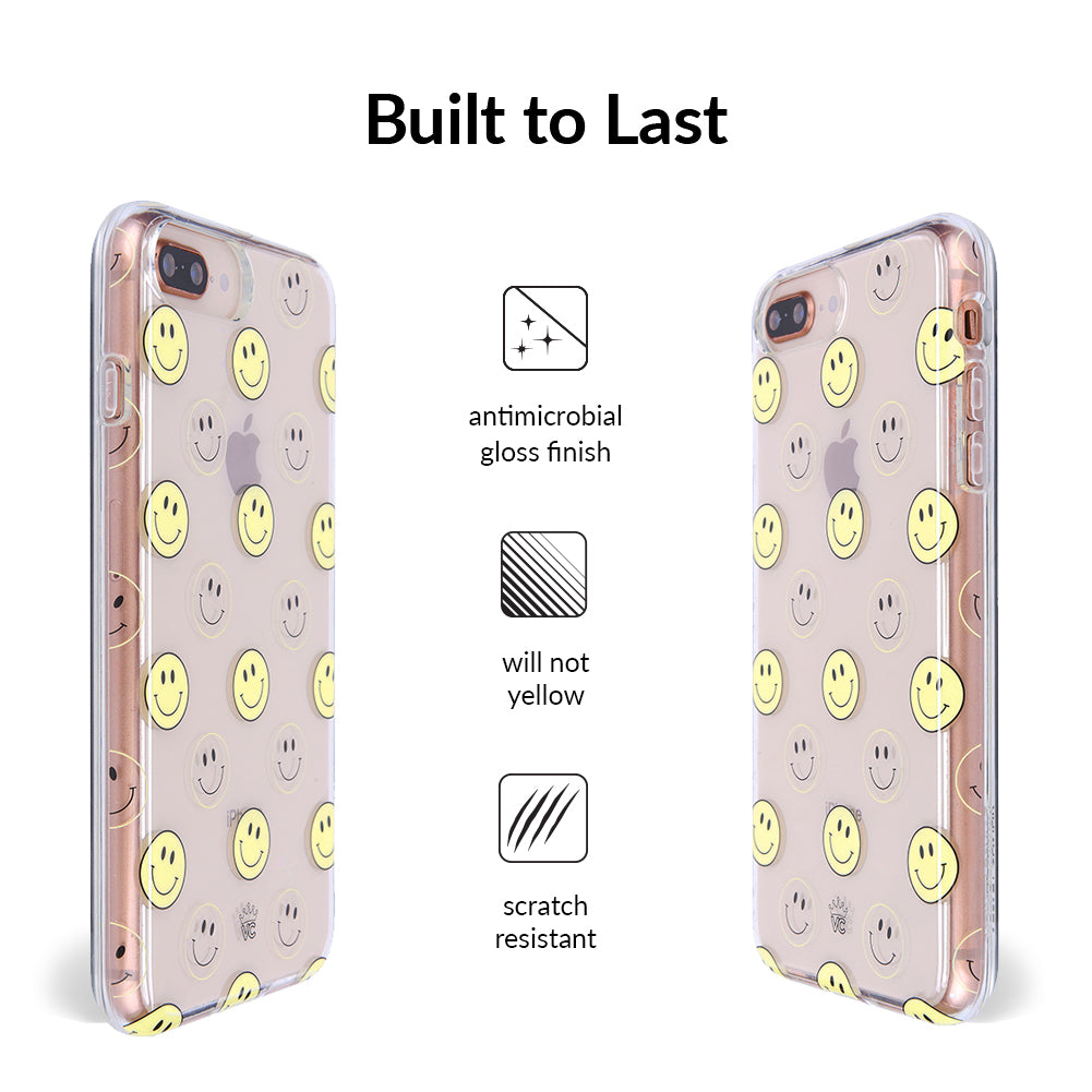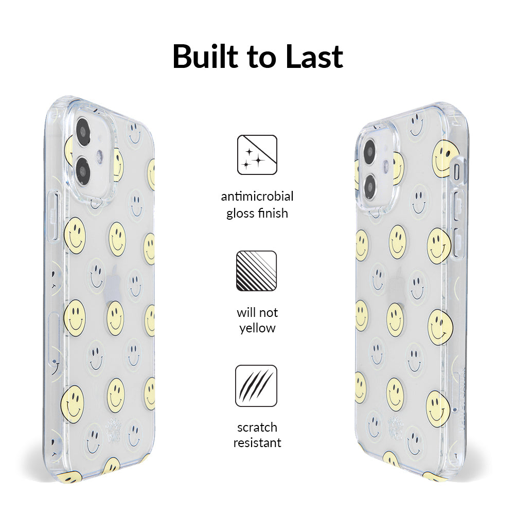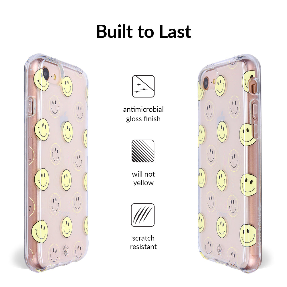 A not so subtle reminder to SMILE! This playful but protective case features a clear background with a alternating clear and filled happy smiley faces. It comes in a gloss finish with matching bumper to protect against drops!