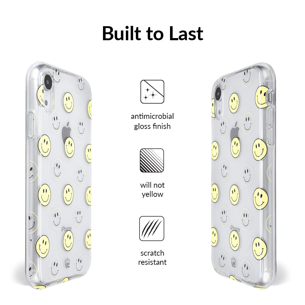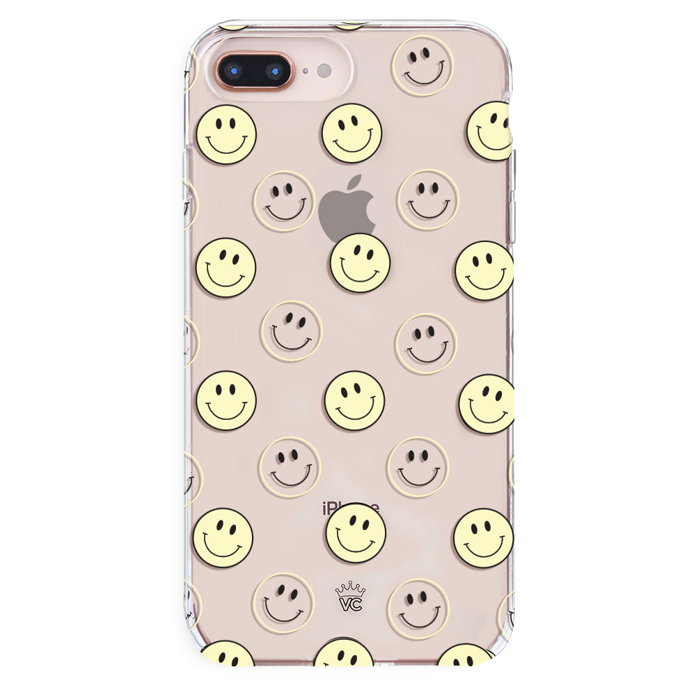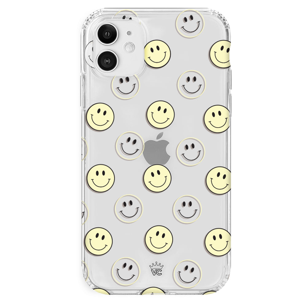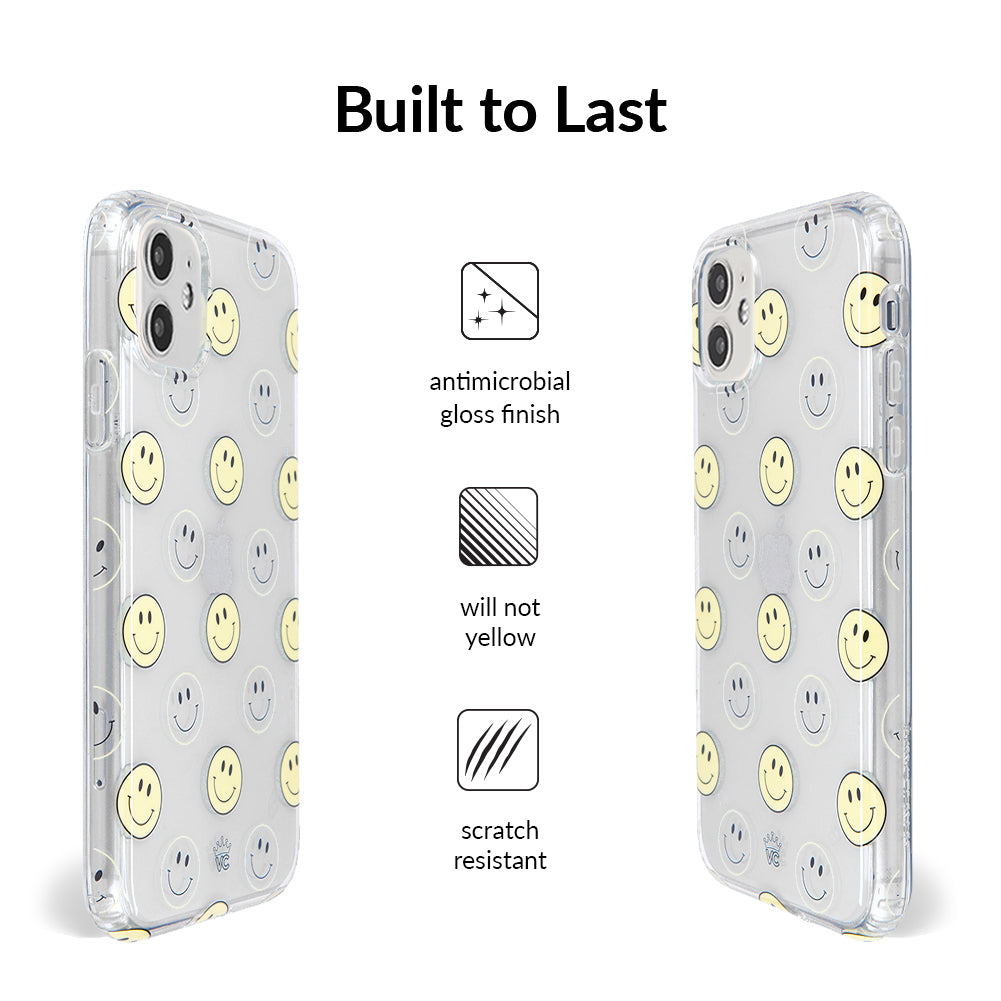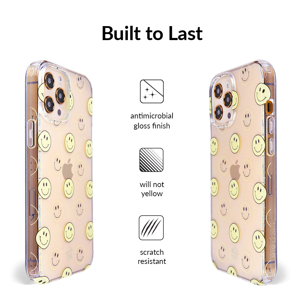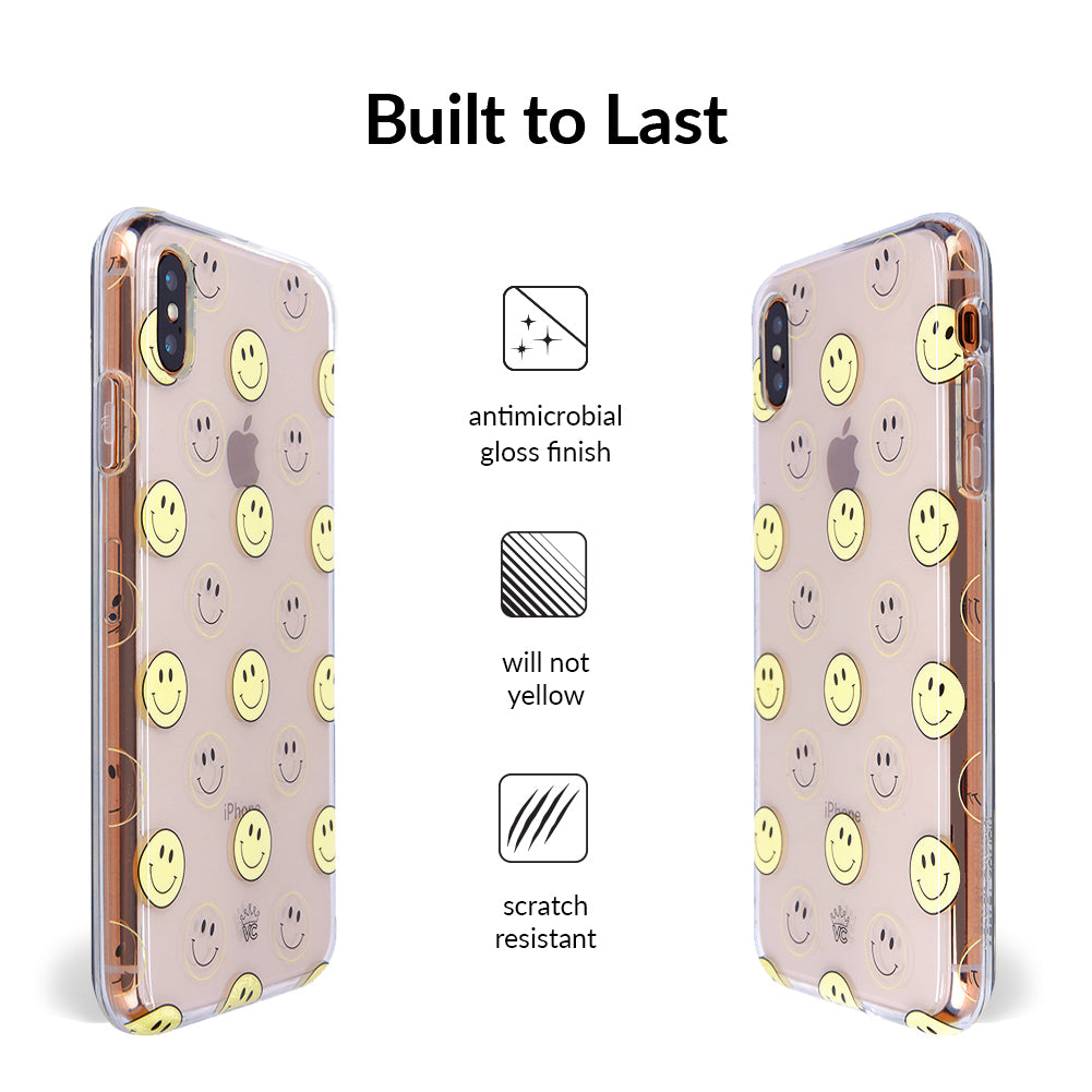A not so subtle reminder to SMILE! This playful but protective case features a clear background with a alternating clear and filled happy smiley faces. It comes in a gloss finish with matching bumper to protect against drops!