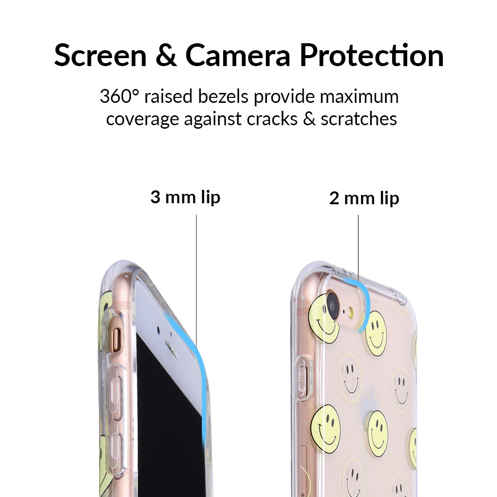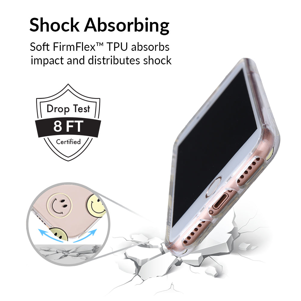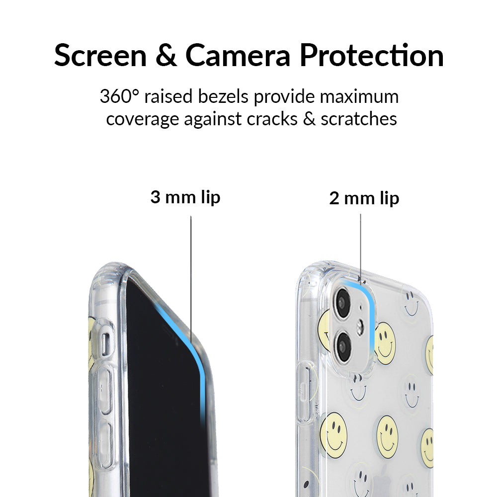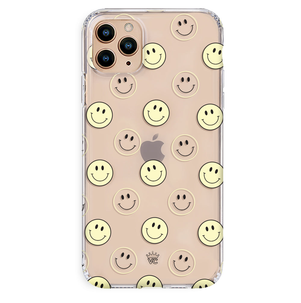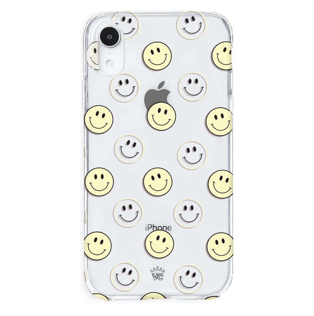 A not so subtle reminder to SMILE! This playful but protective case features a clear background with a alternating clear and filled happy smiley faces. It comes in a gloss finish with matching bumper to protect against drops!