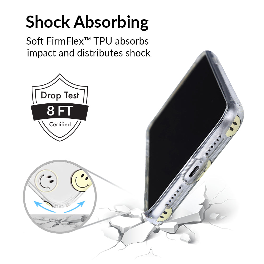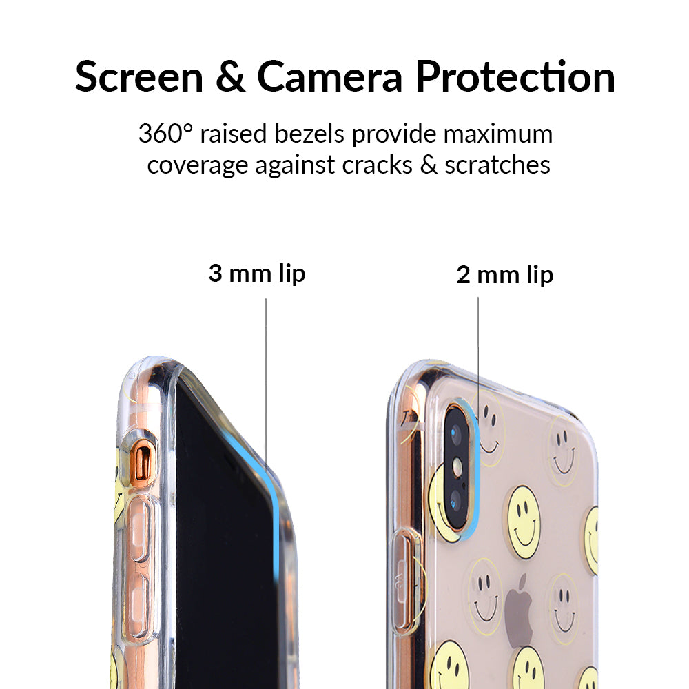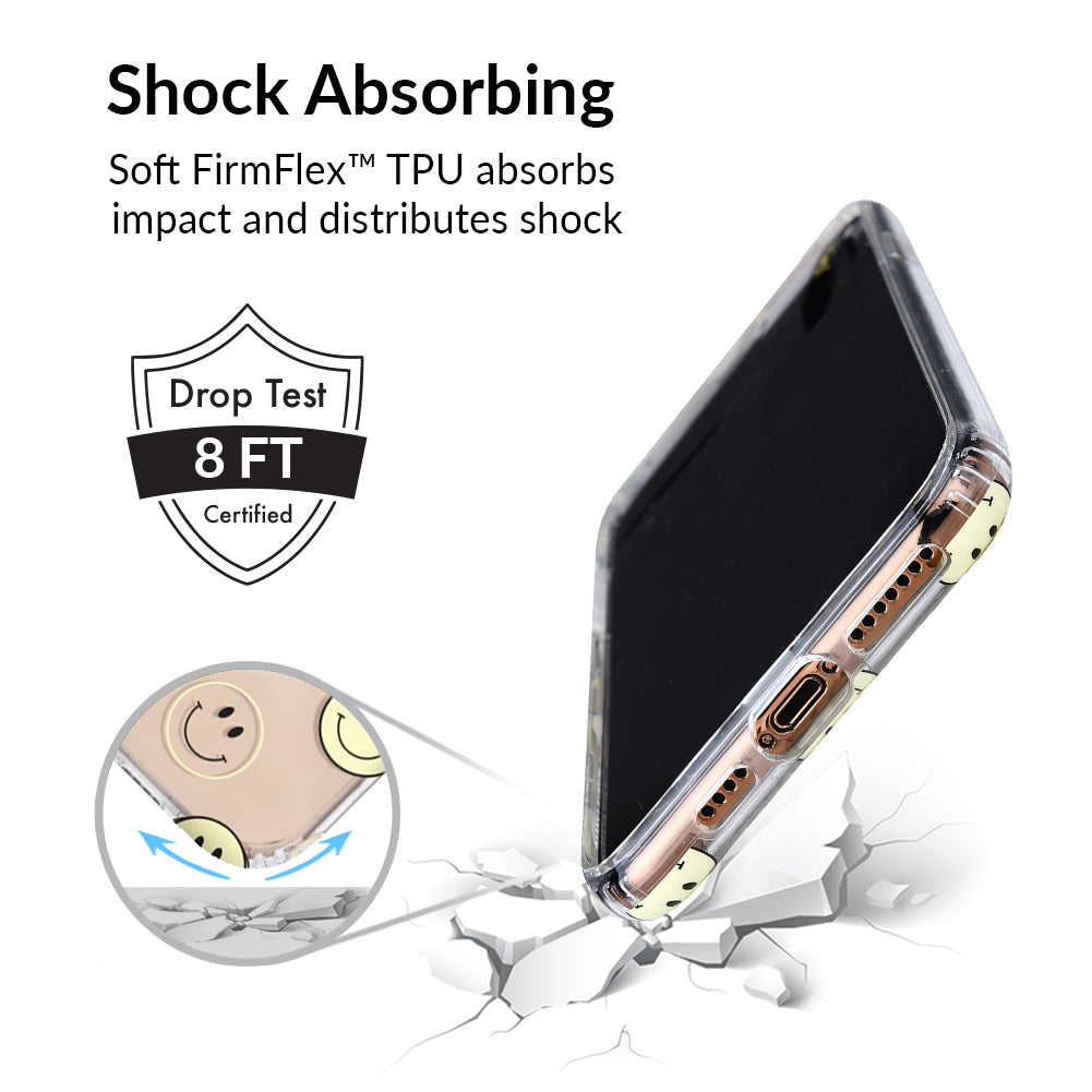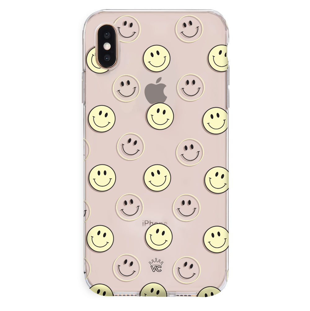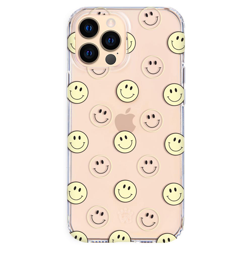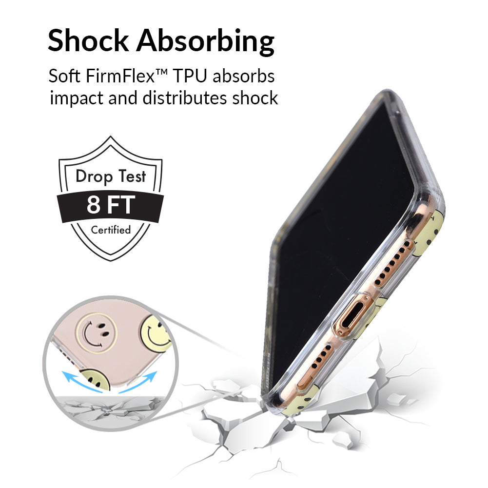 A not so subtle reminder to SMILE! This playful but protective case features a clear background with a alternating clear and filled happy smiley faces. It comes in a gloss finish with matching bumper to protect against drops!