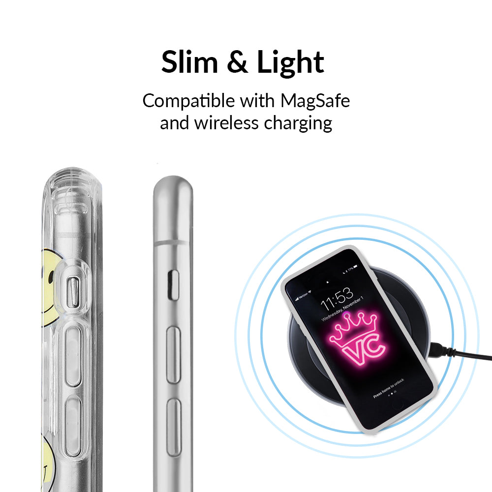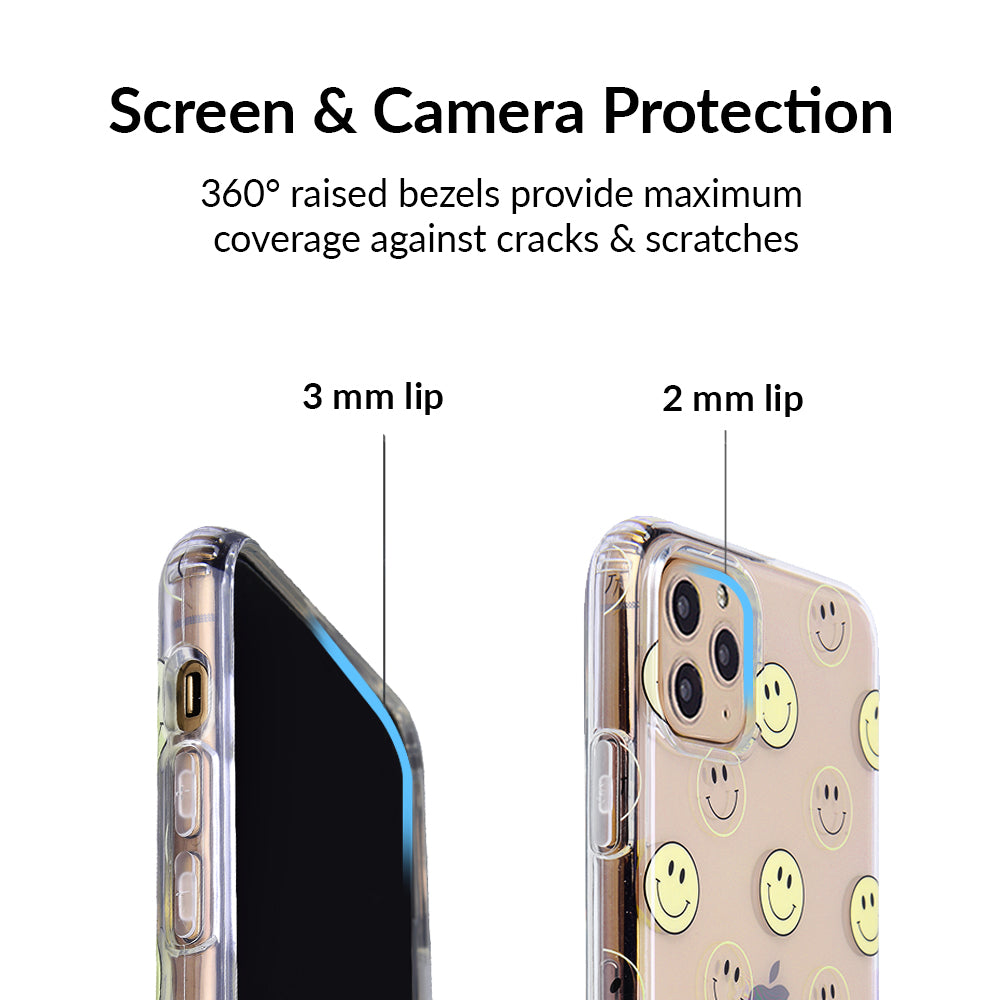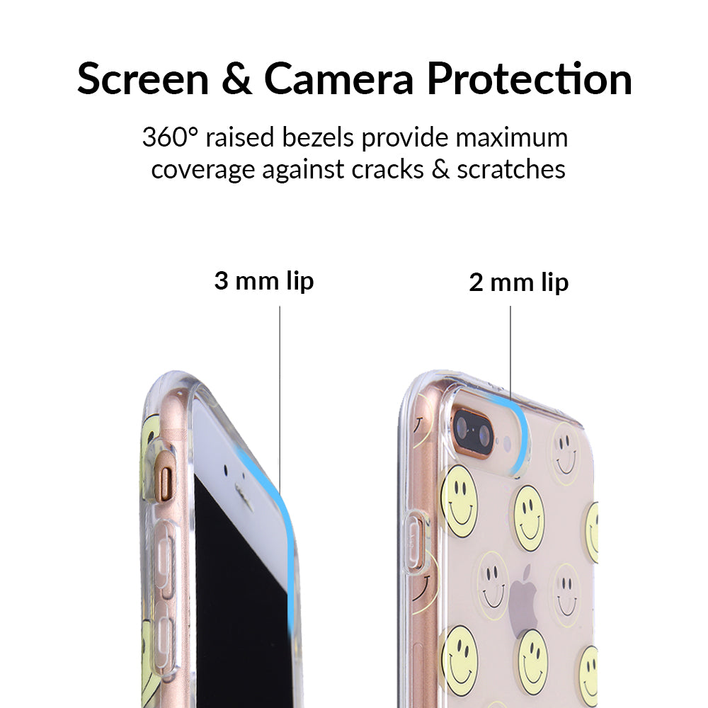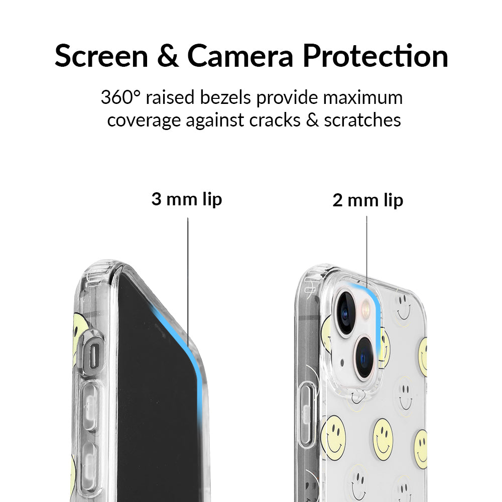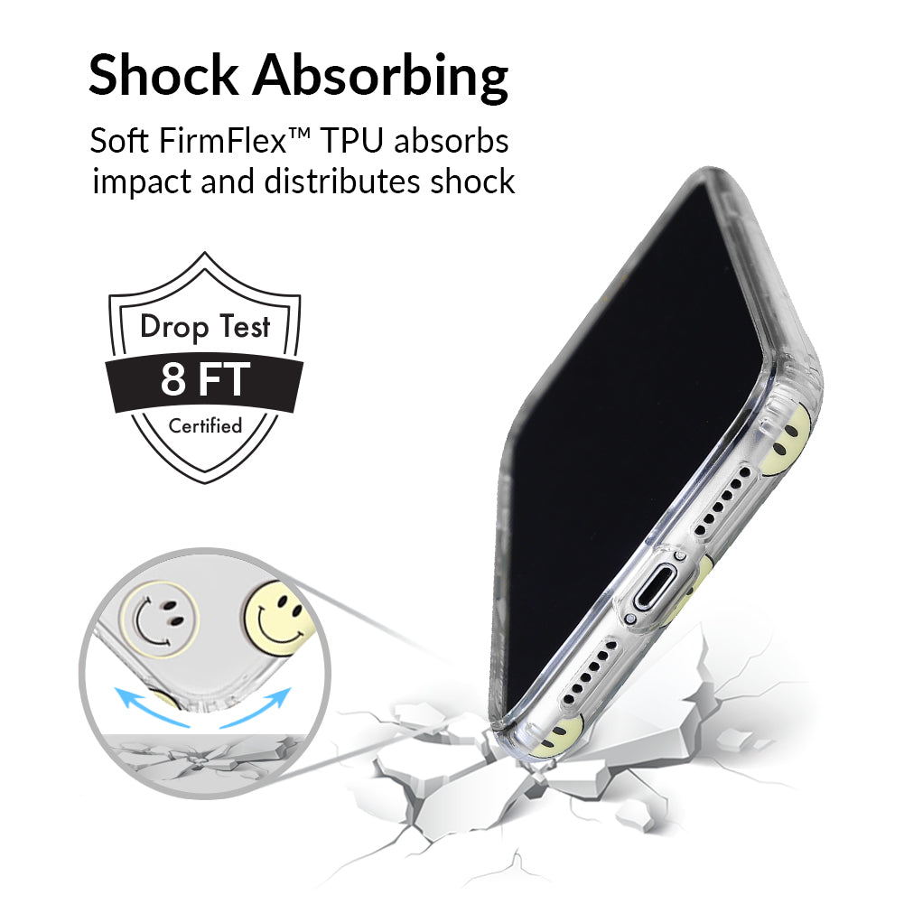 A not so subtle reminder to SMILE! This playful but protective case features a clear background with a alternating clear and filled happy smiley faces. It comes in a gloss finish with matching bumper to protect against drops!