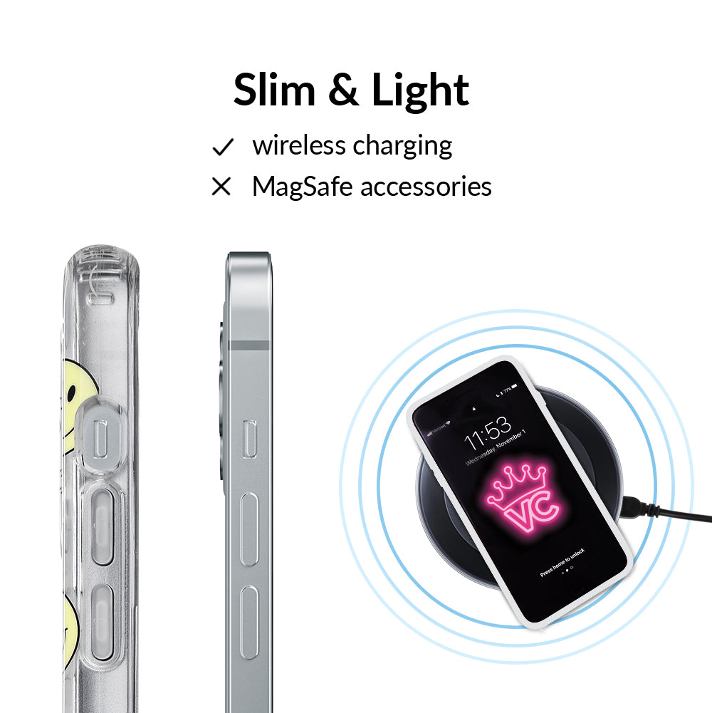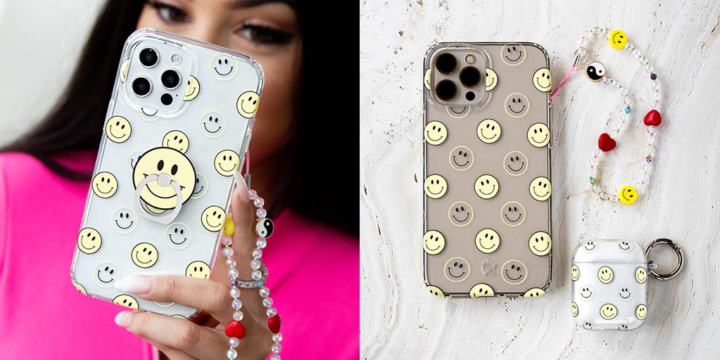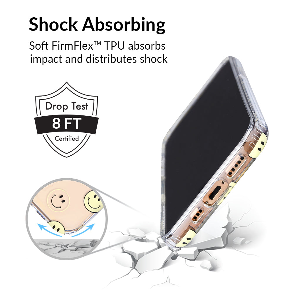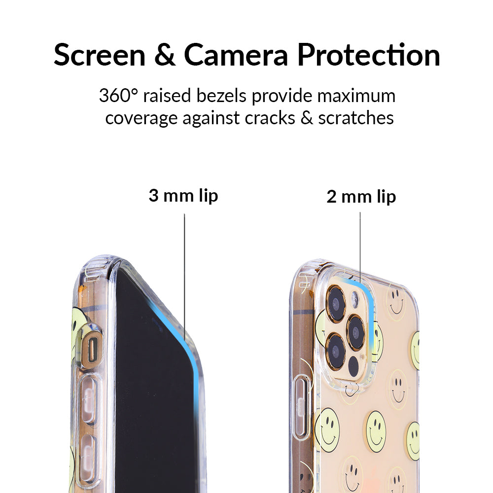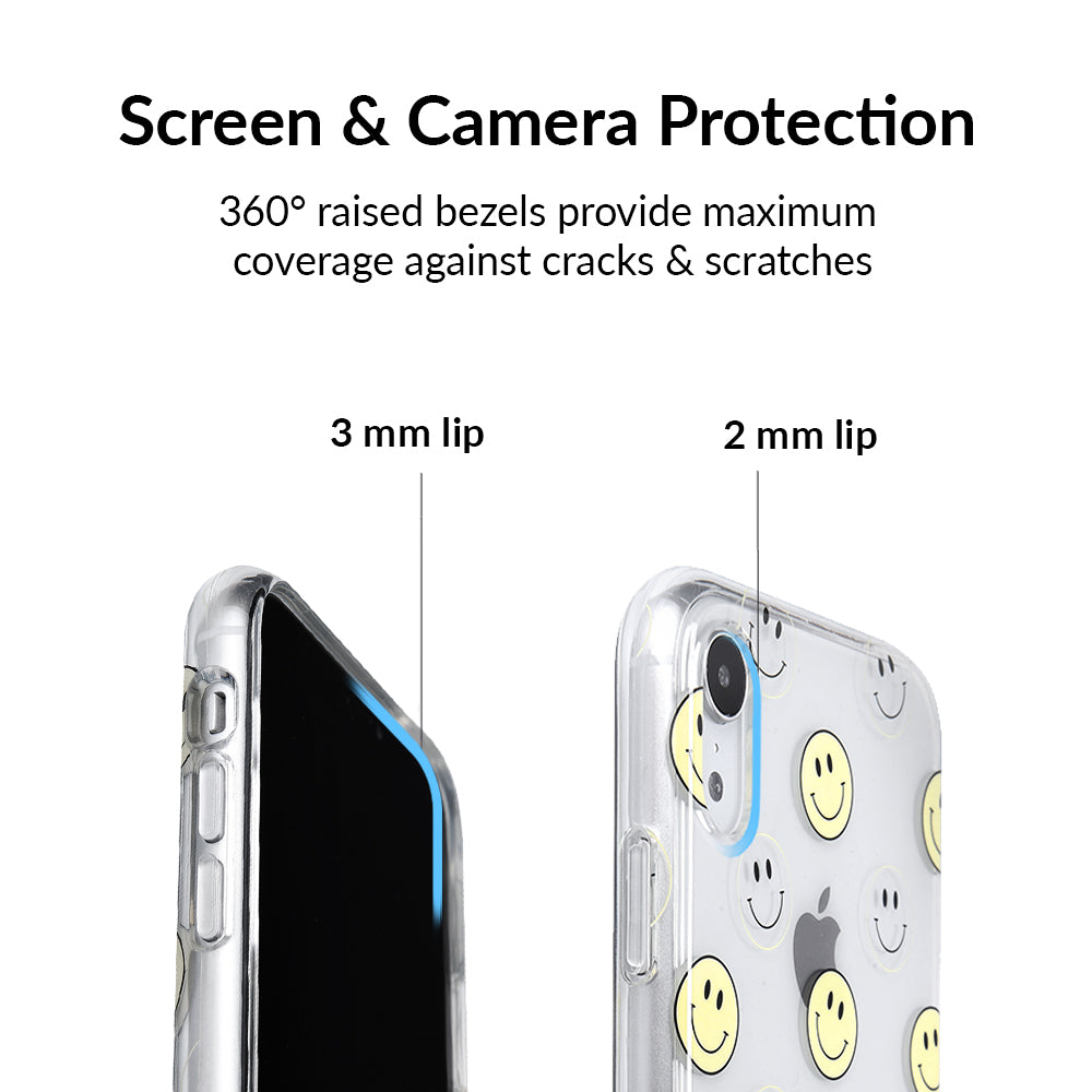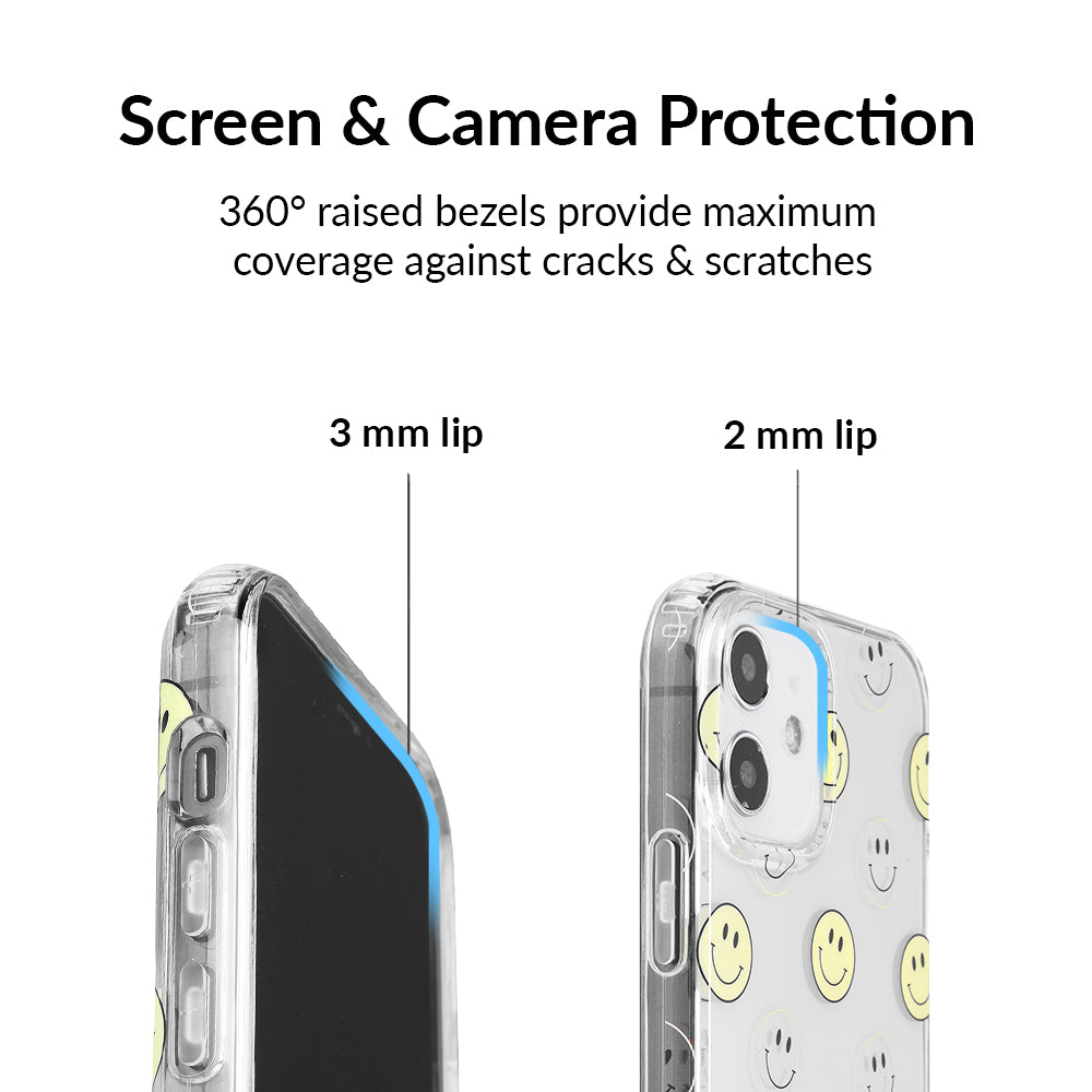 A not so subtle reminder to SMILE! This playful but protective case features a clear background with a alternating clear and filled happy smiley faces. It comes in a gloss finish with matching bumper to protect against drops!
