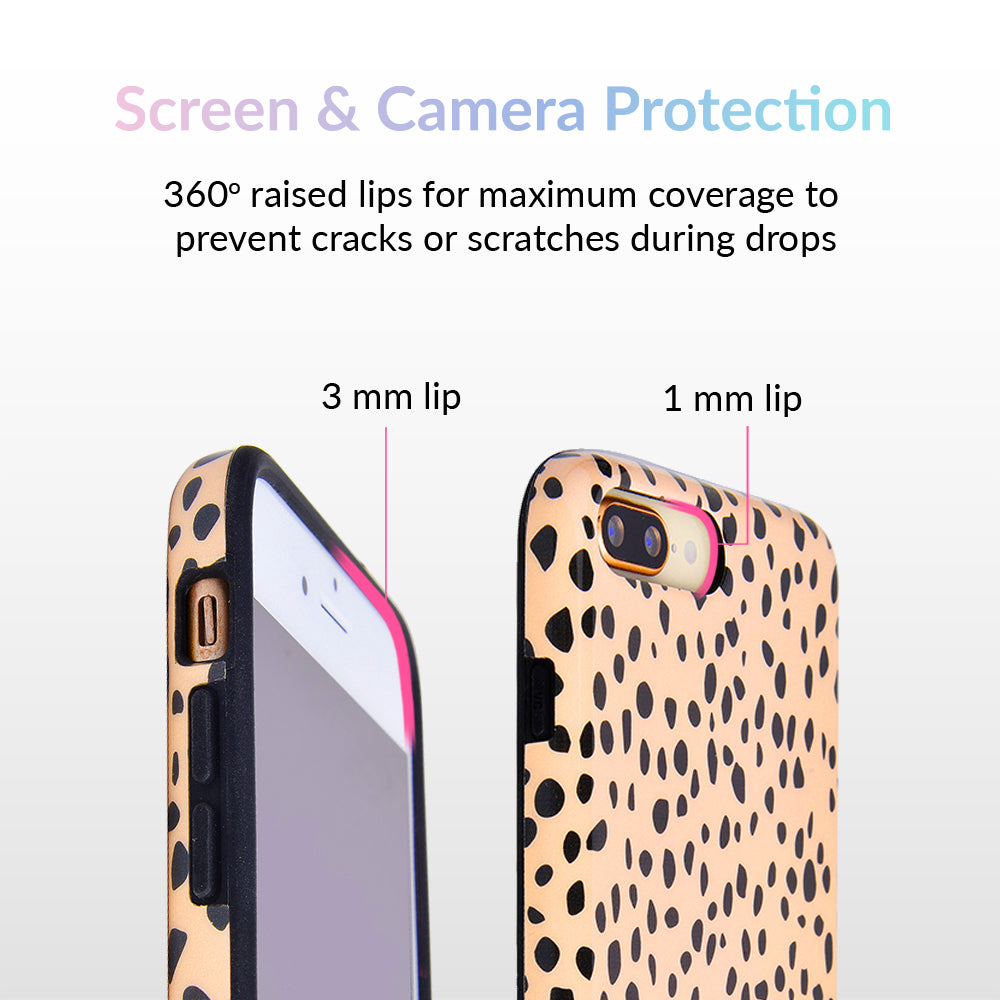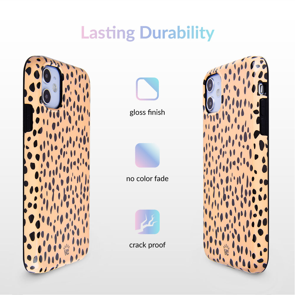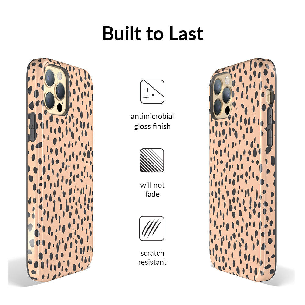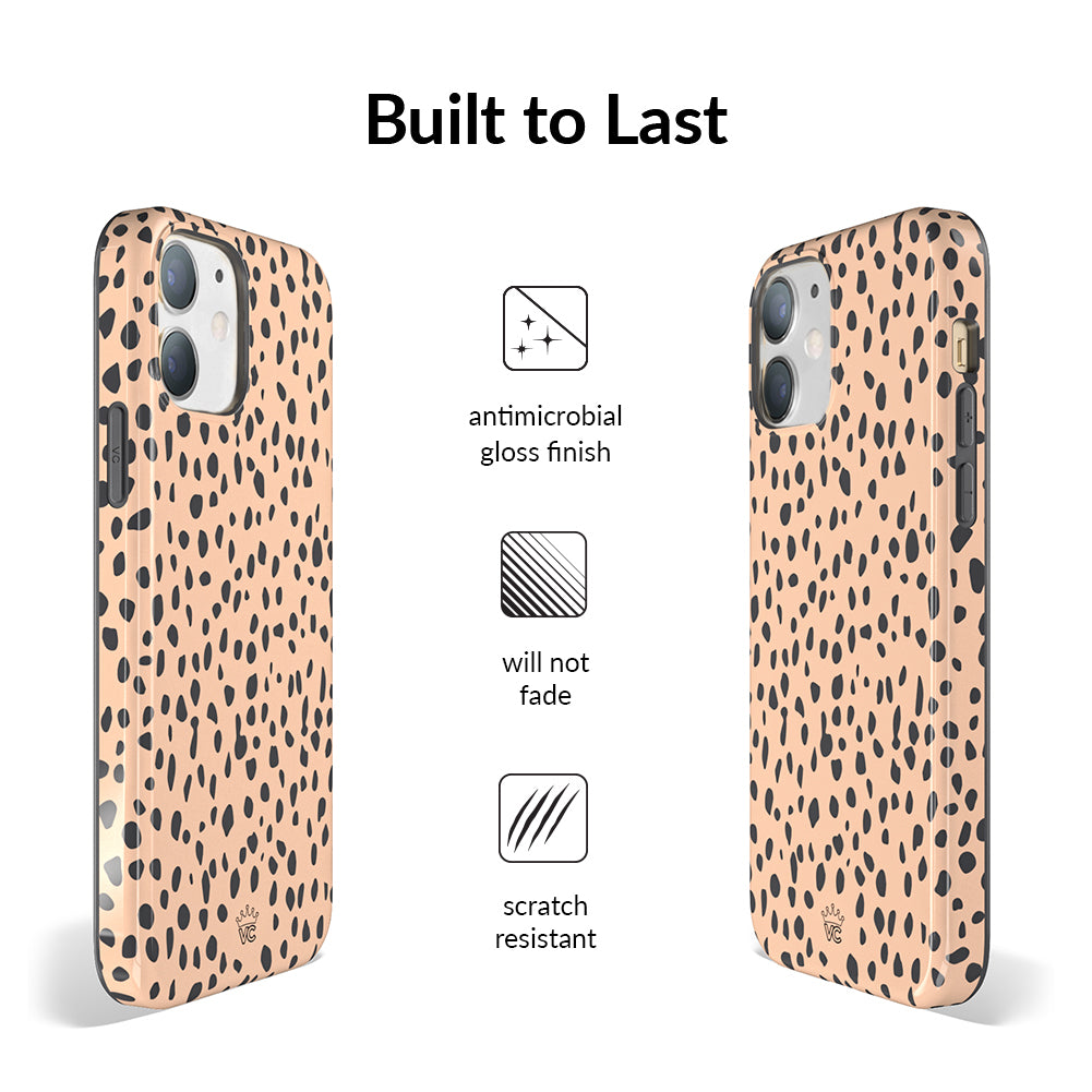 Let out your wild side with the Spotted Nude Cheetah case! Made in the concrete jungle of NY, this protective case features a subtle nude background with black cheetah print spots. It comes in a gloss finish with a matching black bumper for added protection against drops.