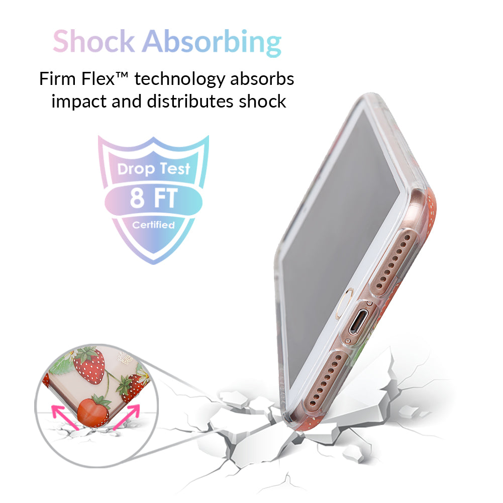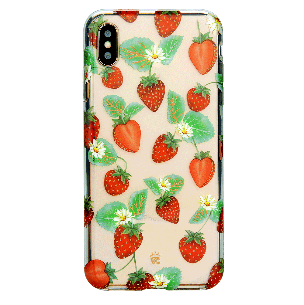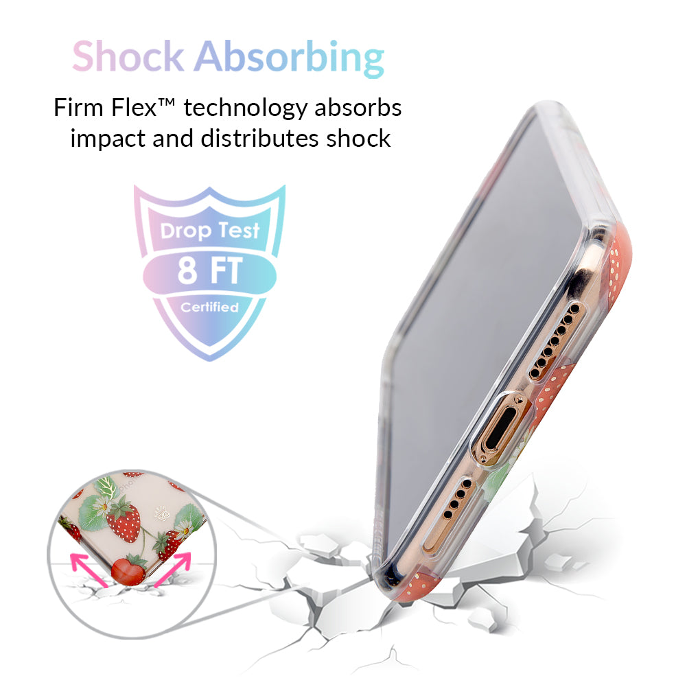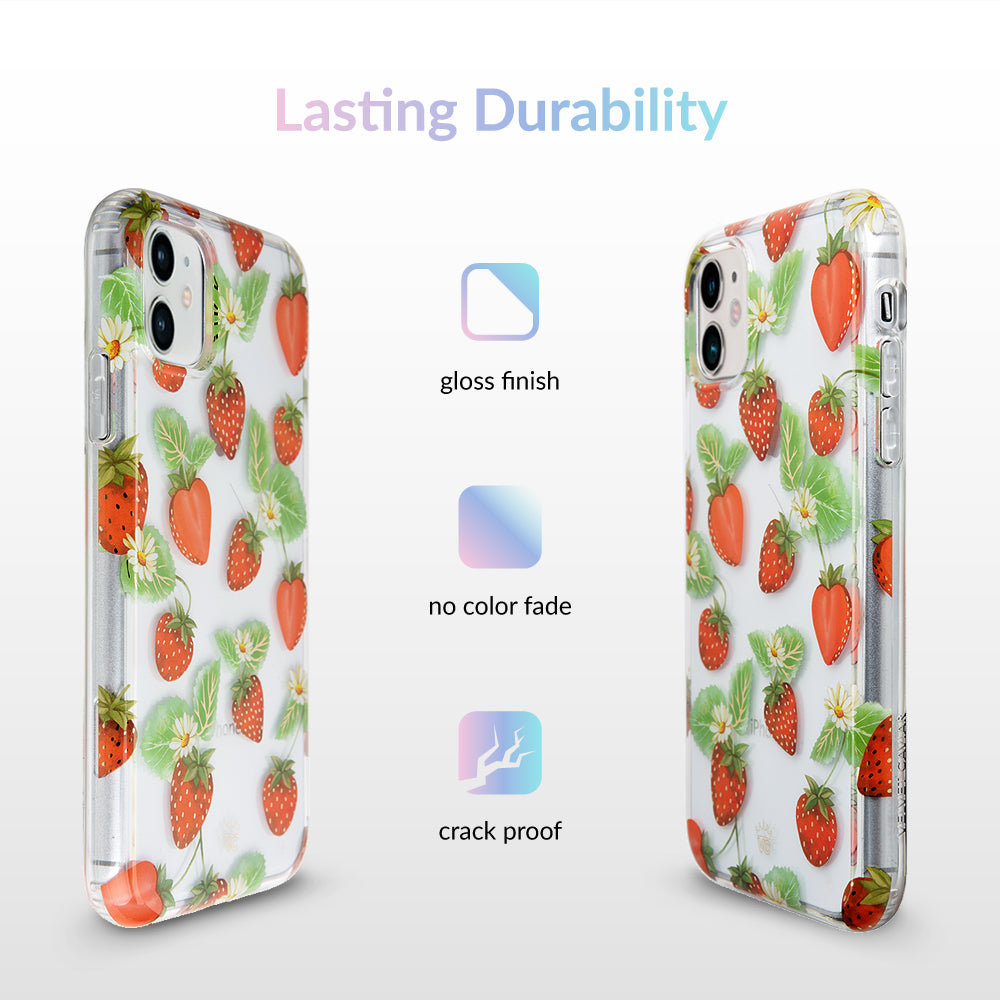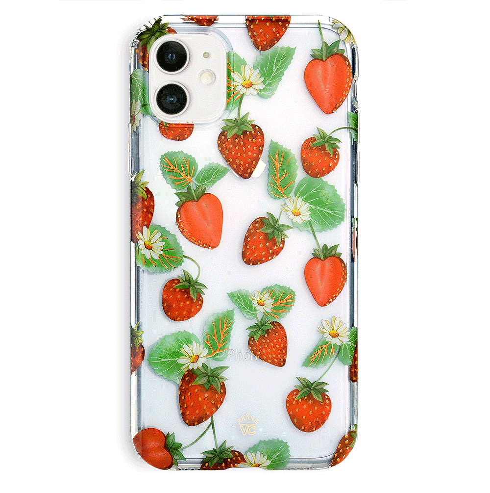 Taste summer with our sweet Strawberry Fields clear case! This protective case has a berry cute hand-drawn strawberry pattern with gold chrome outlines, and a matching clear front bumper for added protection against drops.