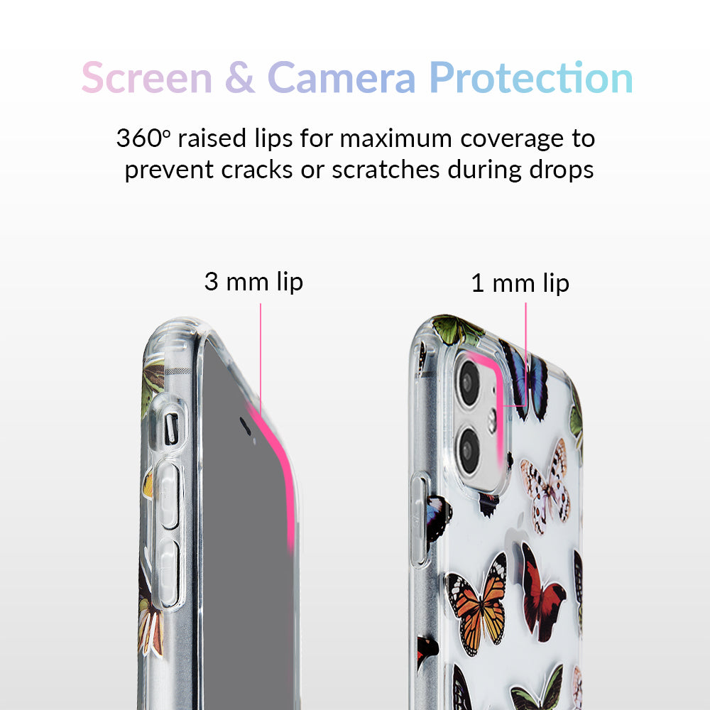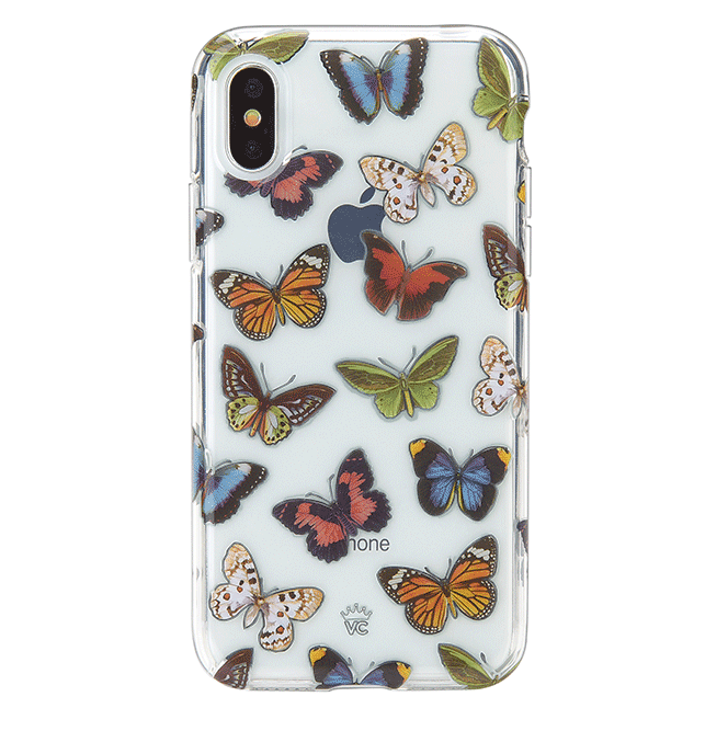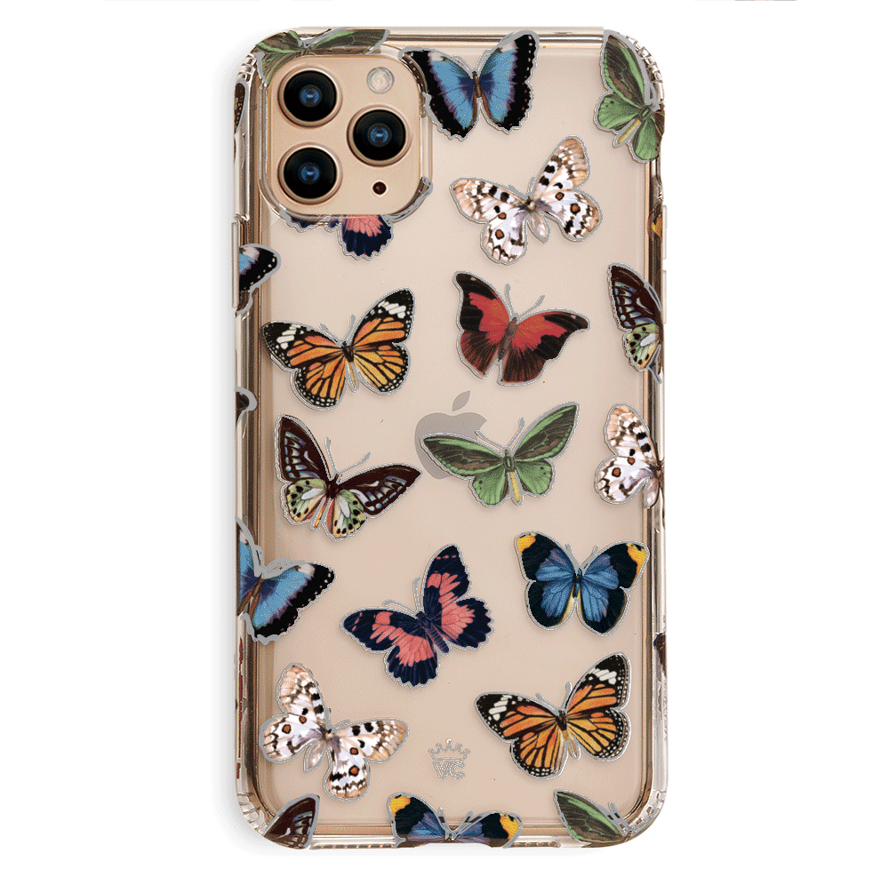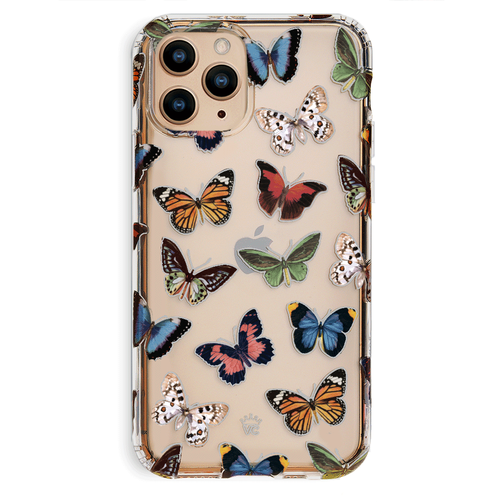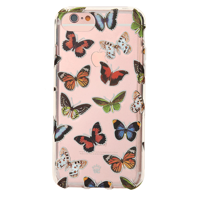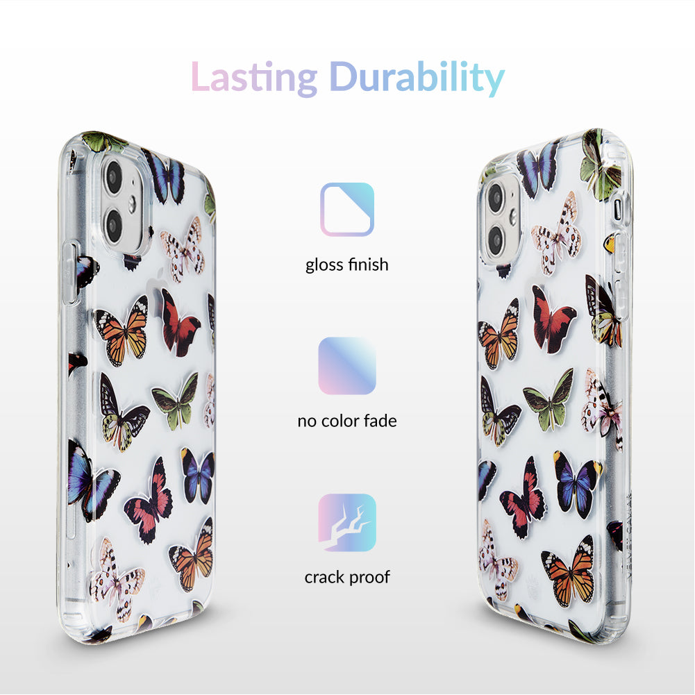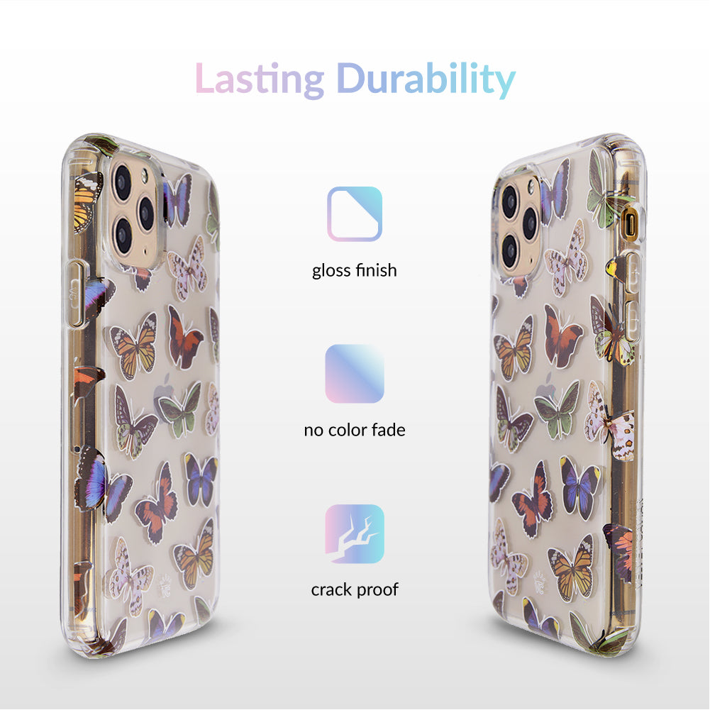 This protective clear case is covered in colorful butterflies with a shiny, metallic outline! It comes in a gloss finish with a matching clear bumper for added protection against drops!
