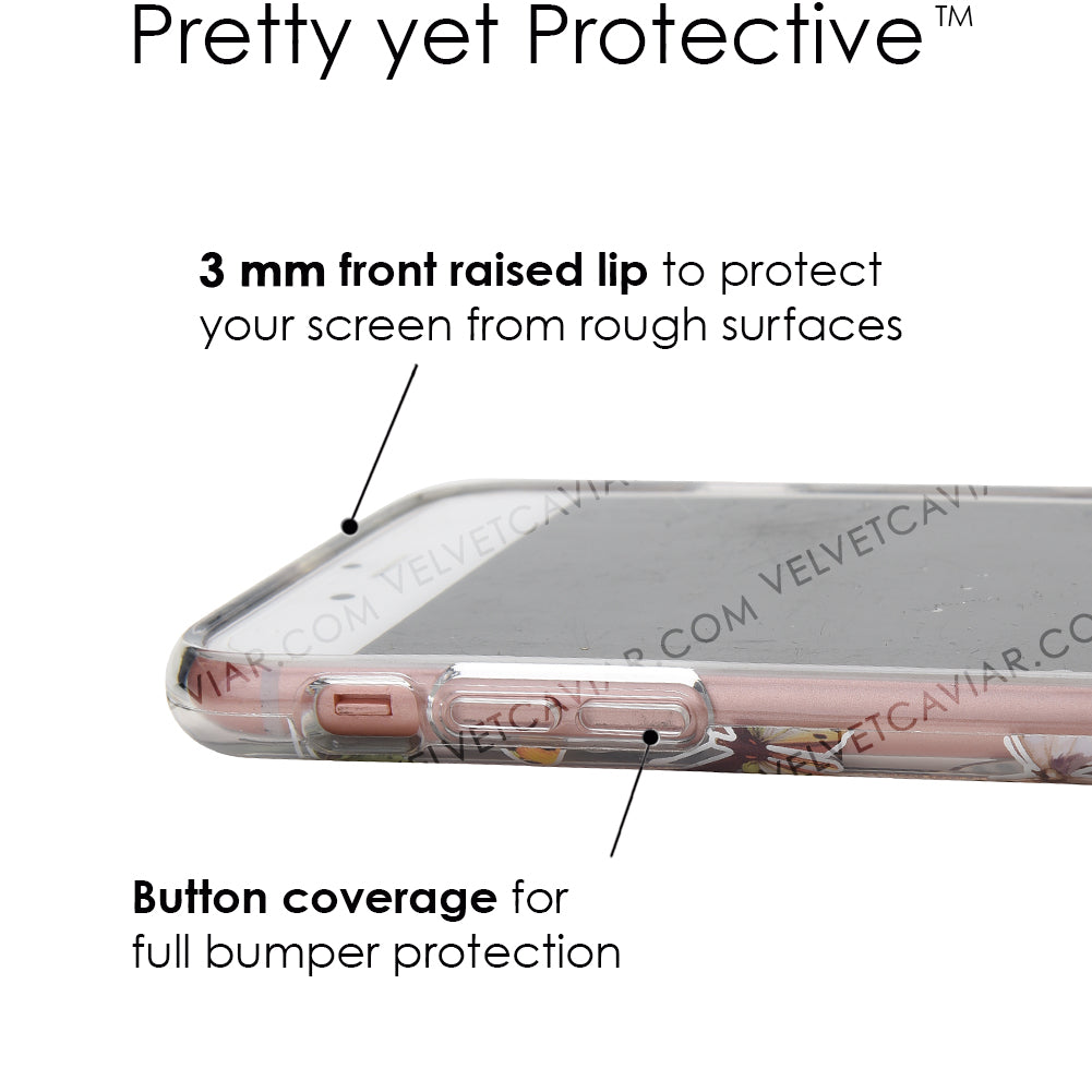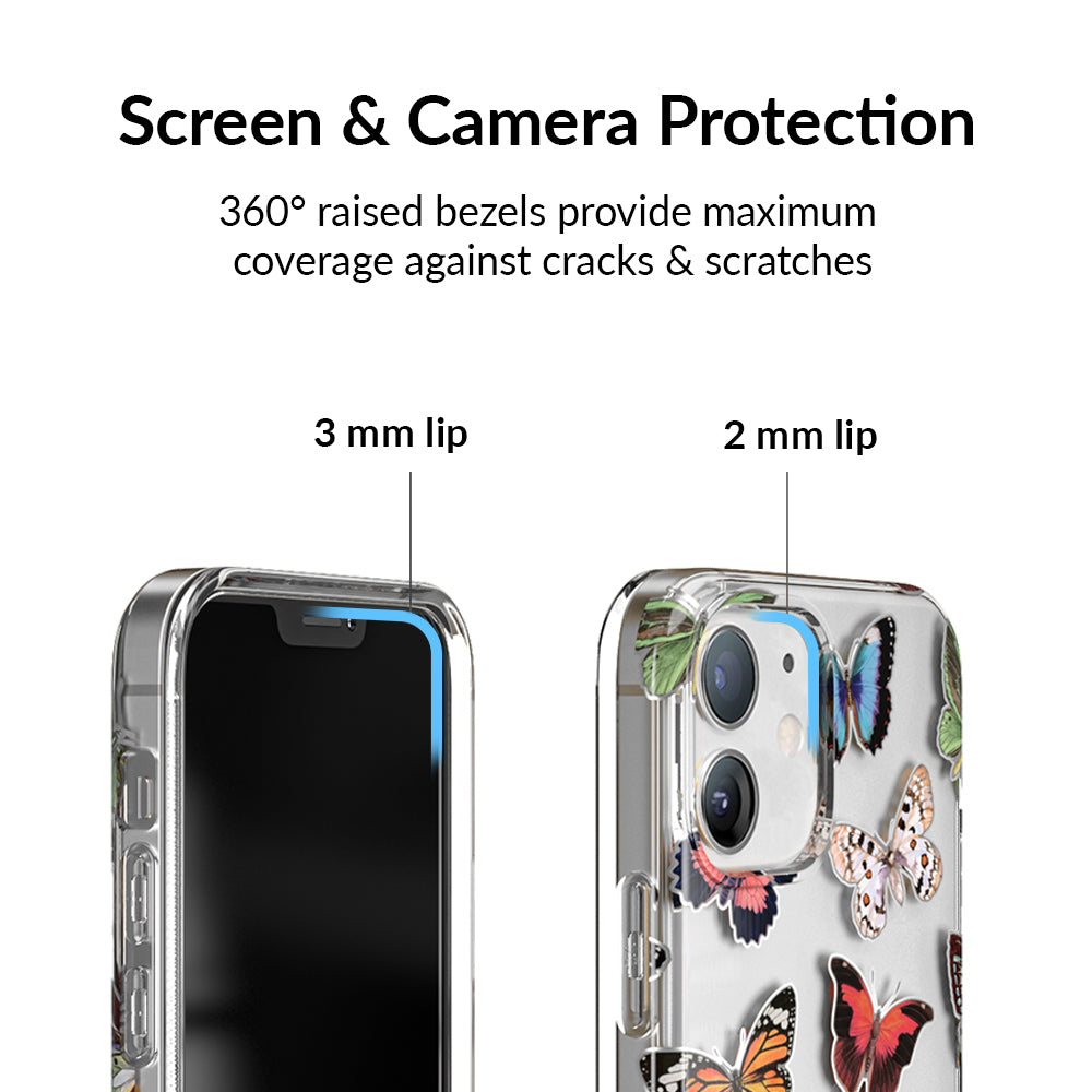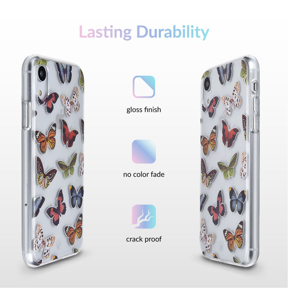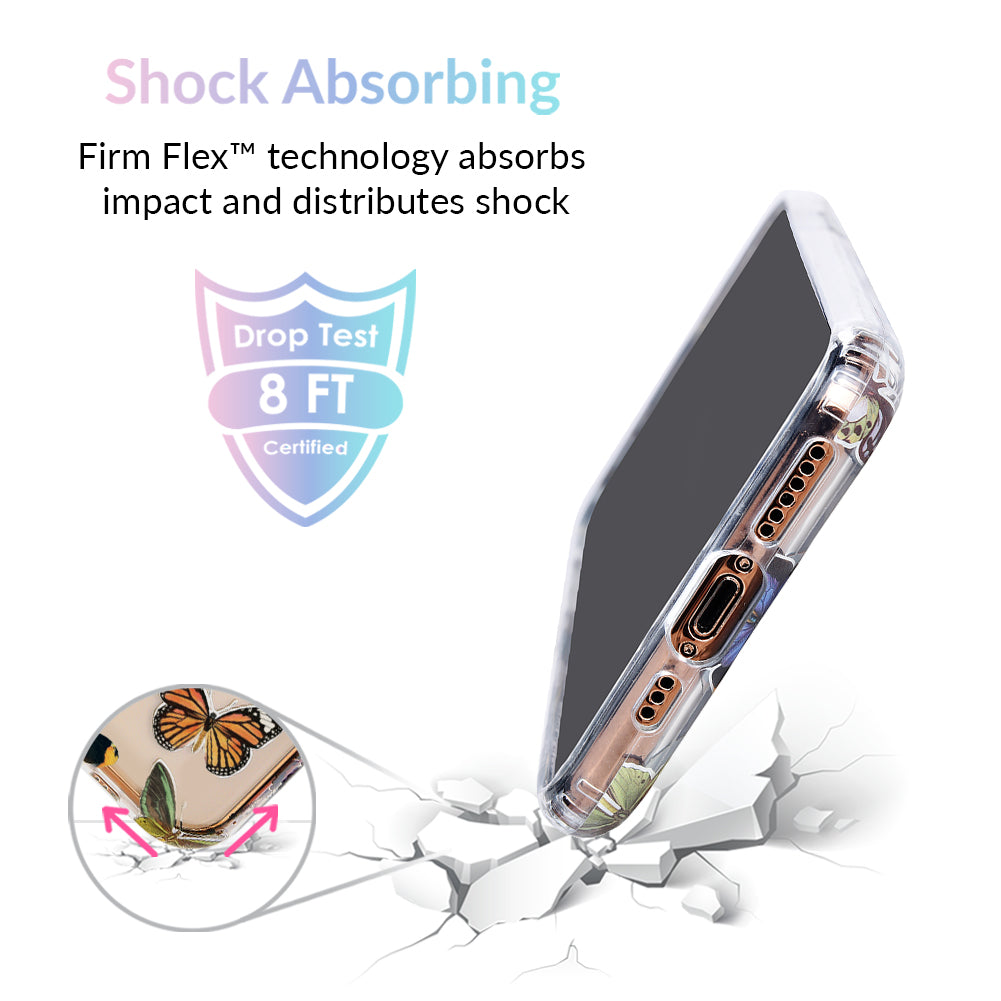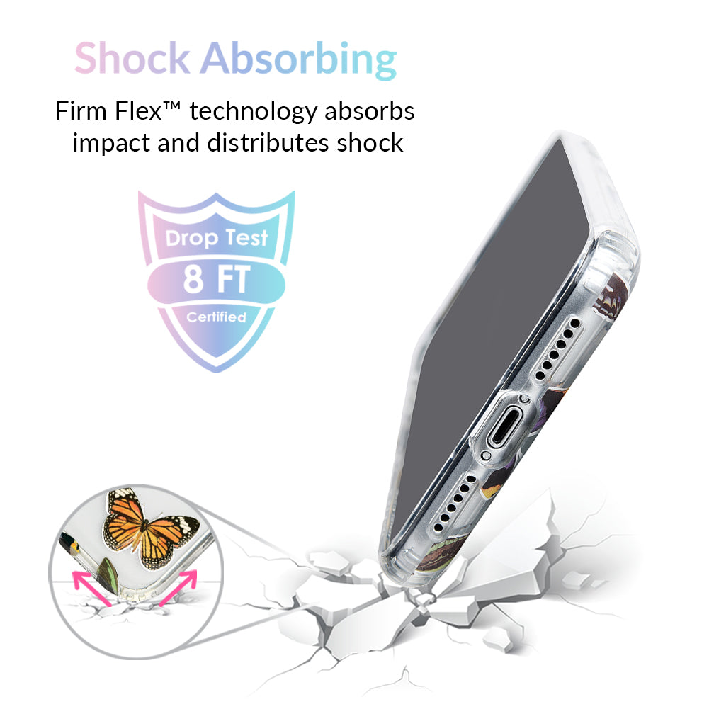 This protective clear case is covered in colorful butterflies with a shiny, metallic outline! It comes in a gloss finish with a matching clear bumper for added protection against drops!