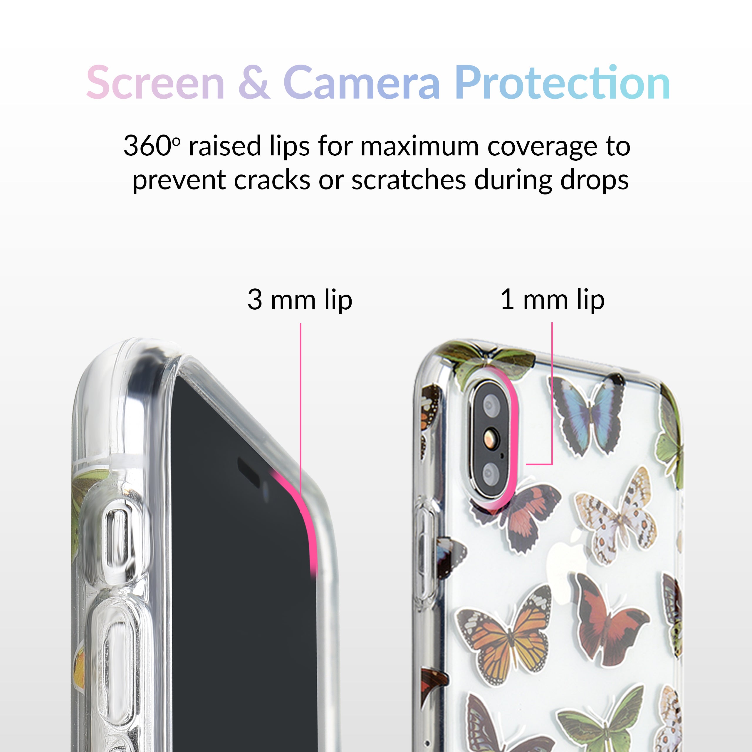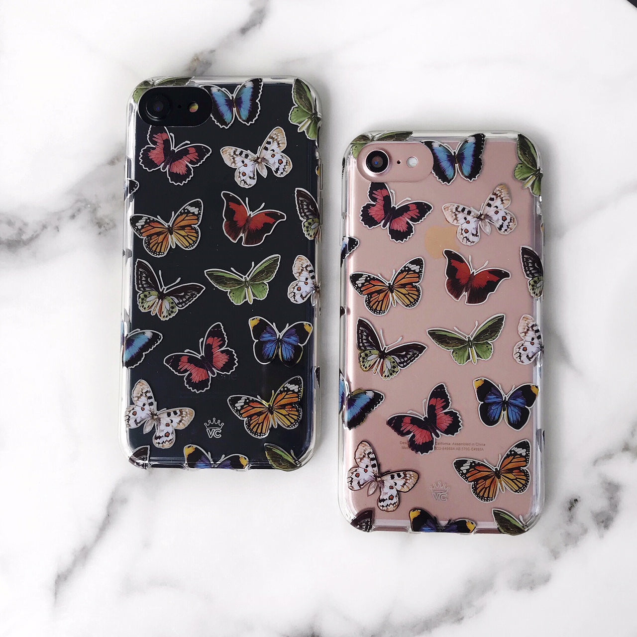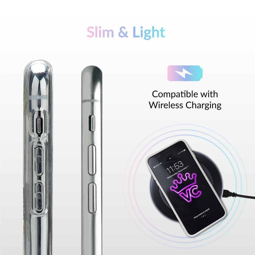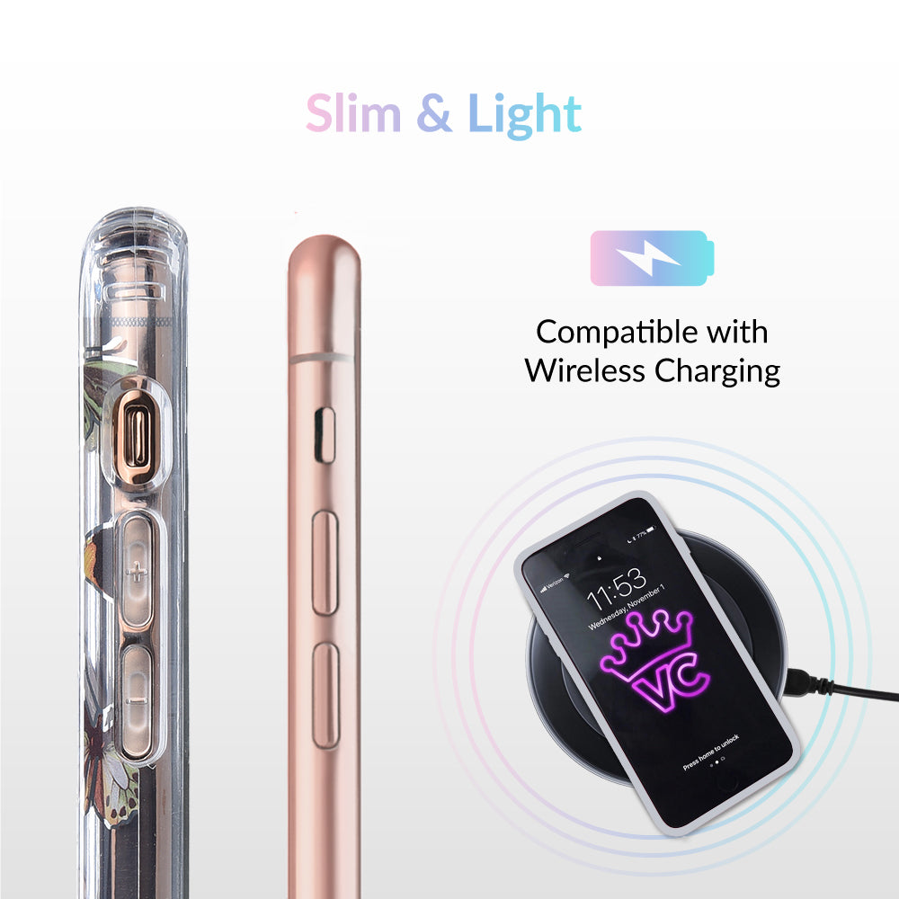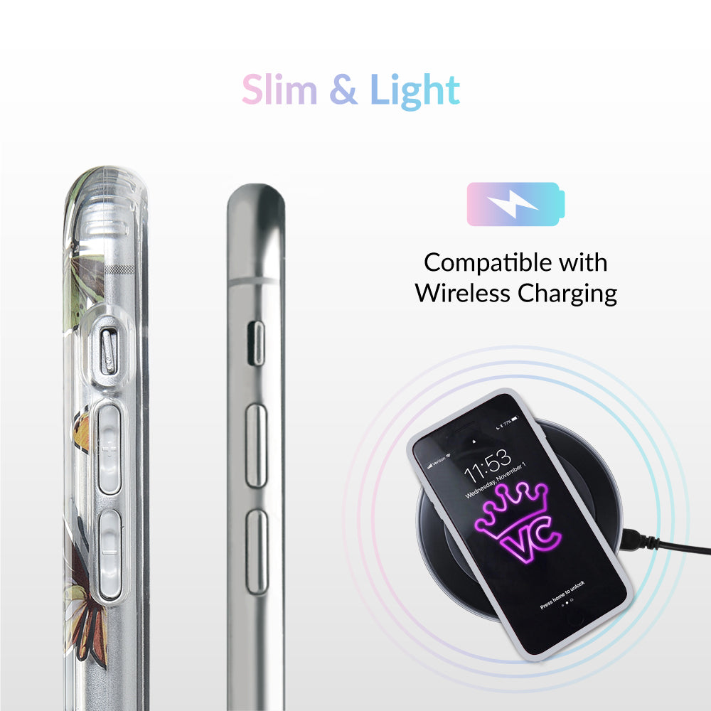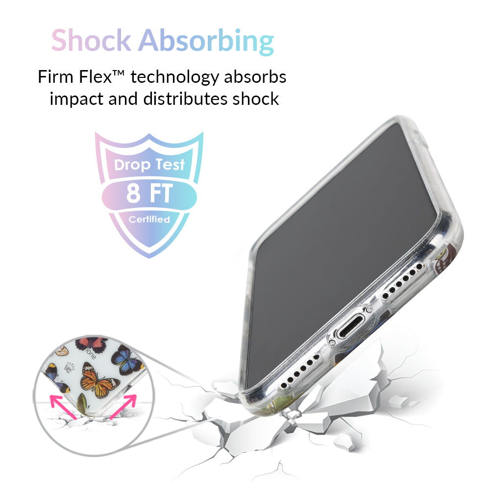 This protective clear case is covered in colorful butterflies with a shiny, metallic outline! It comes in a gloss finish with a matching clear bumper for added protection against drops!