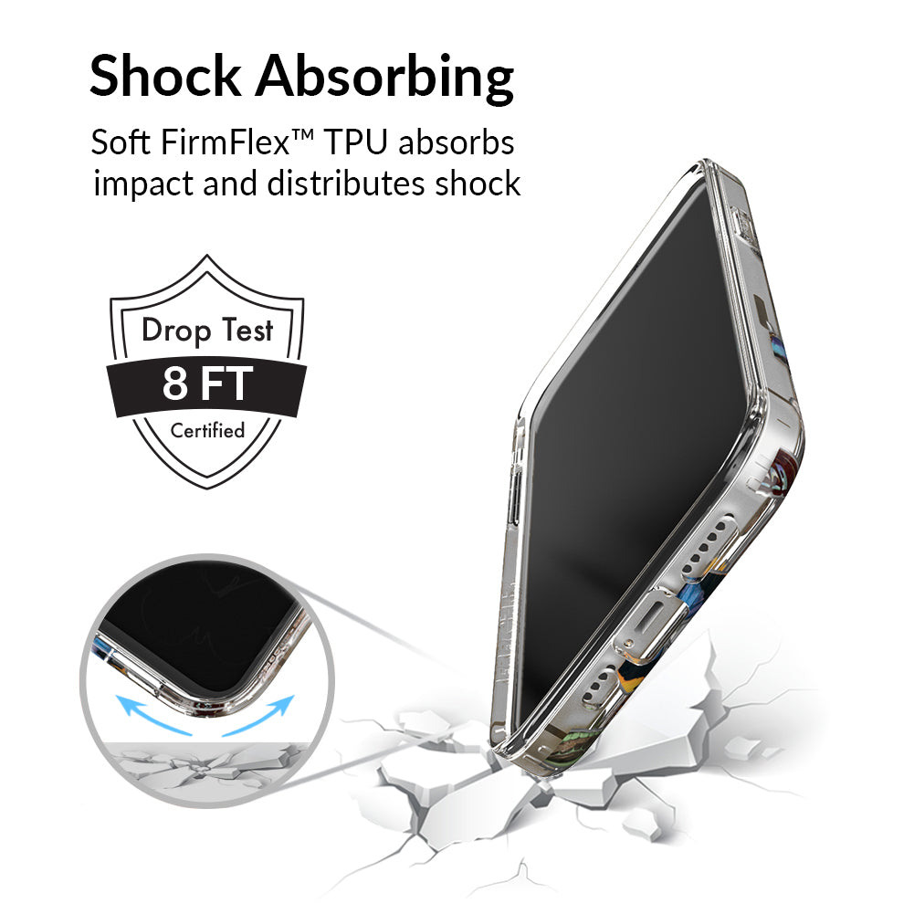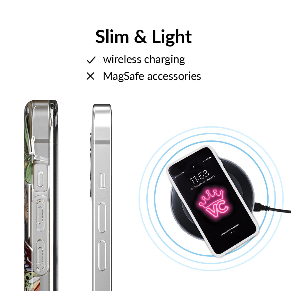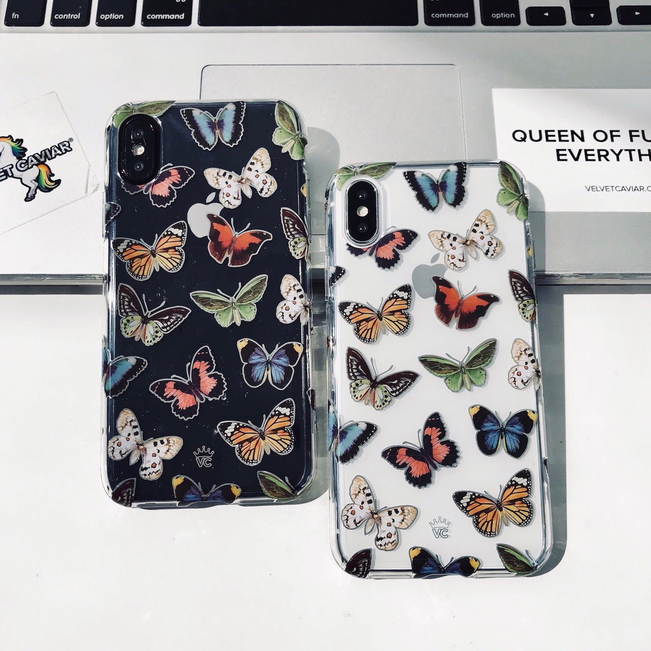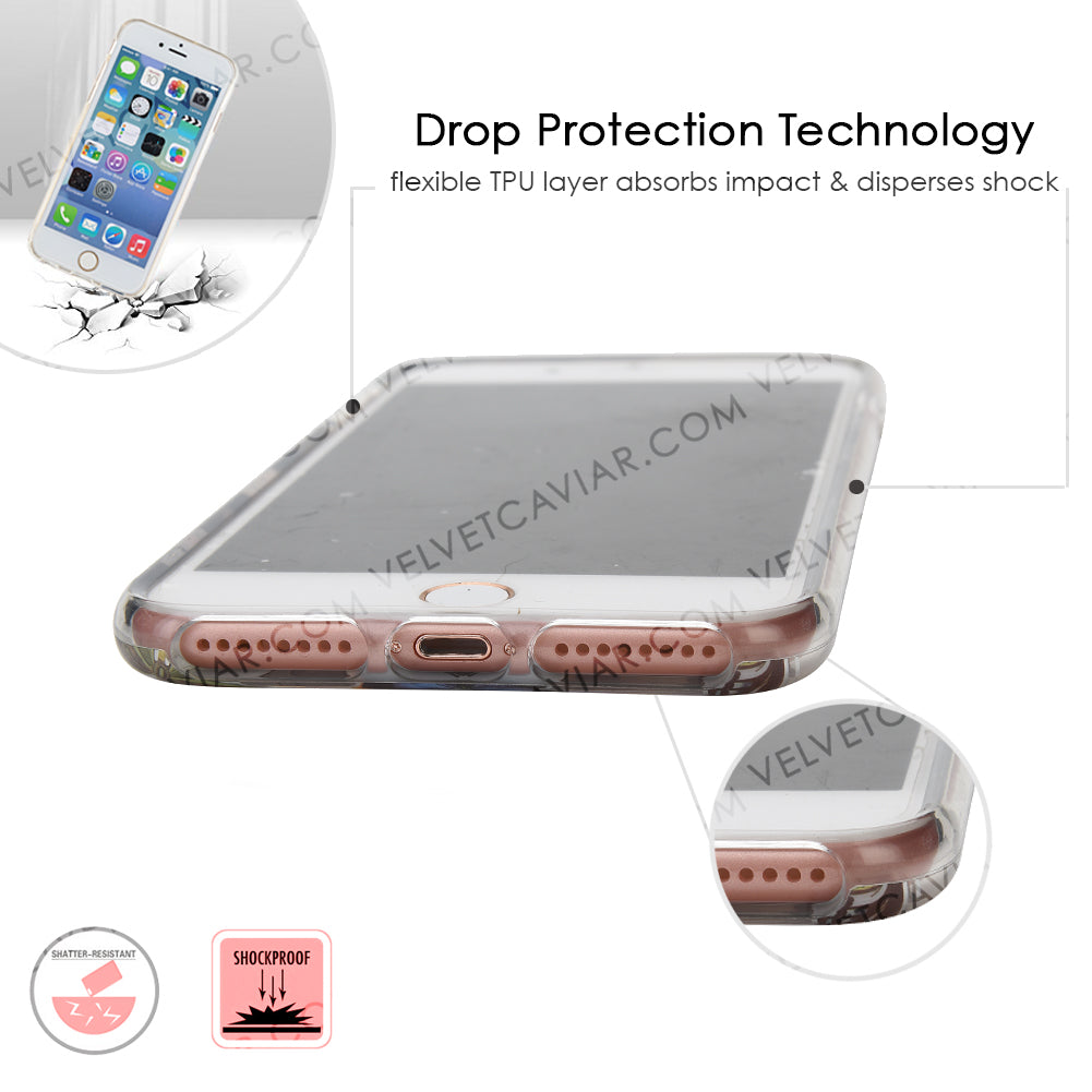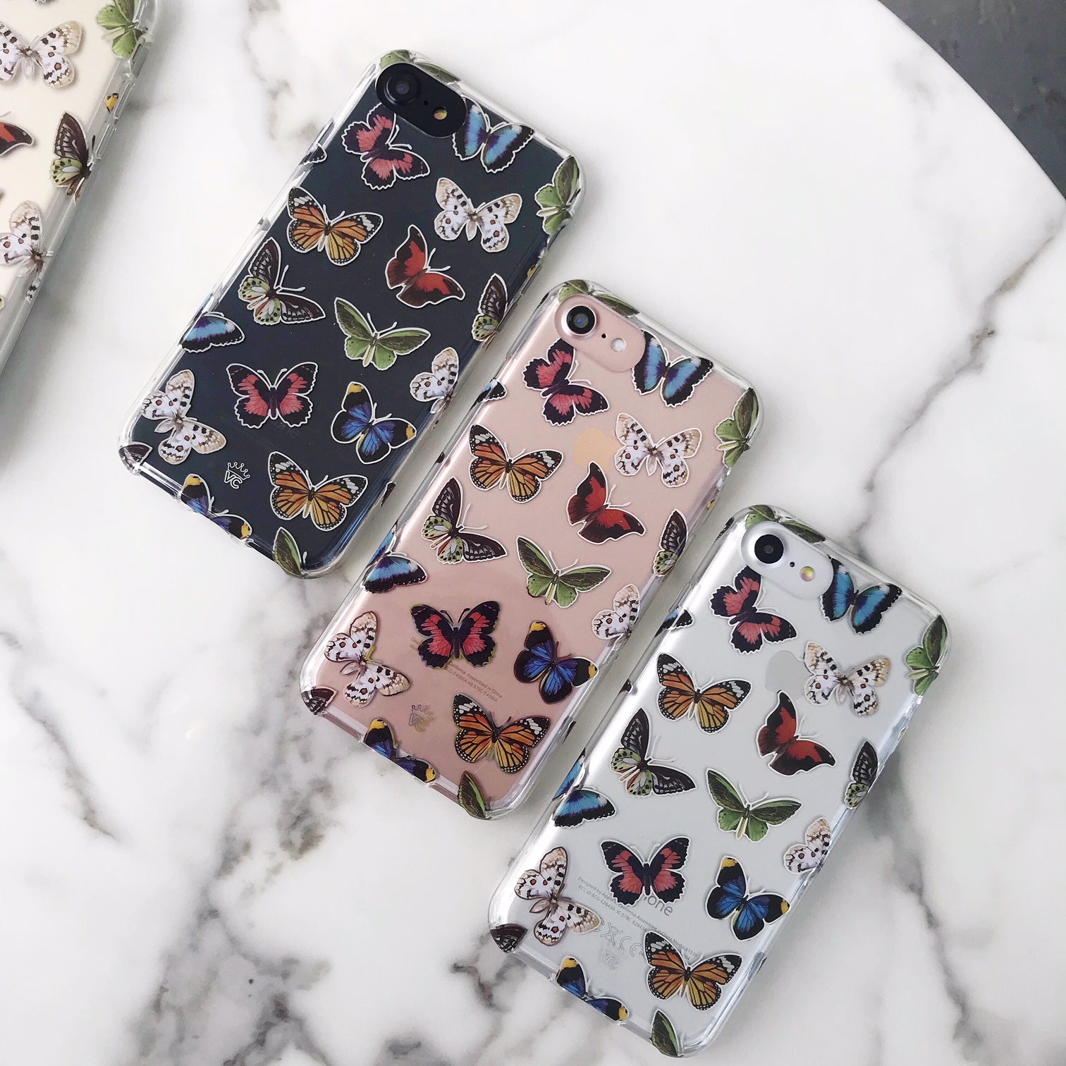 This protective clear case is covered in colorful butterflies with a shiny, metallic outline! It comes in a gloss finish with a matching clear bumper for added protection against drops!