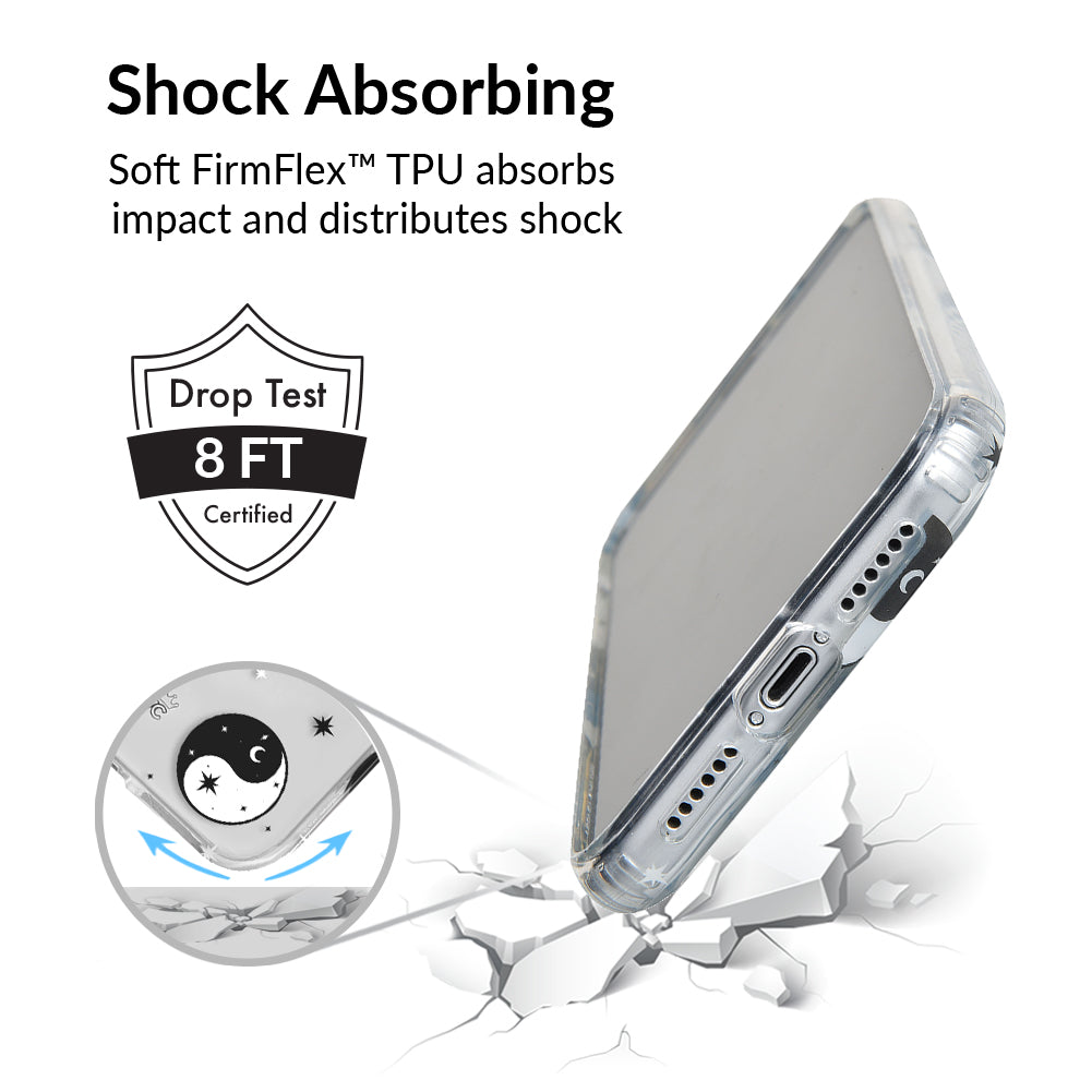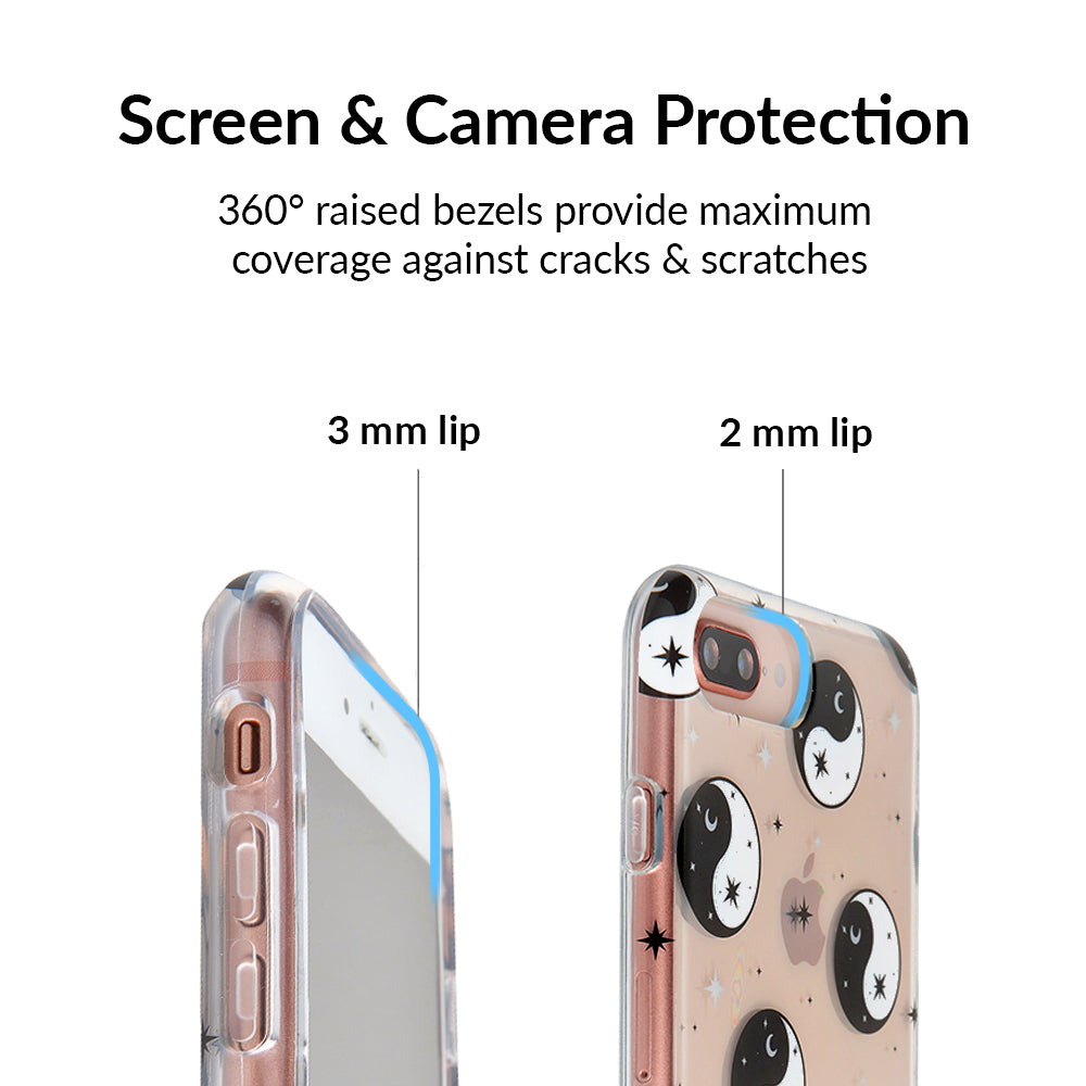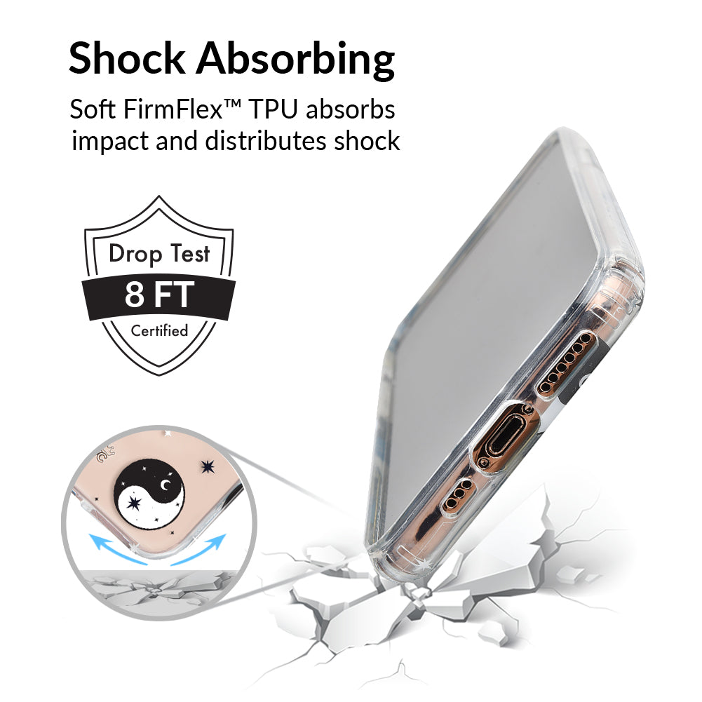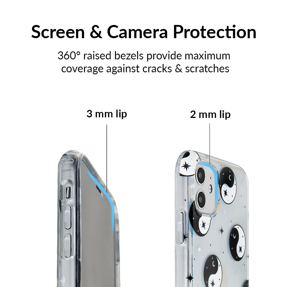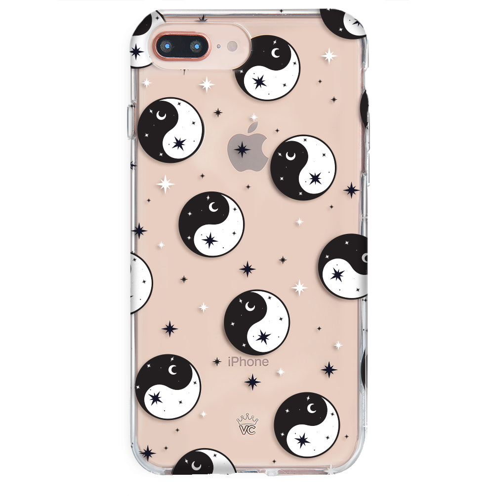 This protective clear case is covered in black and white yin yang symbols to help bring balance to your life! It comes in a gloss finish with a matching clear bumper for added protection against drops!