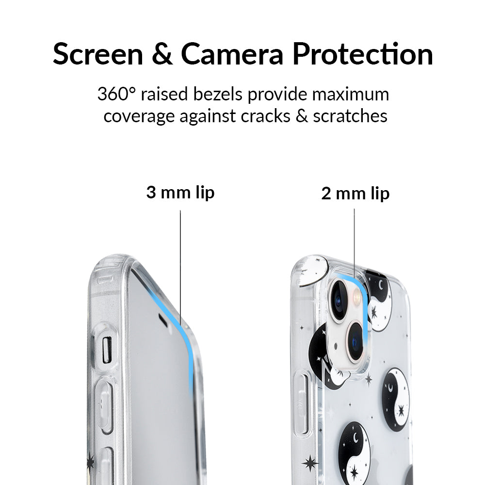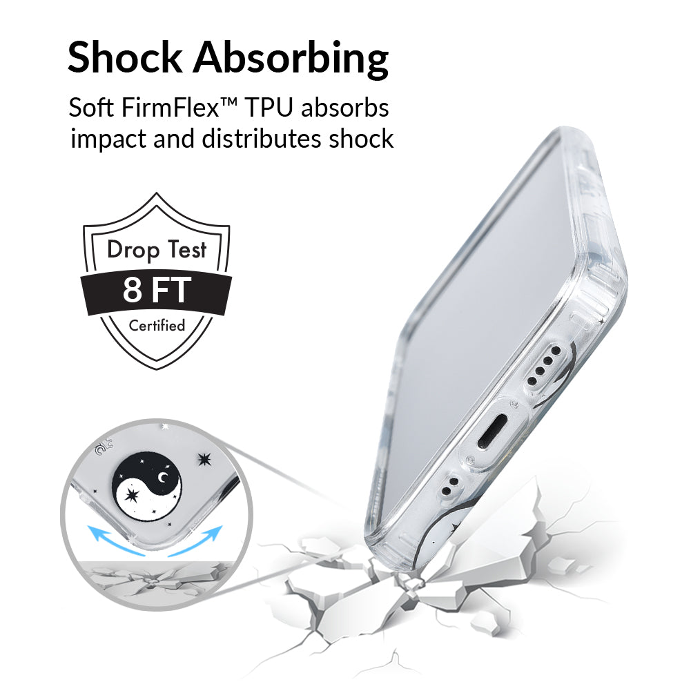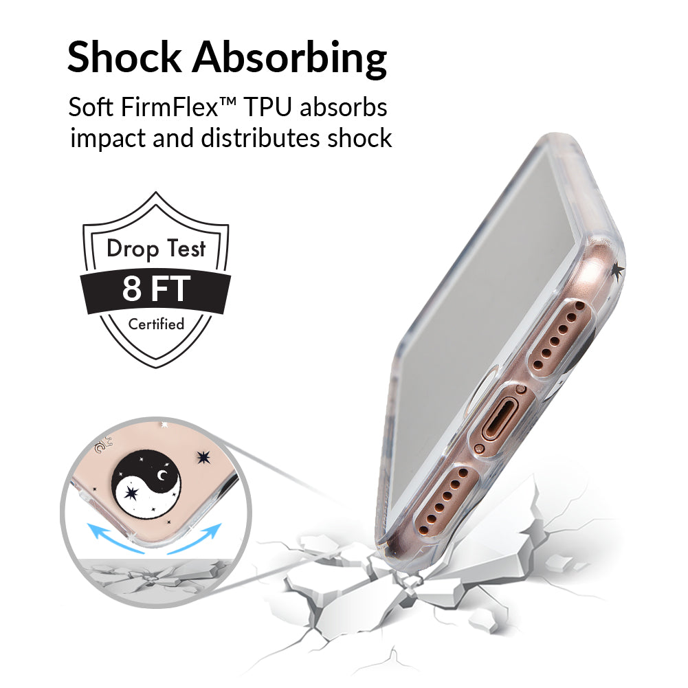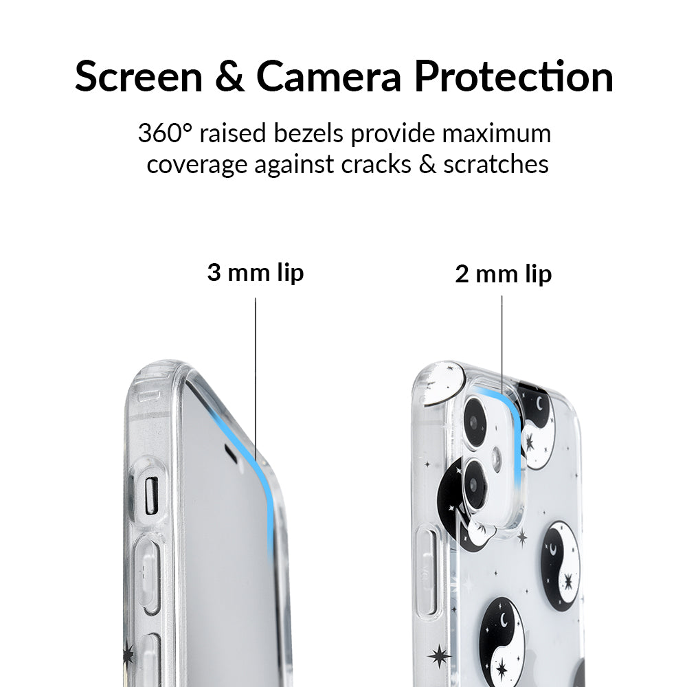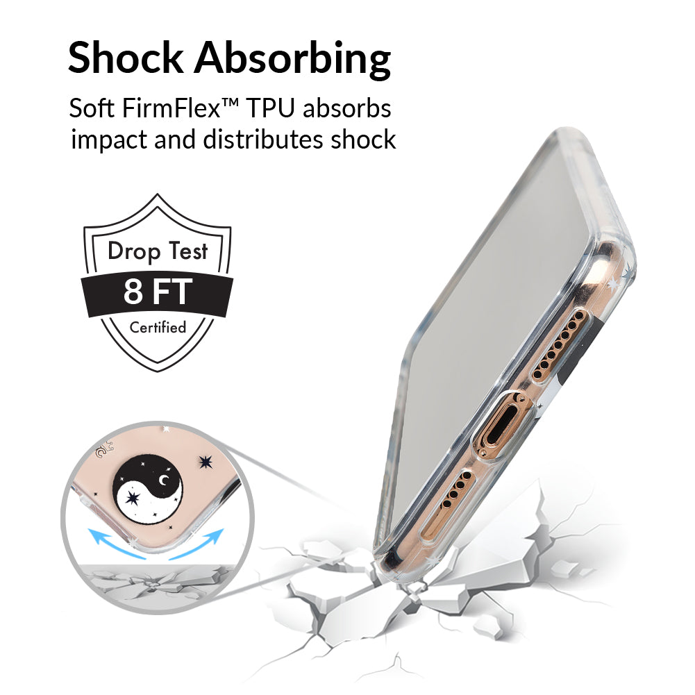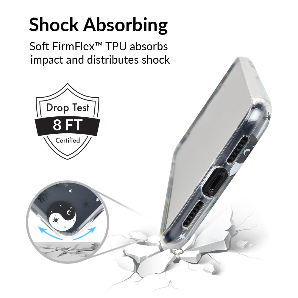 This protective clear case is covered in black and white yin yang symbols to help bring balance to your life! It comes in a gloss finish with a matching clear bumper for added protection against drops!