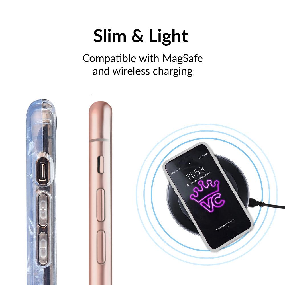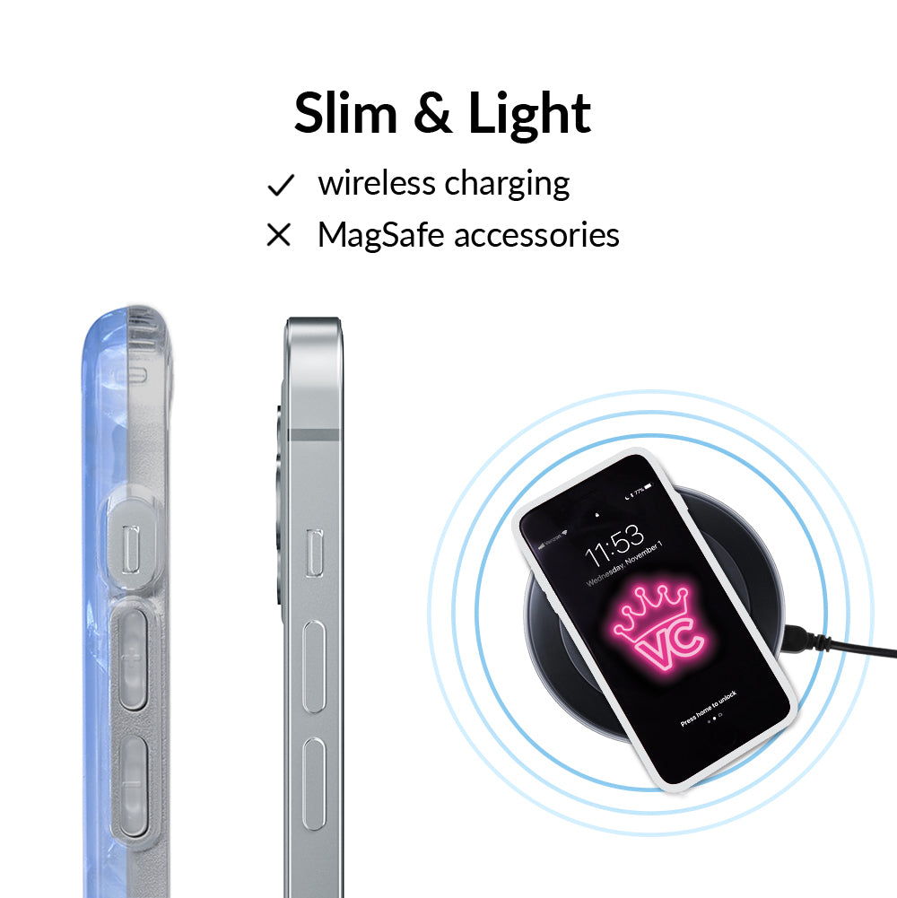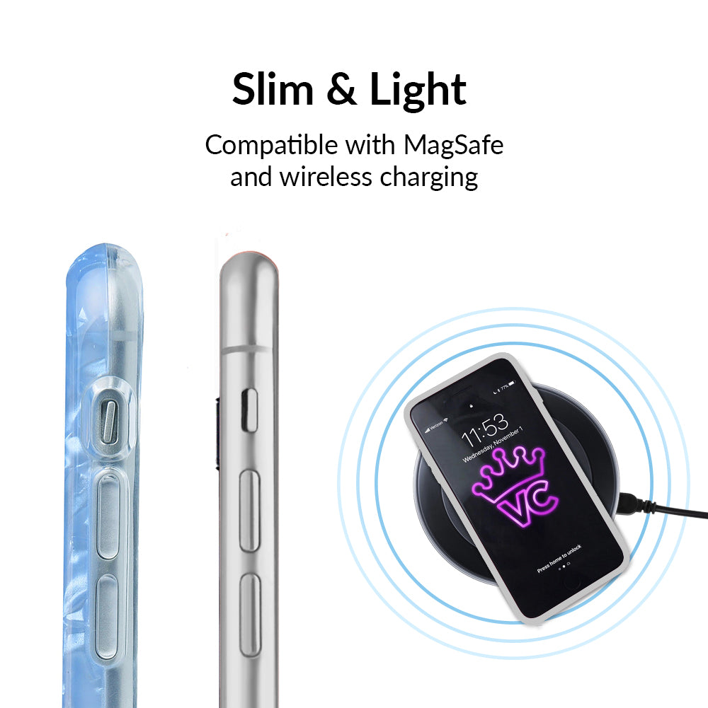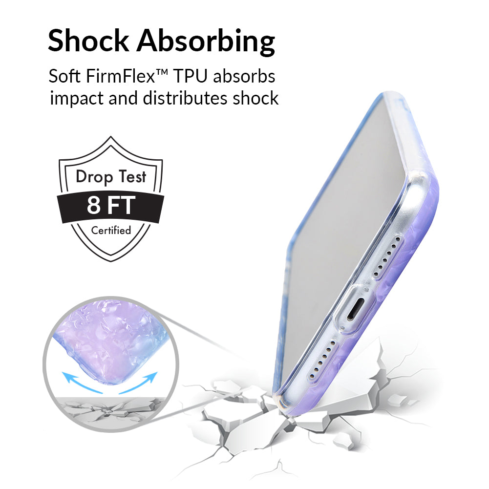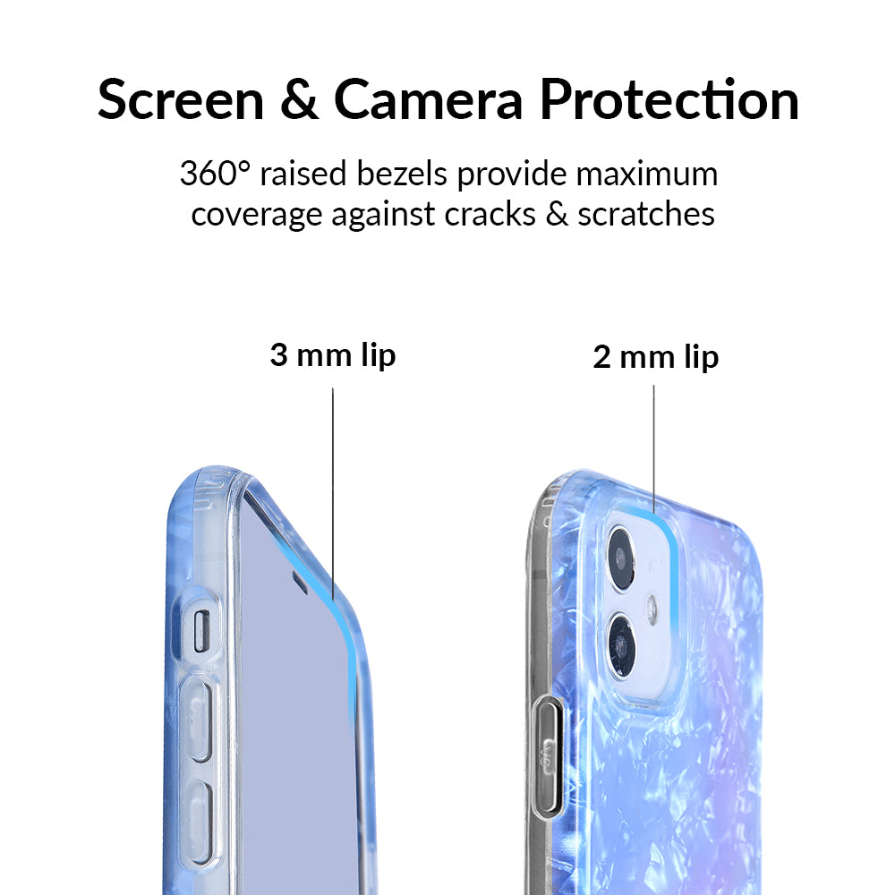 Inspired by the stone of inner peace and serenity. This protective clear case has an acrylic layer of pale blue coloring inspired by the many facets of blue opal.