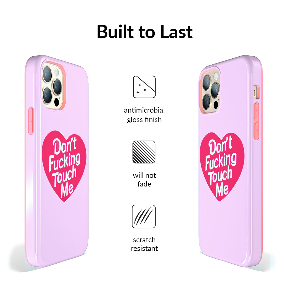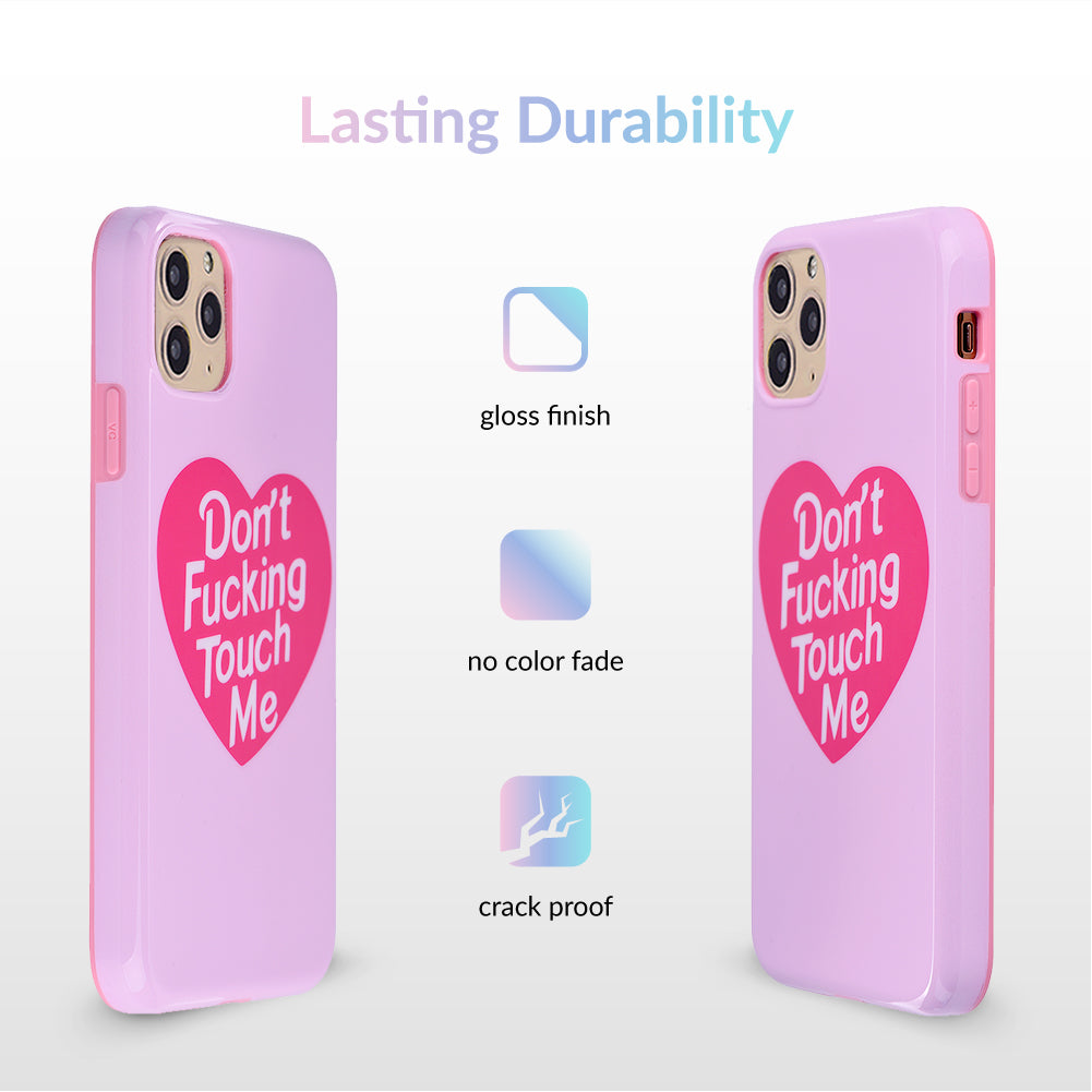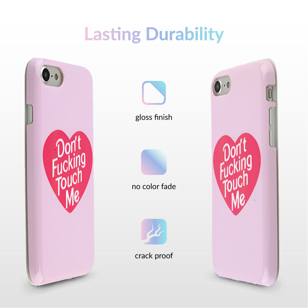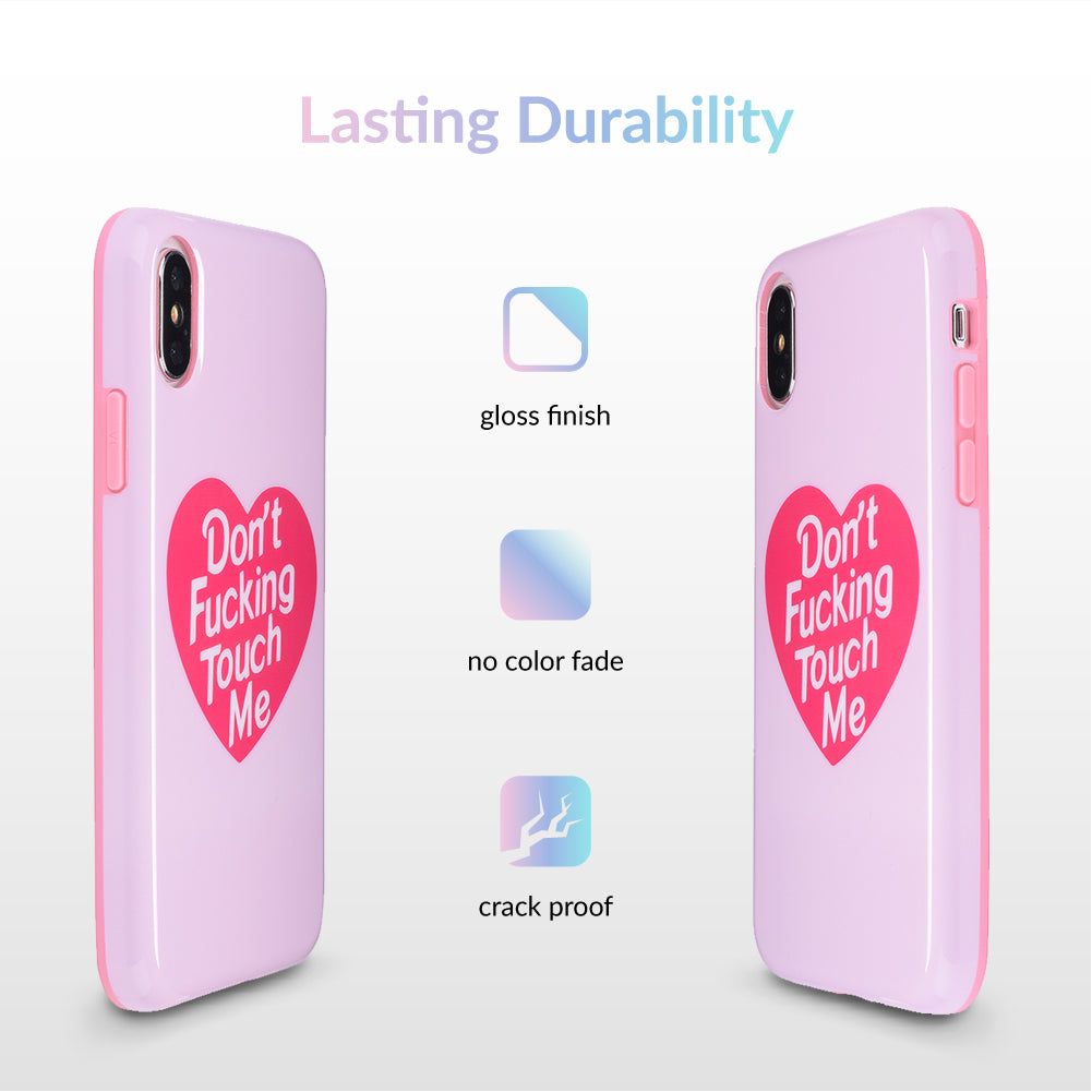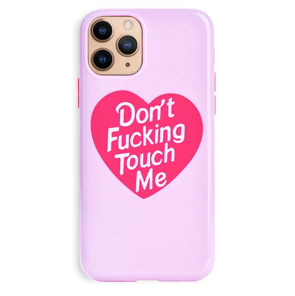 For every time your mood was "Don't Fucking Touch Me." This sassy but protective case features a pink background with a hot pink heart and white text. It comes in a gloss finish with matching pink bumper to protect against drops!