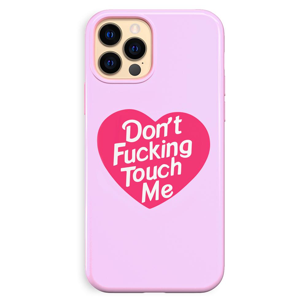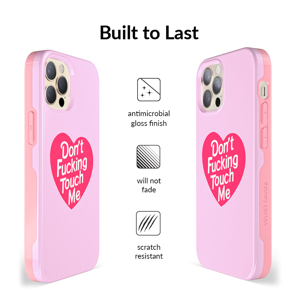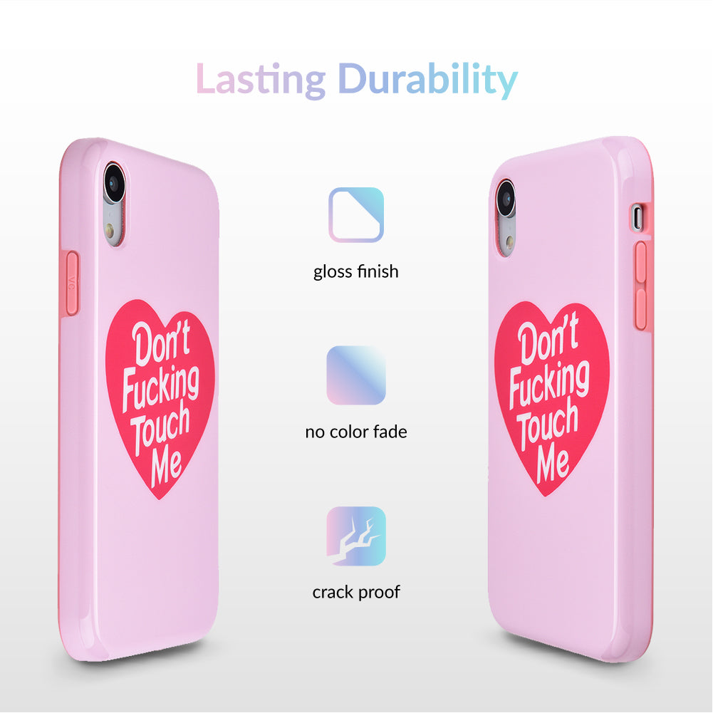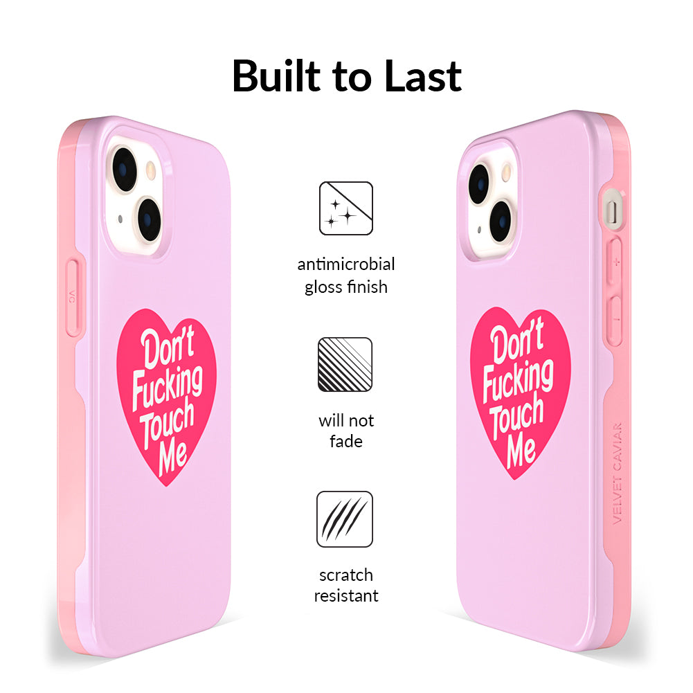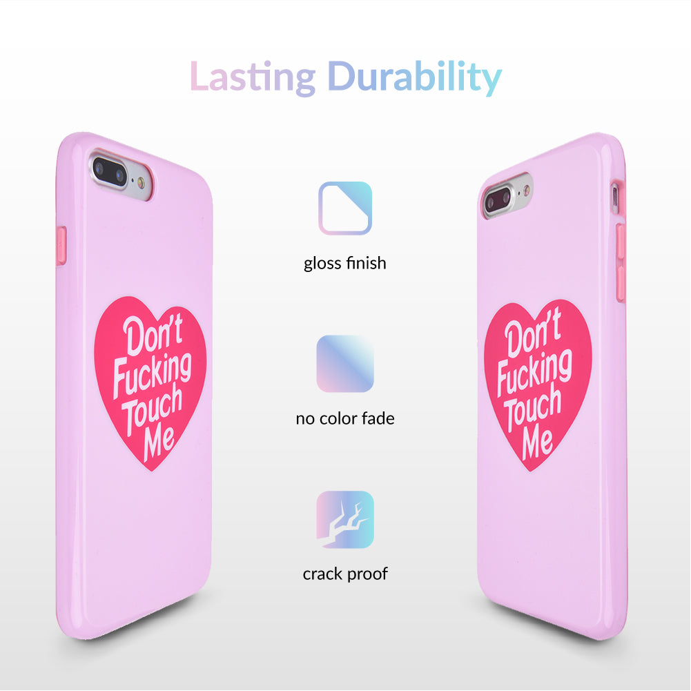 For every time your mood was "Don't Fucking Touch Me." This sassy but protective case features a pink background with a hot pink heart and white text. It comes in a gloss finish with matching pink bumper to protect against drops!