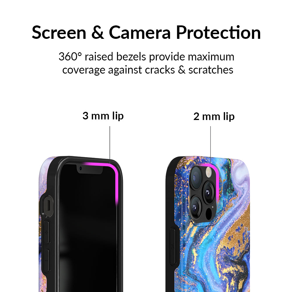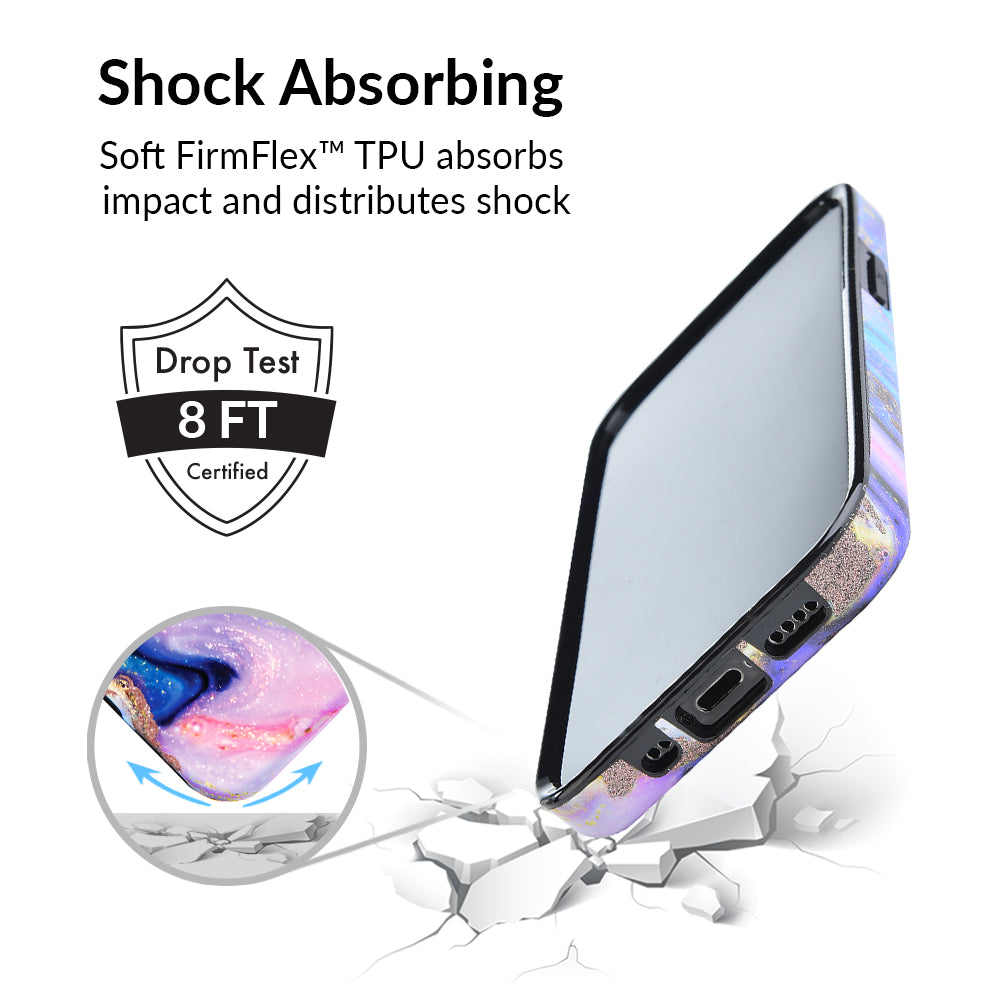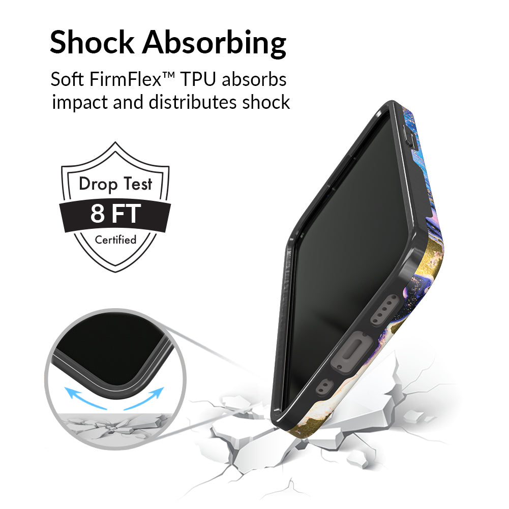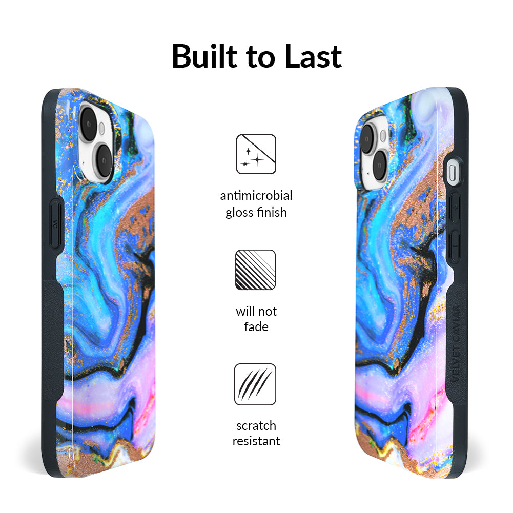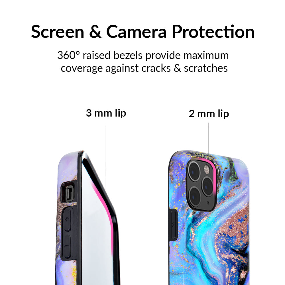 A case that's out of this world! Featuring a whole galaxy of colors, from blue to pink, with gold glitter filled cracks. As always, paired with a matching front bumper for added protection against drops!