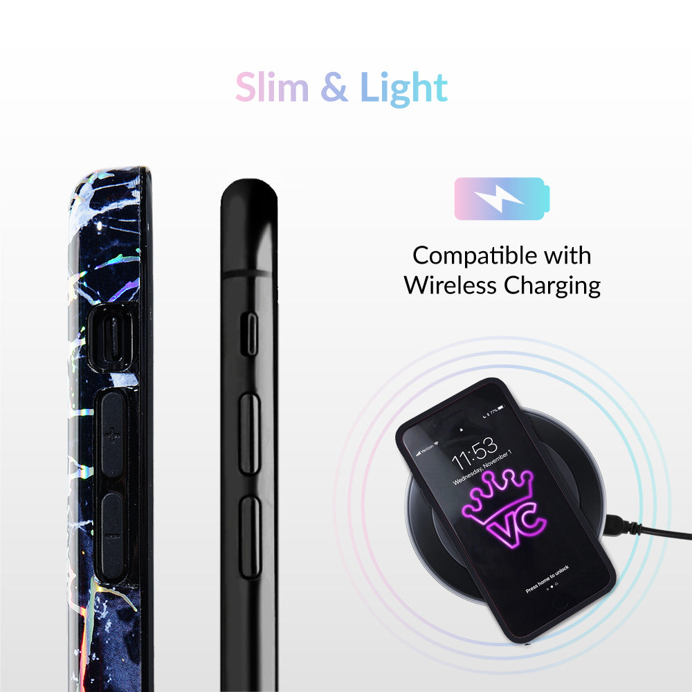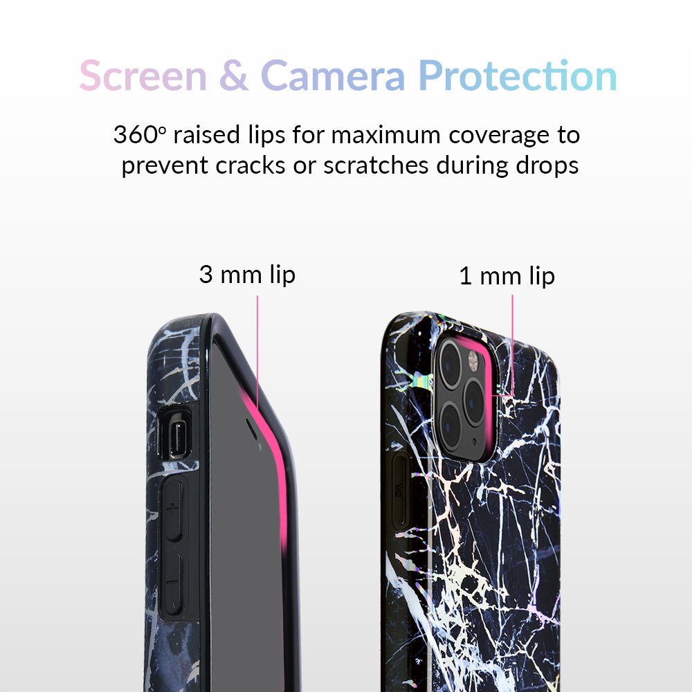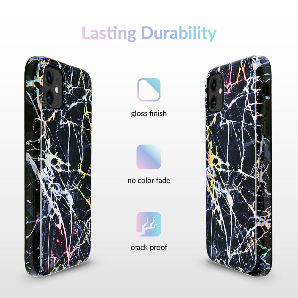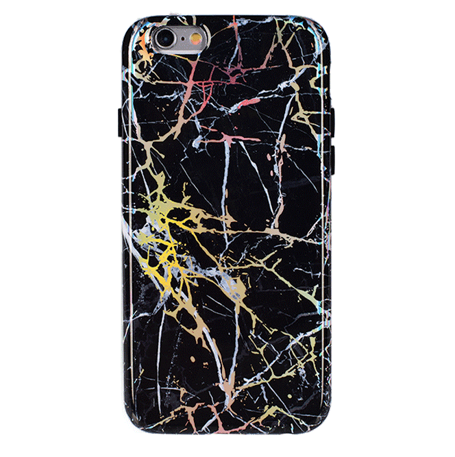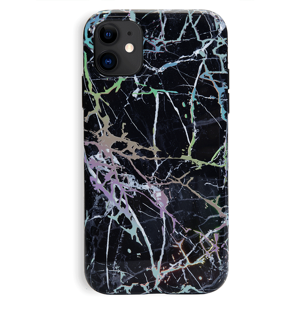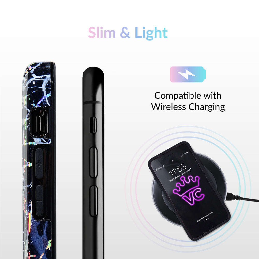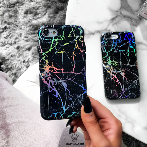 This protective case features an inky black marble design inlaid with reflective, holographic cracks that catch in the light! It comes in a glossy finish with a matching black bumper for added protection against drops!