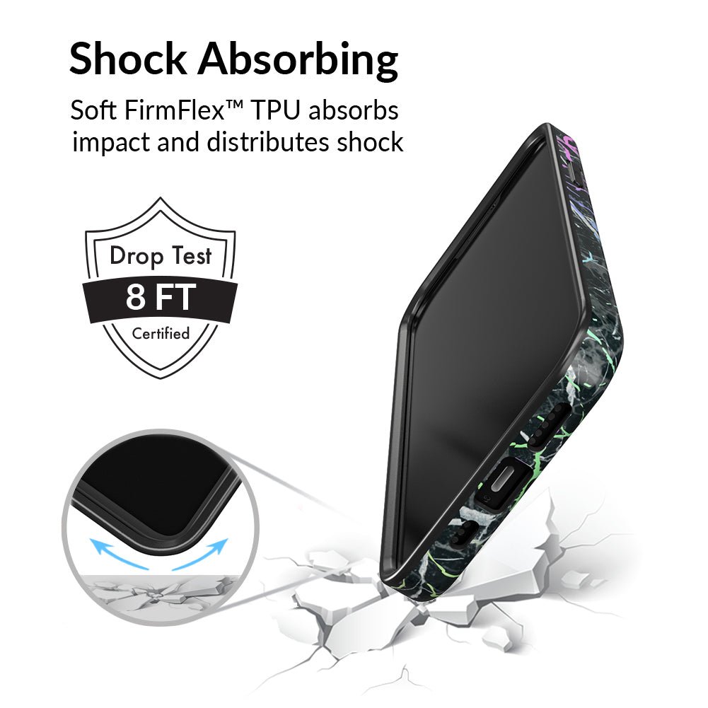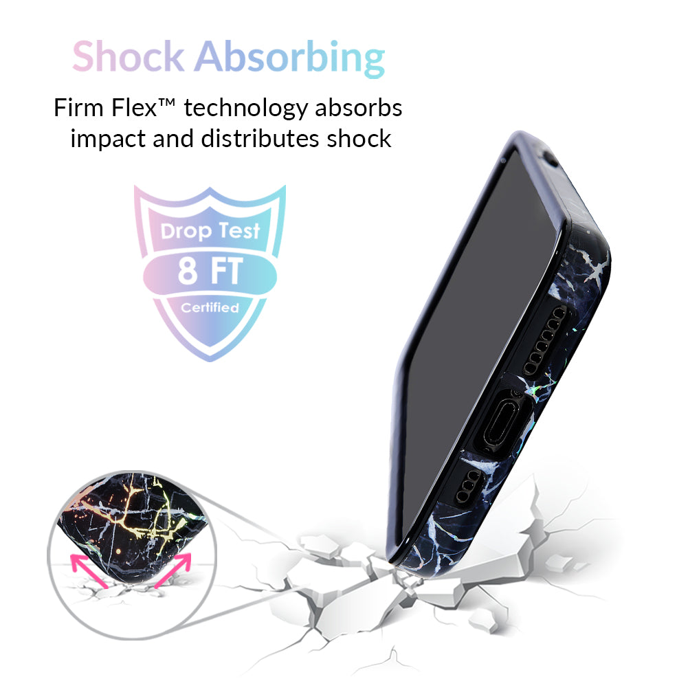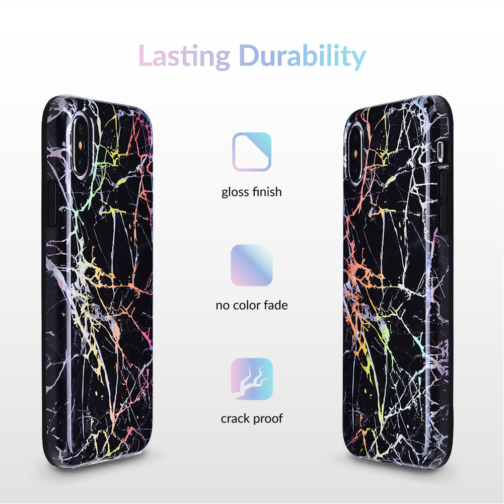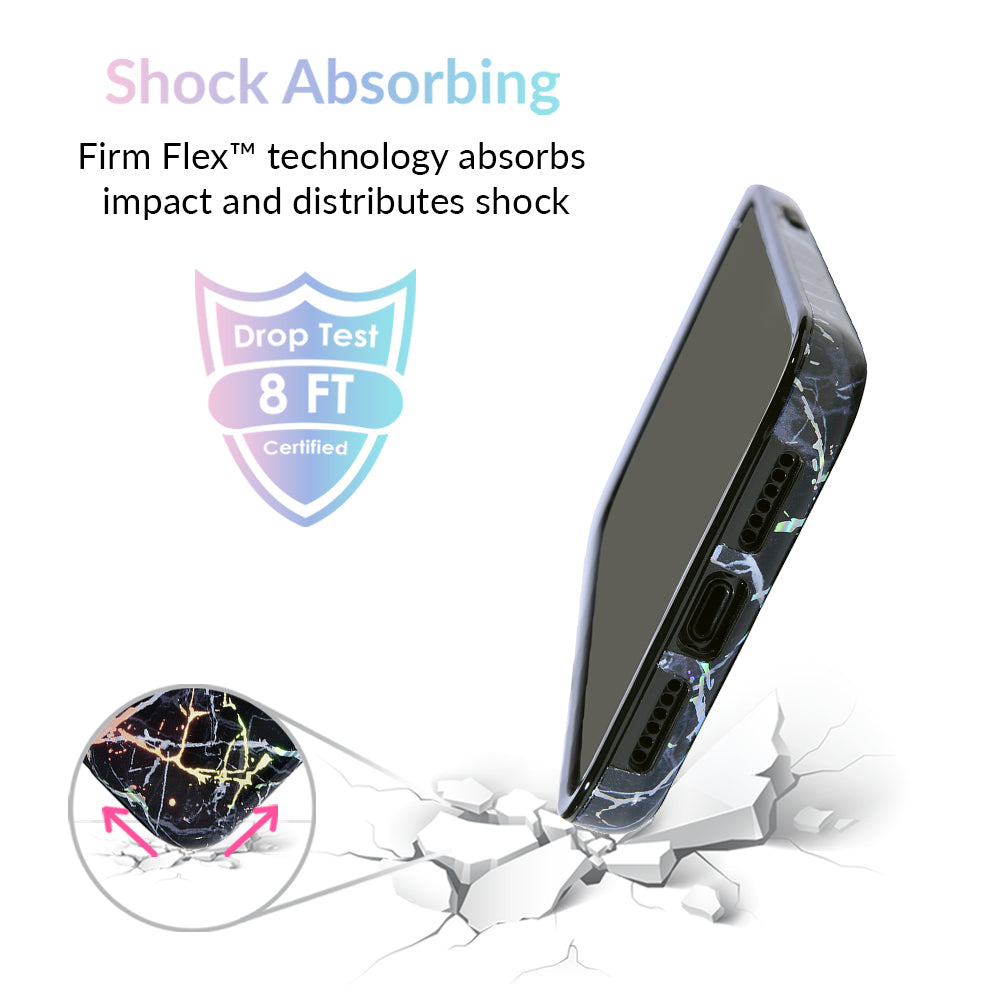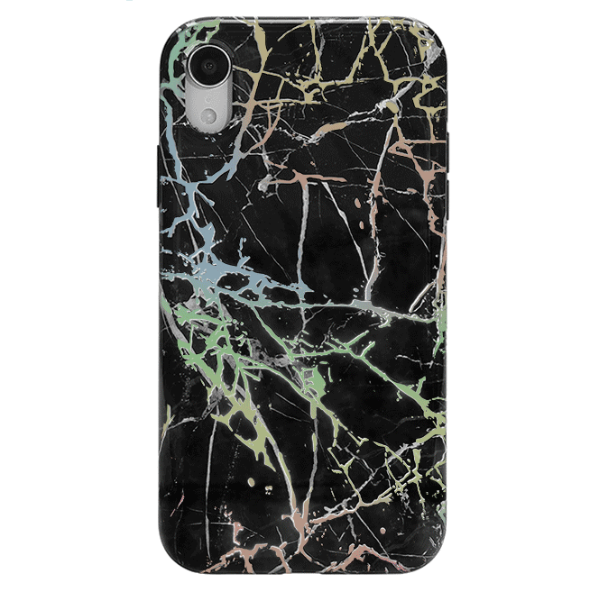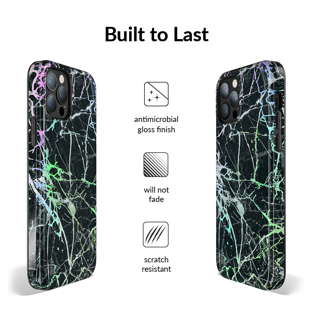 This protective case features an inky black marble design inlaid with reflective, holographic cracks that catch in the light! It comes in a glossy finish with a matching black bumper for added protection against drops!