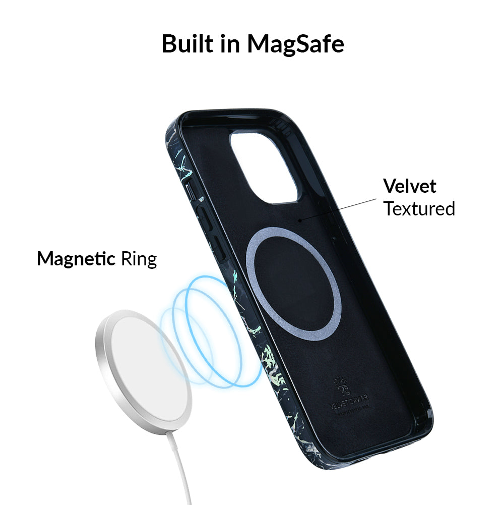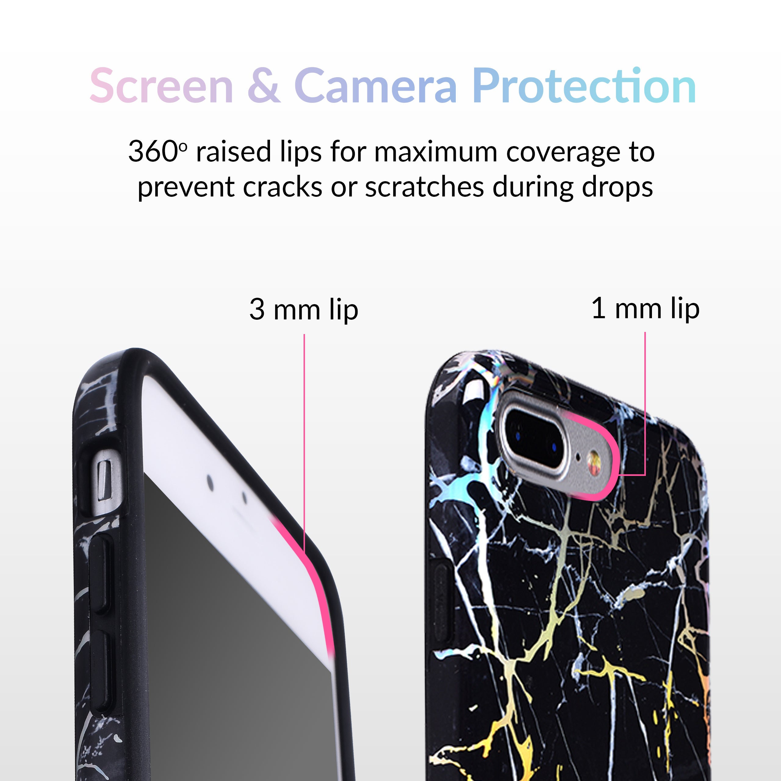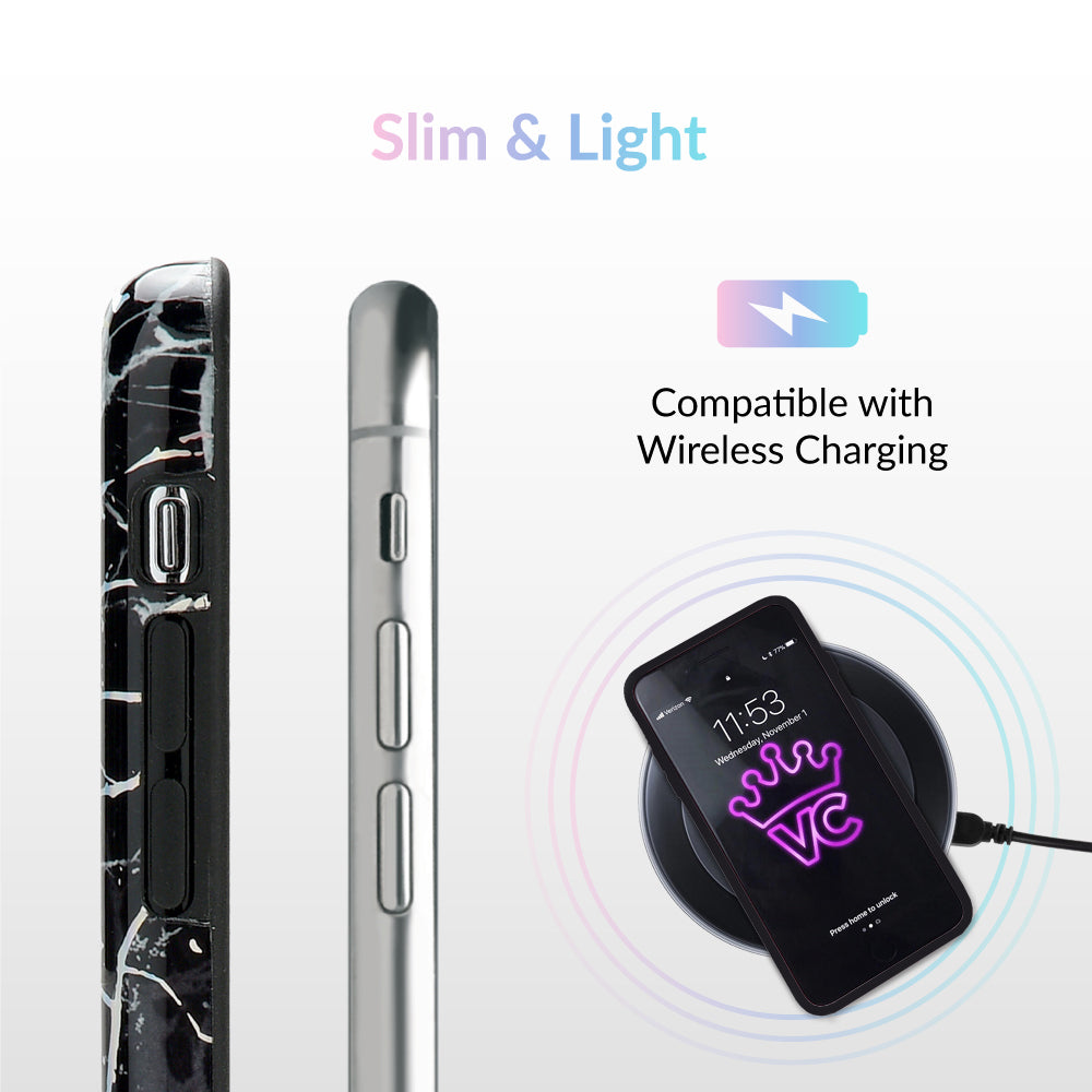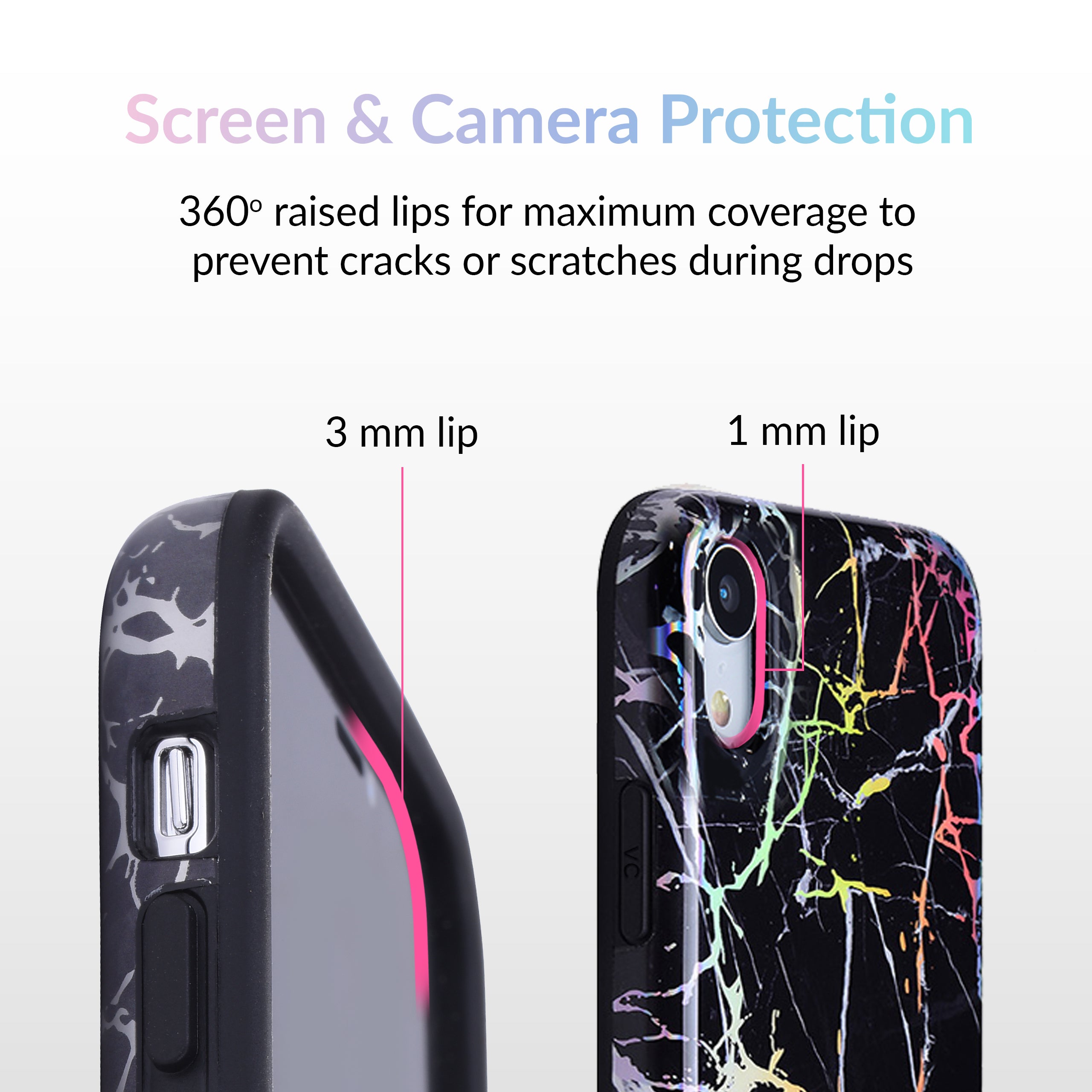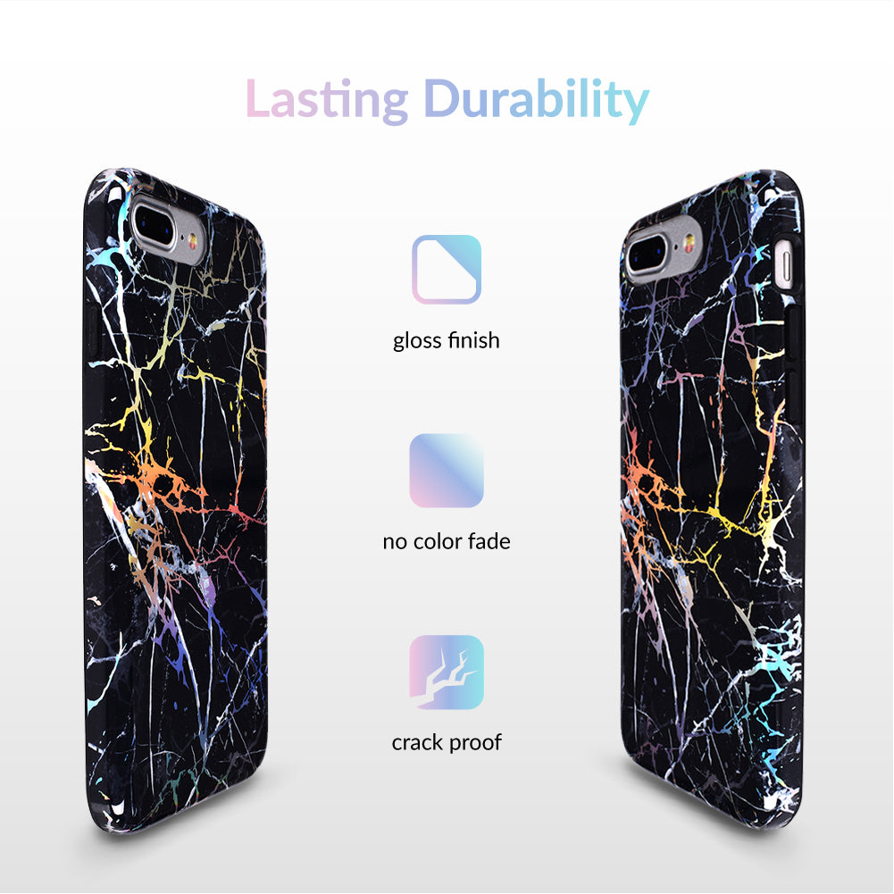 This protective case features an inky black marble design inlaid with reflective, holographic cracks that catch in the light! It comes in a glossy finish with a matching black bumper for added protection against drops!