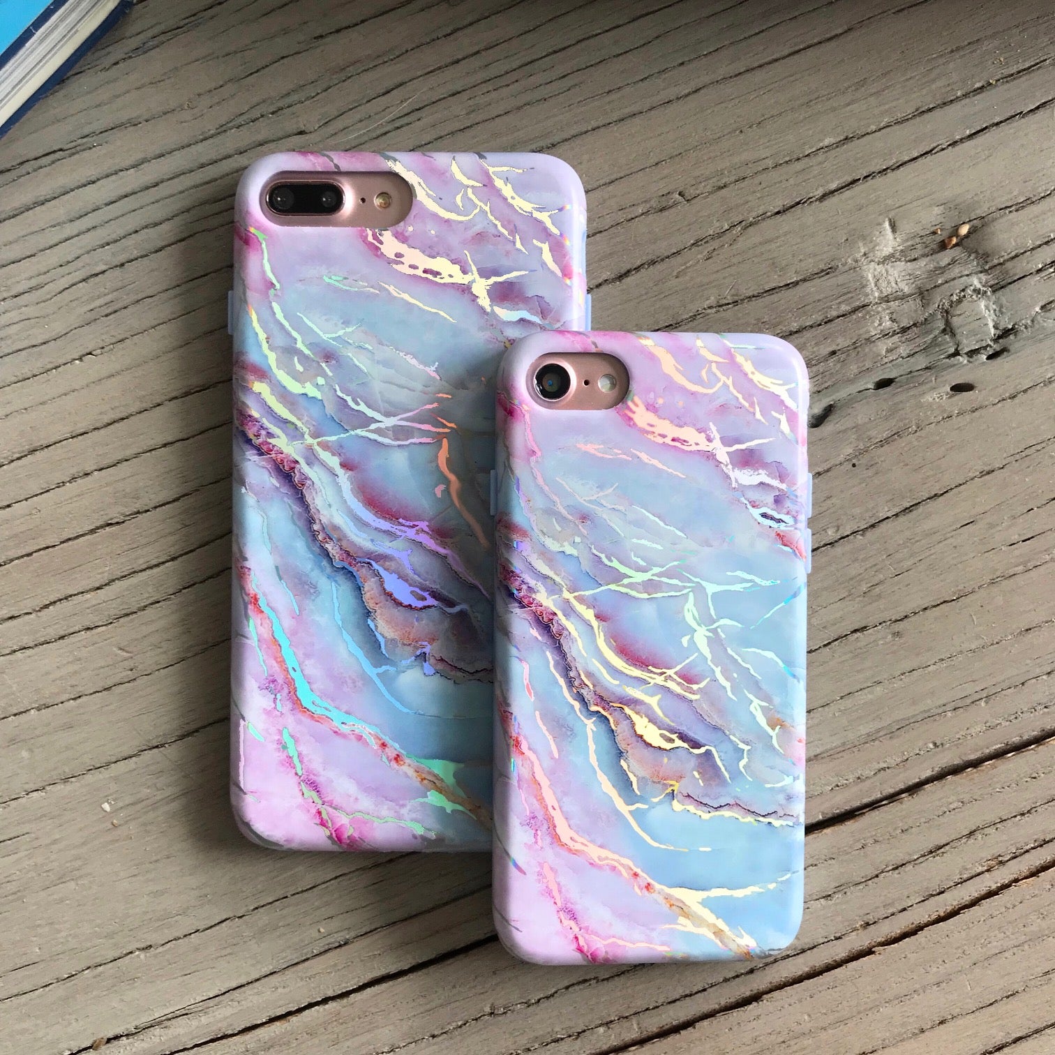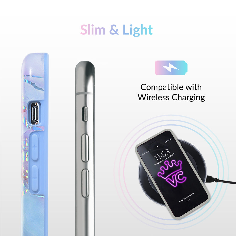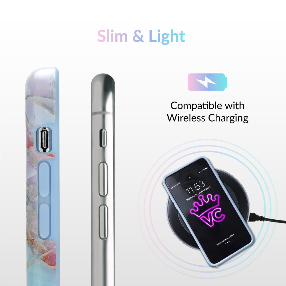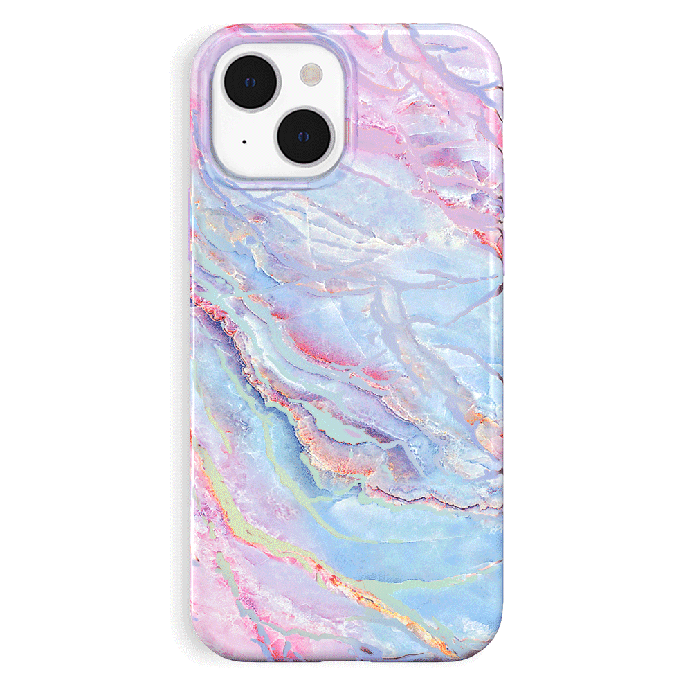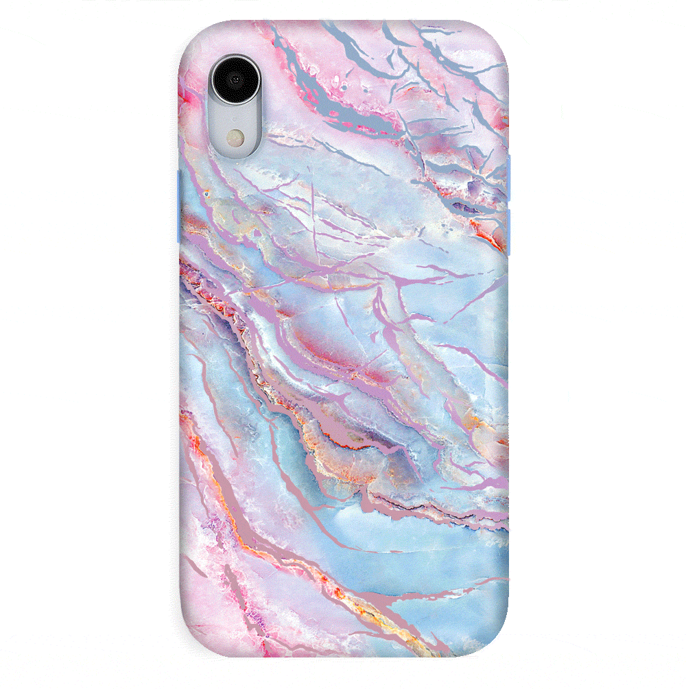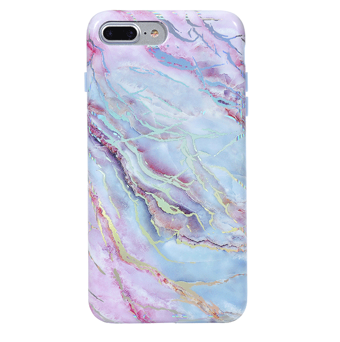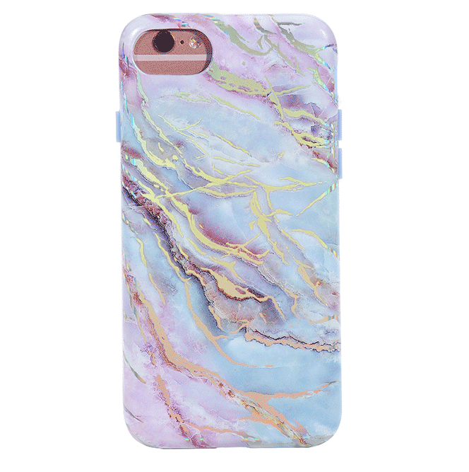 Protective print marble phone case composed of a gorgeous pastel blue and pink colored stone topped with delicate stone cracks filled with shiny holographic chrome! This case is completed in a matte finish and paired with a matching front blue bumper.