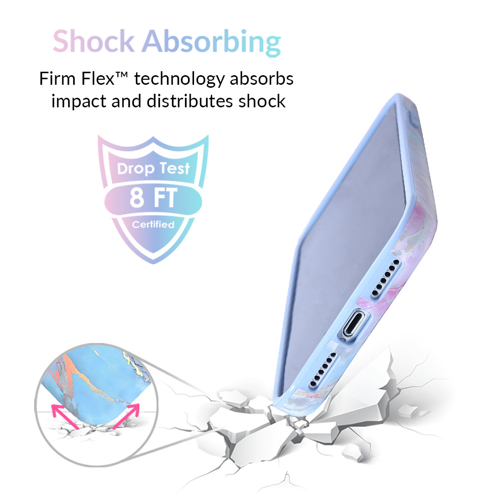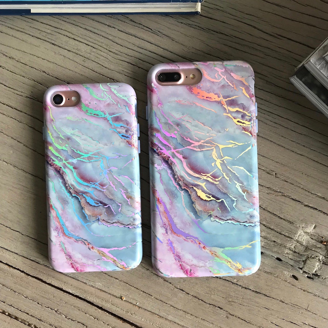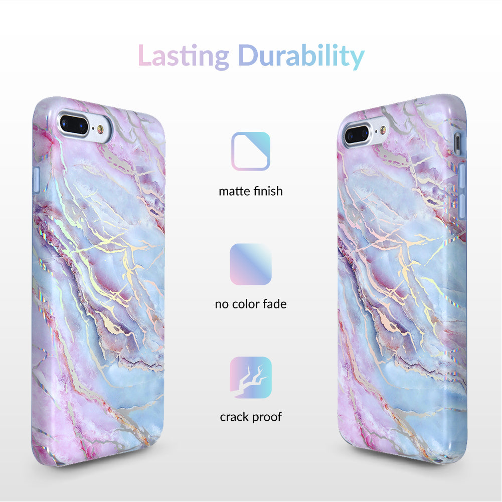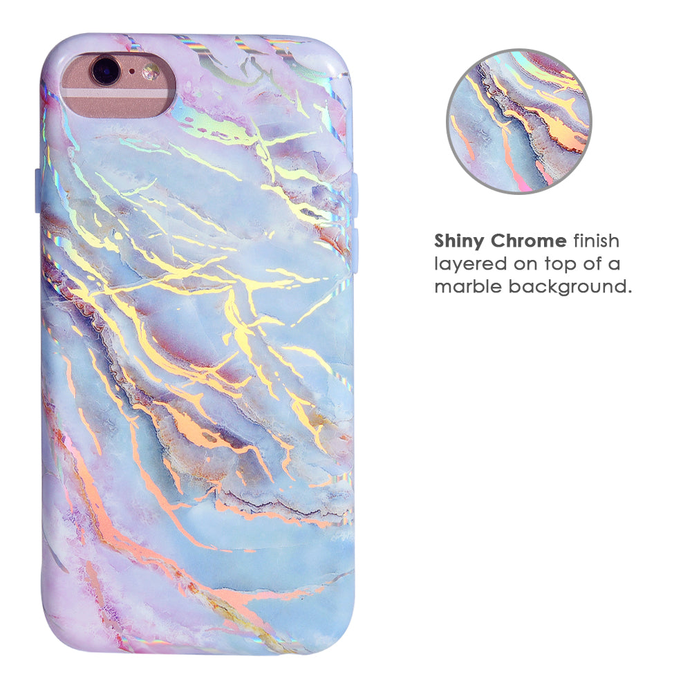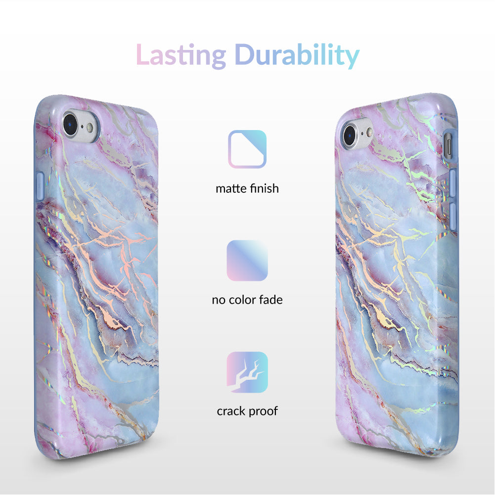 Protective print marble phone case composed of a gorgeous pastel blue and pink colored stone topped with delicate stone cracks filled with shiny holographic chrome! This case is completed in a matte finish and paired with a matching front blue bumper.