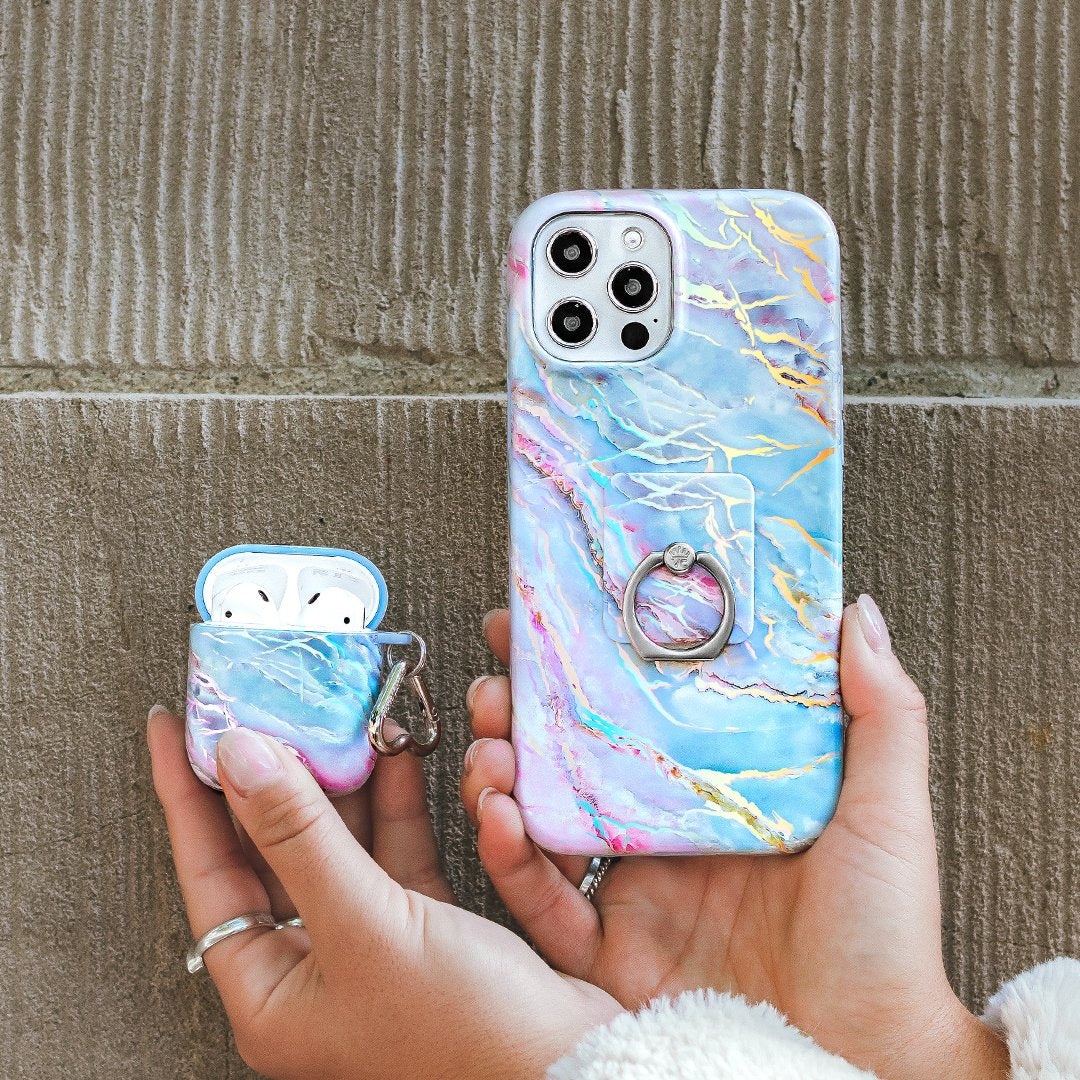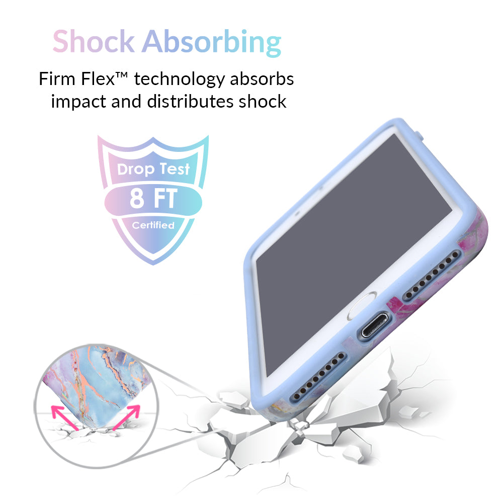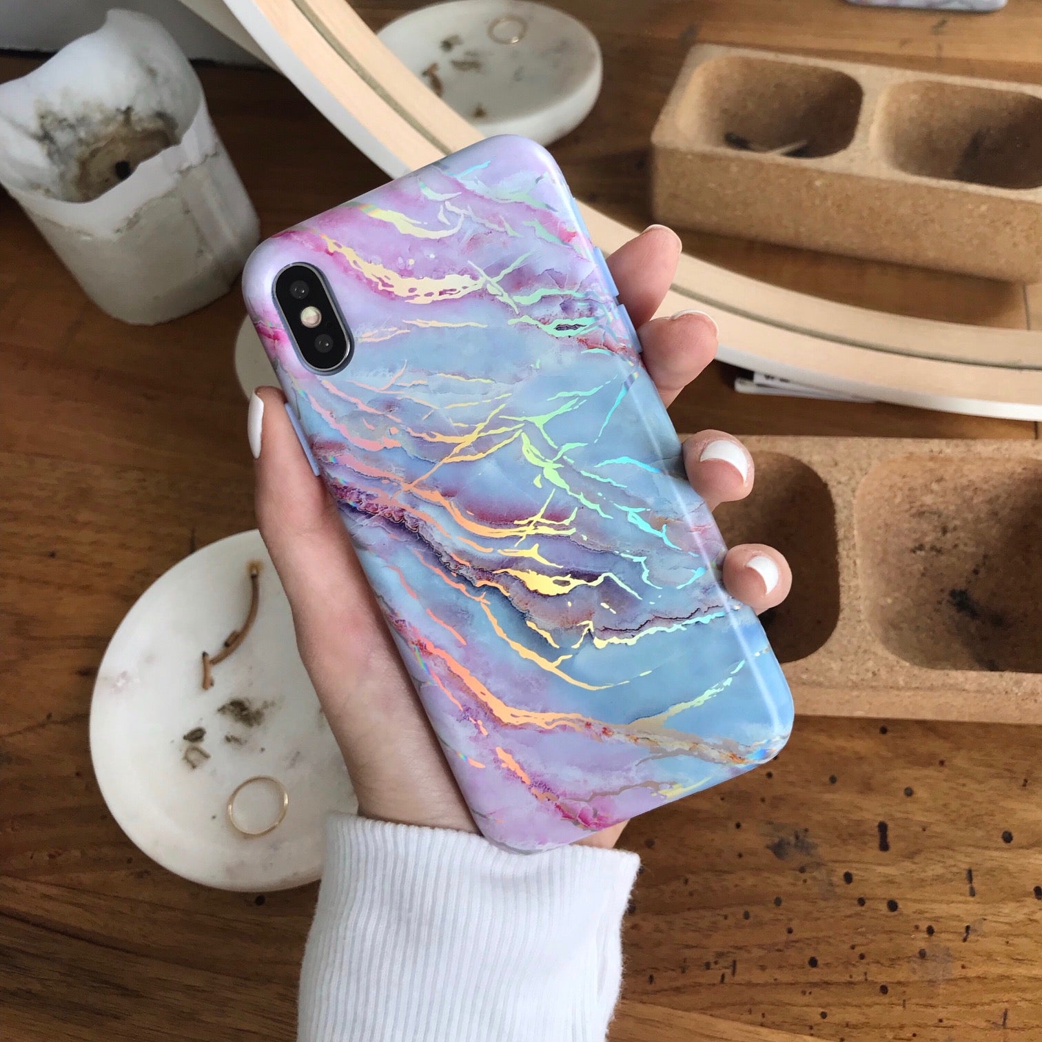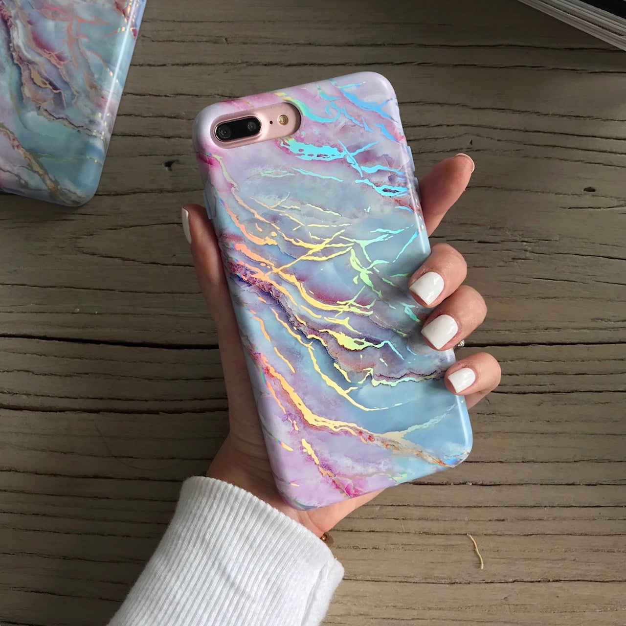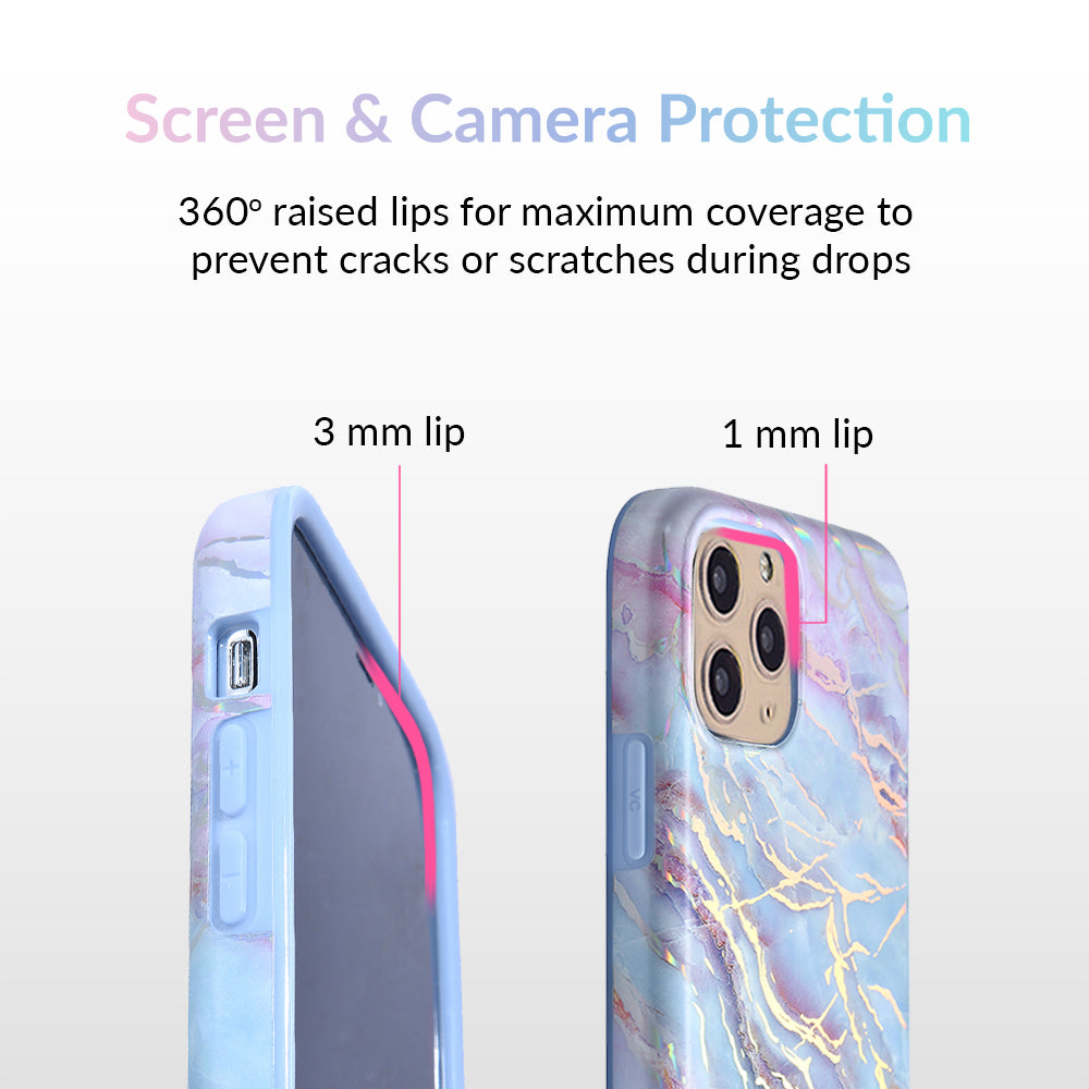 Protective print marble phone case composed of a gorgeous pastel blue and pink colored stone topped with delicate stone cracks filled with shiny holographic chrome! This case is completed in a matte finish and paired with a matching front blue bumper.