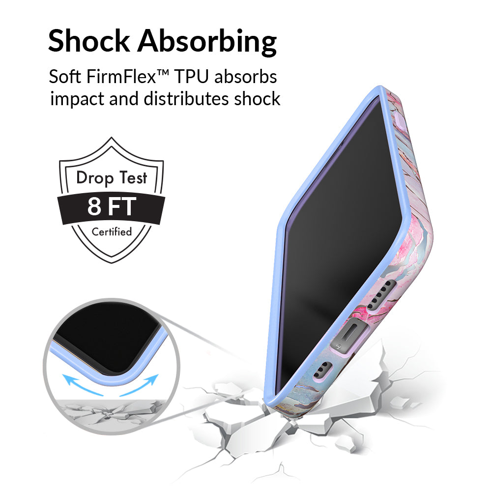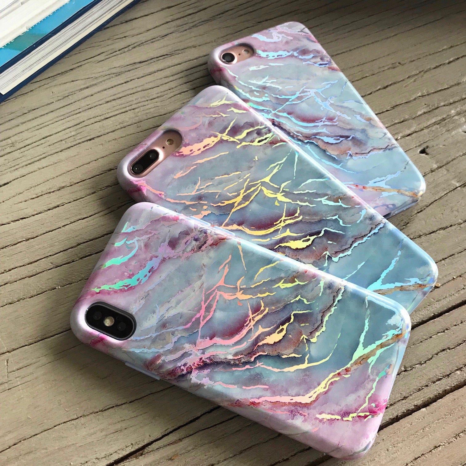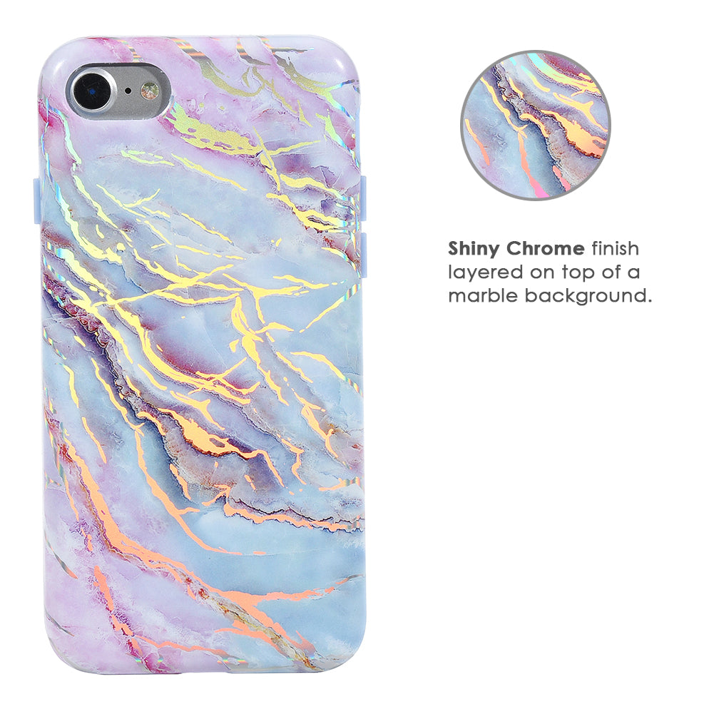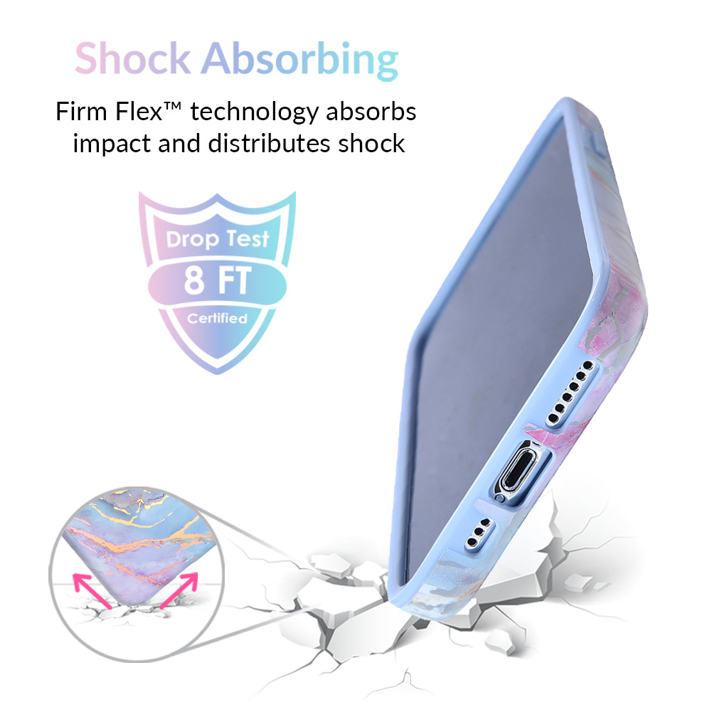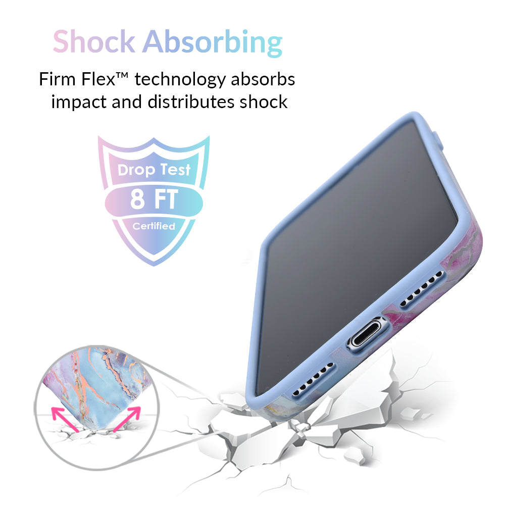 Protective print marble phone case composed of a gorgeous pastel blue and pink colored stone topped with delicate stone cracks filled with shiny holographic chrome! This case is completed in a matte finish and paired with a matching front blue bumper.