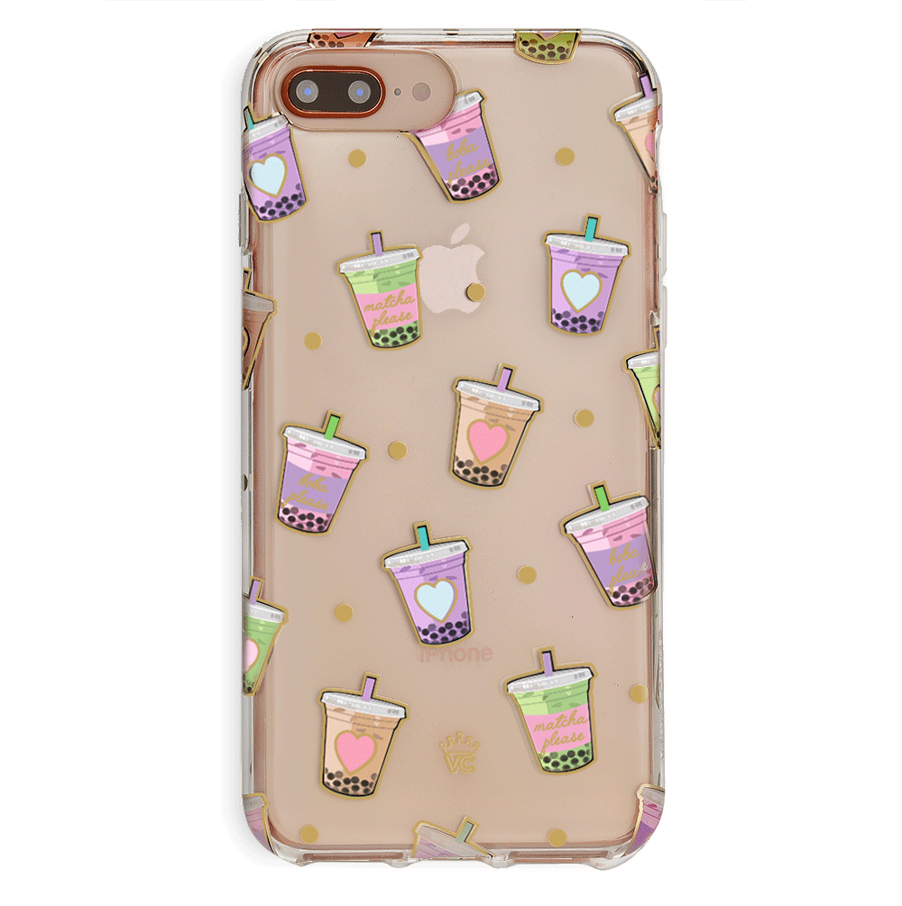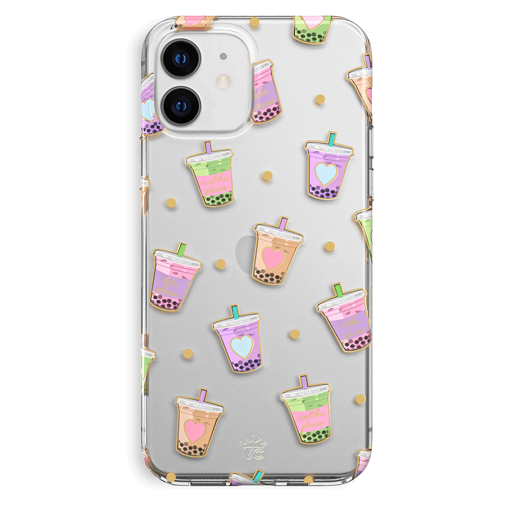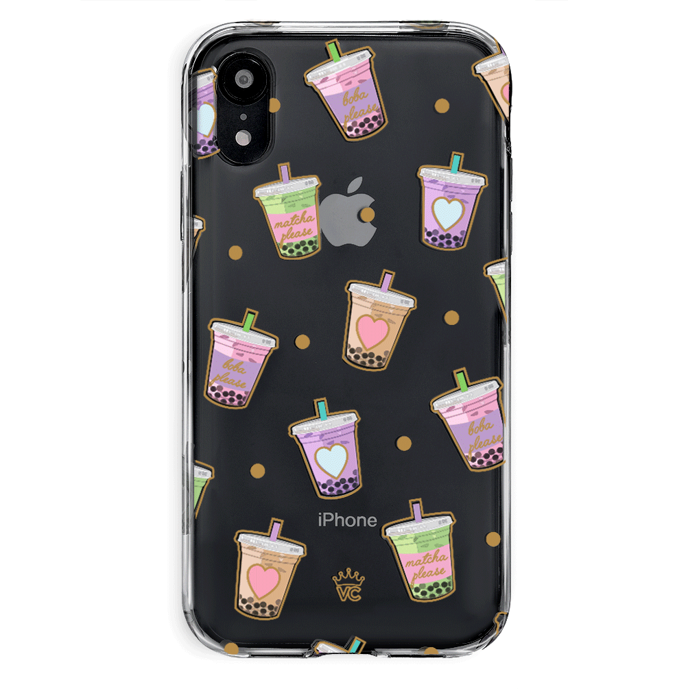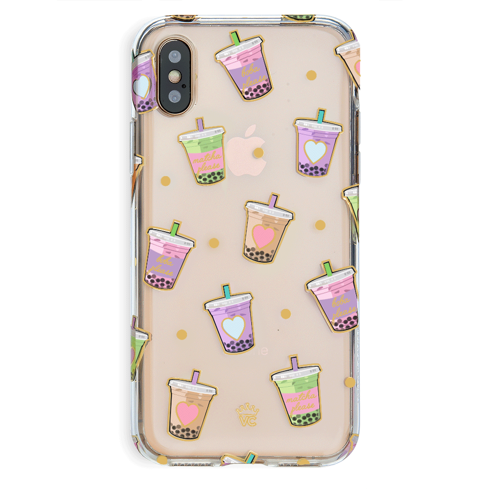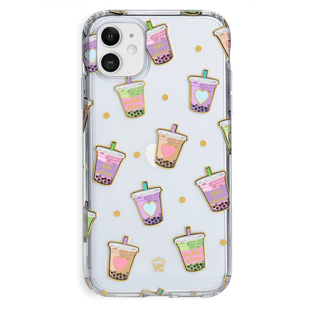 Nothing can bring you down when you’ve got cups of iced Matcha! This protective, clear case has a super cute Matcha pattern featuring iced Matcha, to-go cups, and boba pearls! It comes in a gloss finish, gold chrome outlines, and a matching clear bumper for added protection against drops.